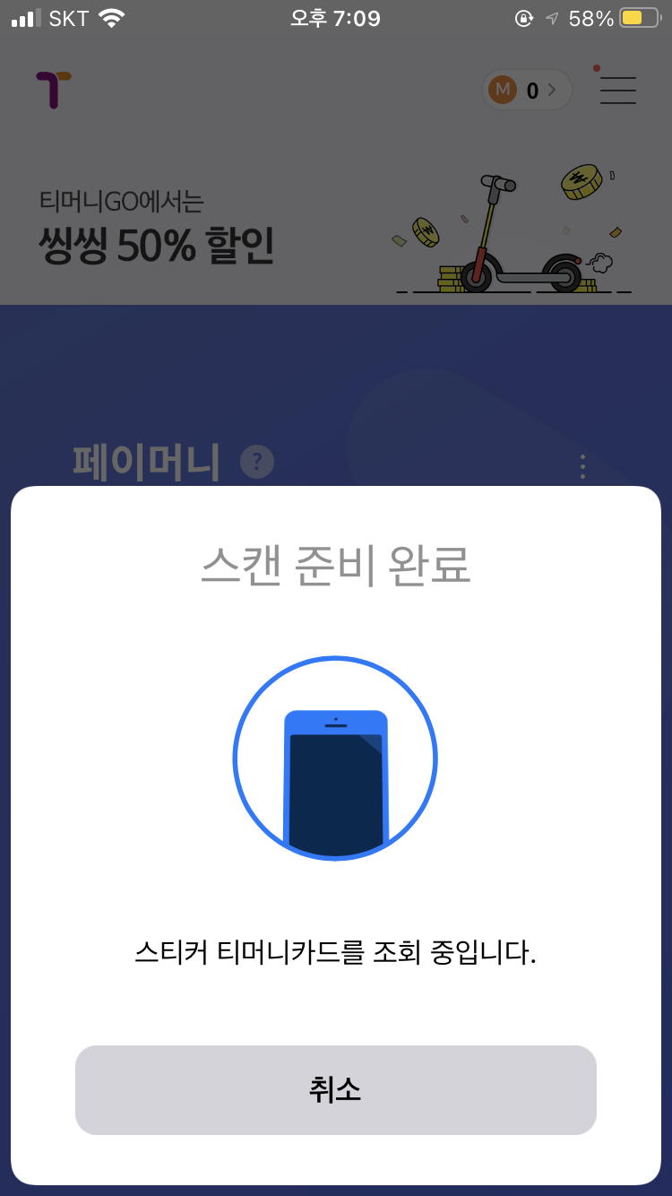 티머니페이 앱에서 스티커형 티머니 등록을 시도하면
