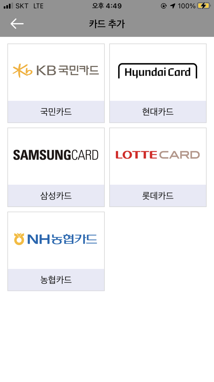 현재는 국민카드, 현대카드, 삼성카드, 롯데카드, 농협카드(농협BC 제외)만 등록이 가능한데