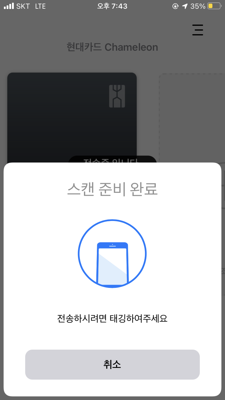여기서 결제하기 버튼을 누르면 NFC 스캔 준비 완료 메뉴가 뜨고