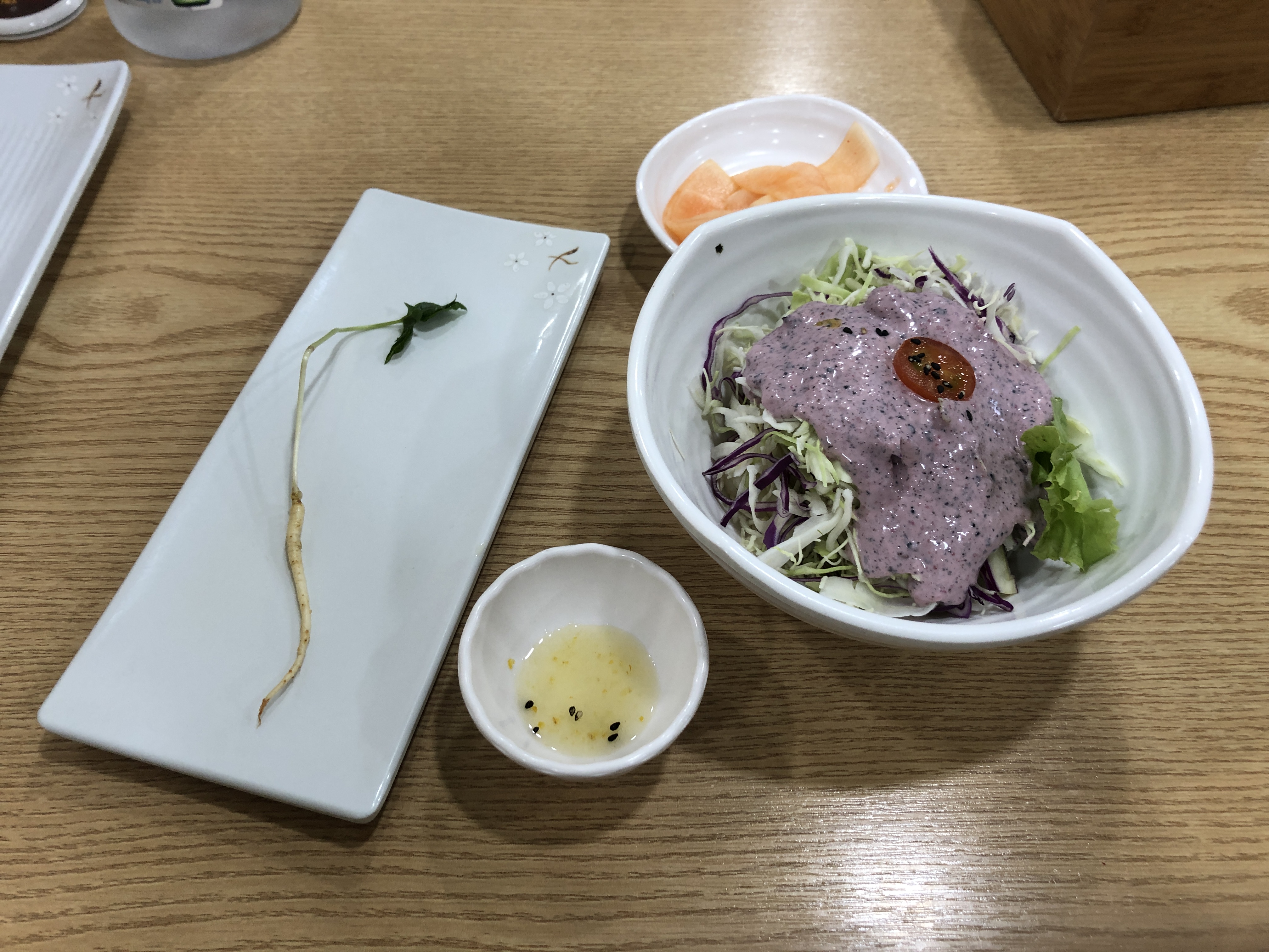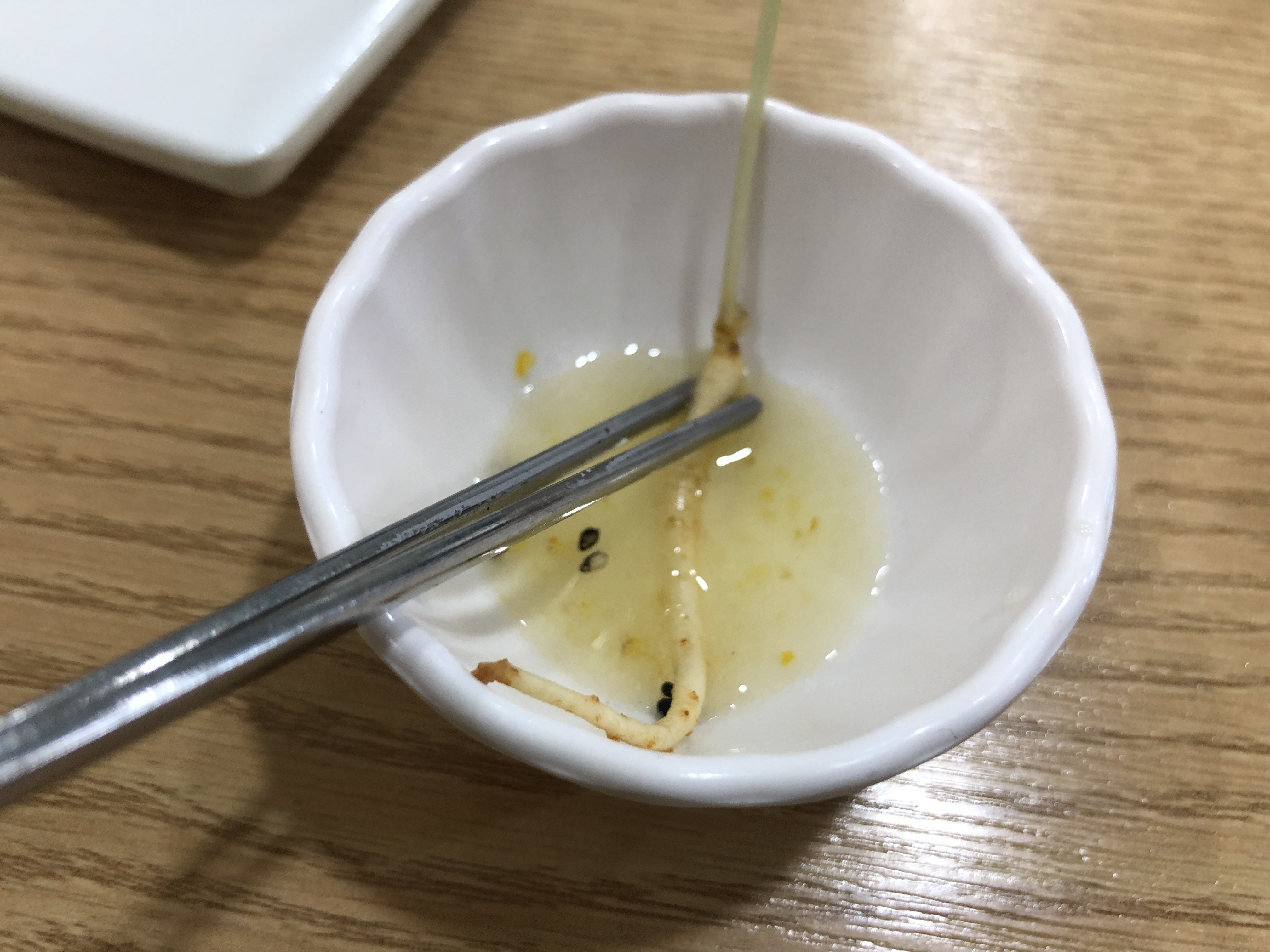 차가운 냉면을 먹기 전에 몸을 덥히라고 준다는 작은 새싹삼을 받고