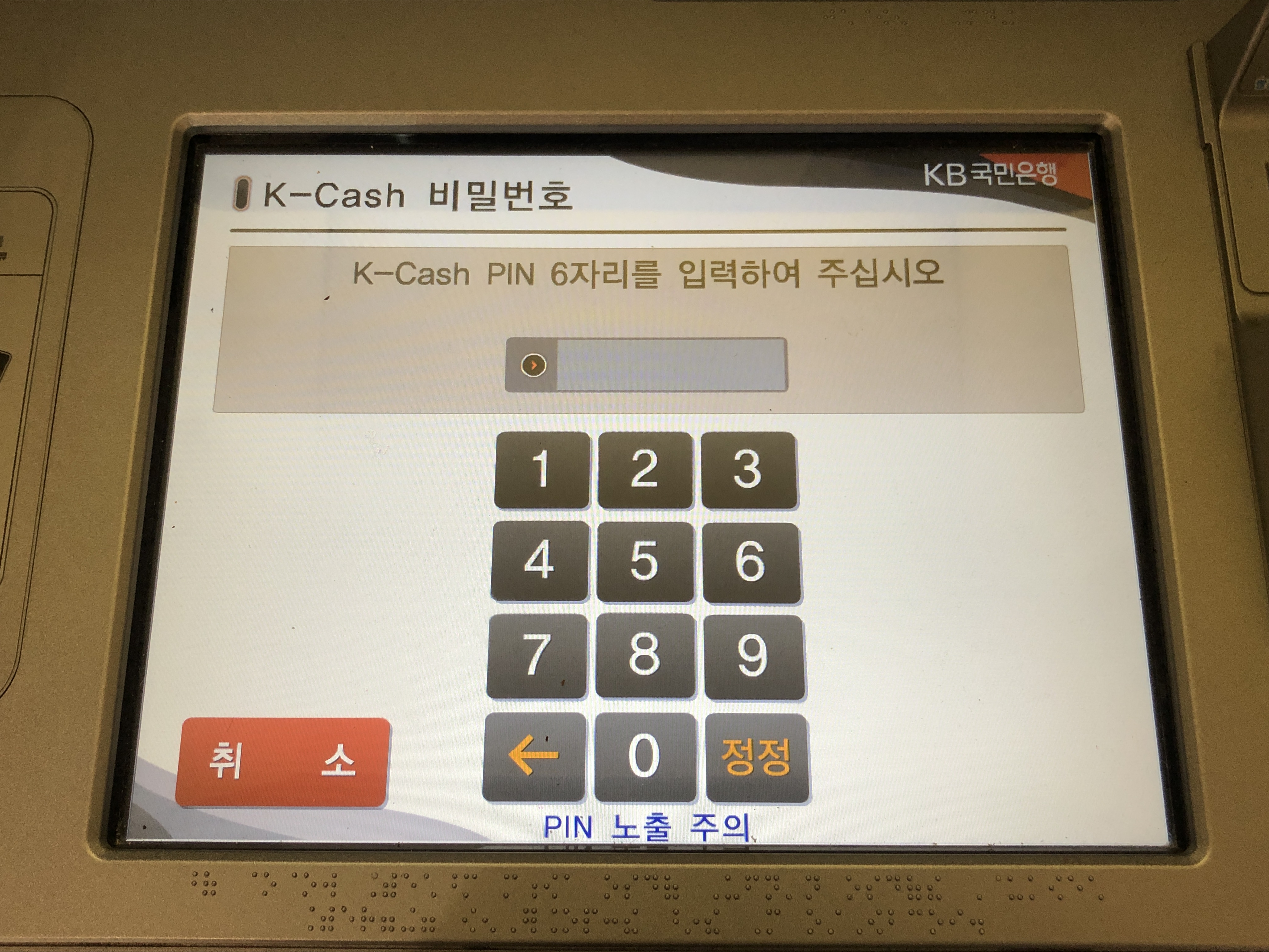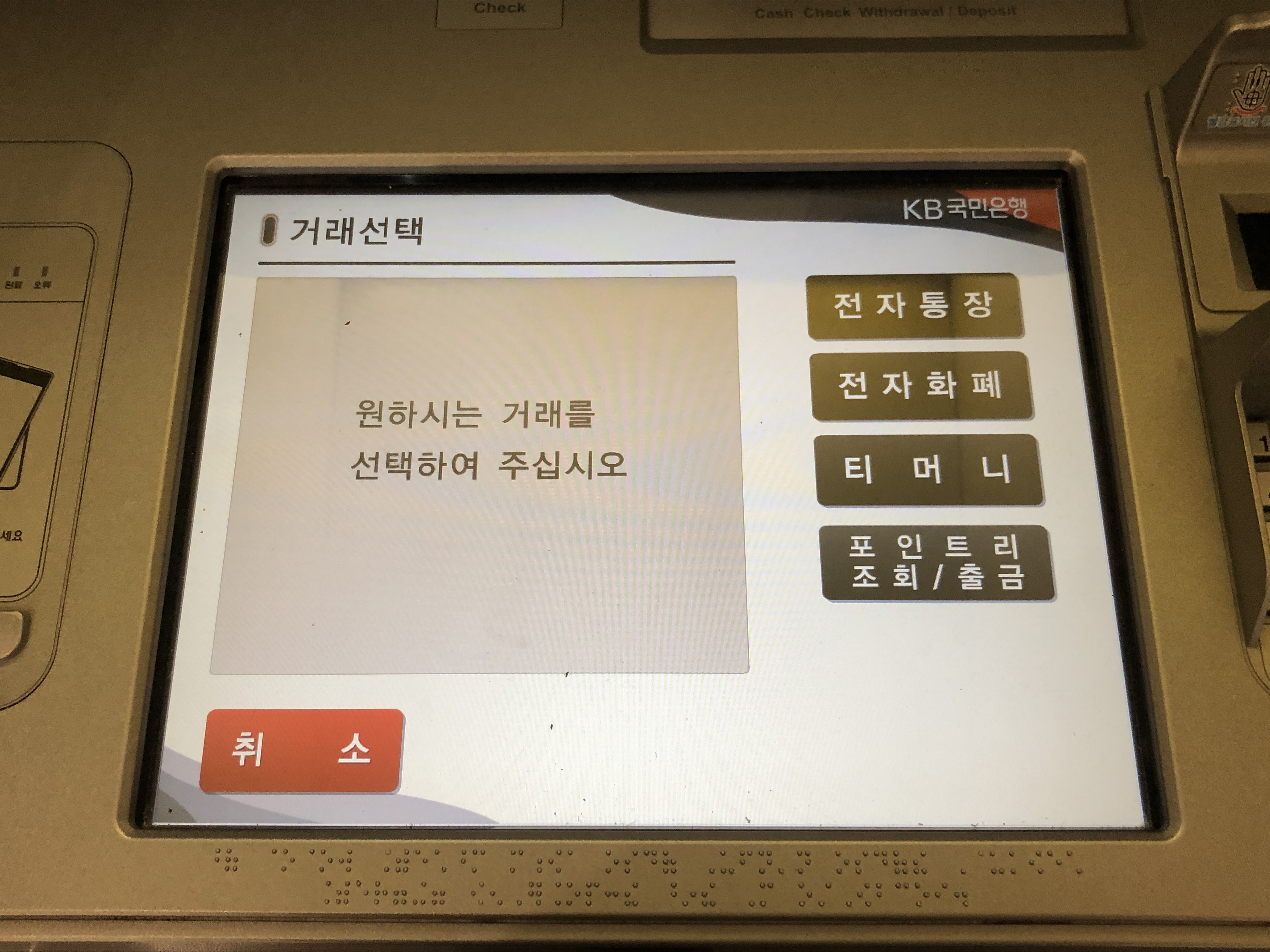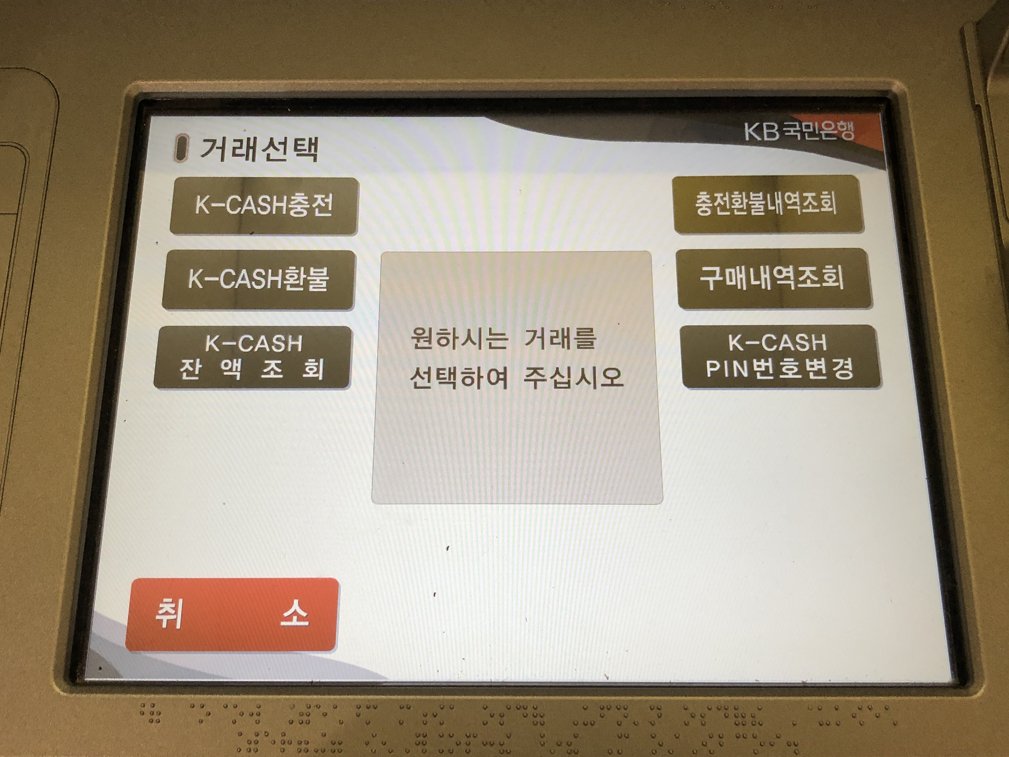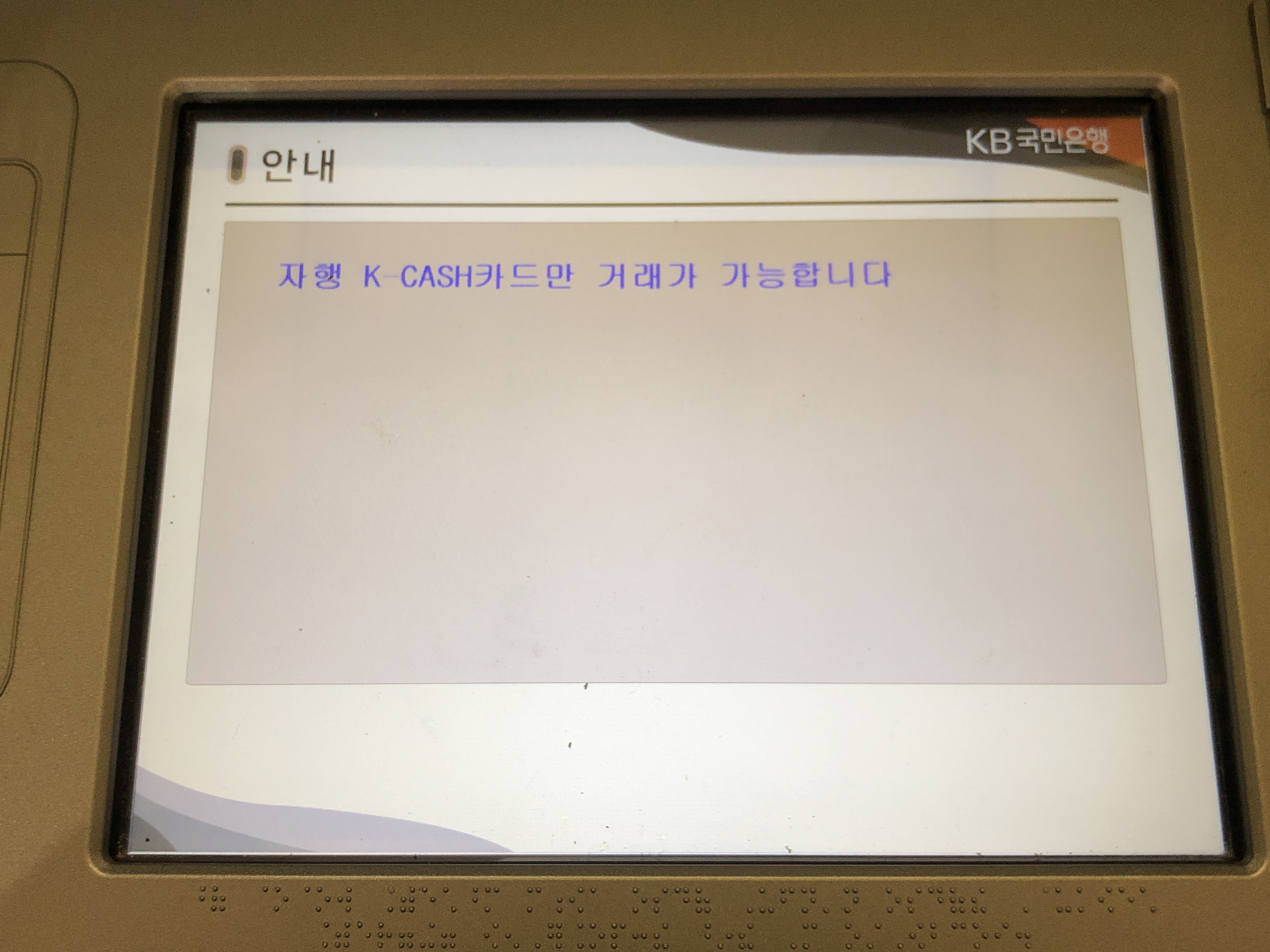 국민은행 ATM기에서는 국민은행에서 발행한 케이캐시 카드만 거래가 가능하네요.