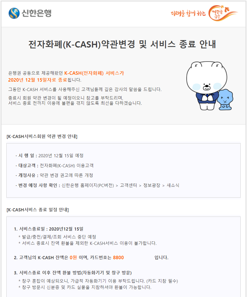 내가 만들었는지조차 잊고 있던 전자화폐인 K-CASH가 서비스를 종료한다는 안내 메일이네요.