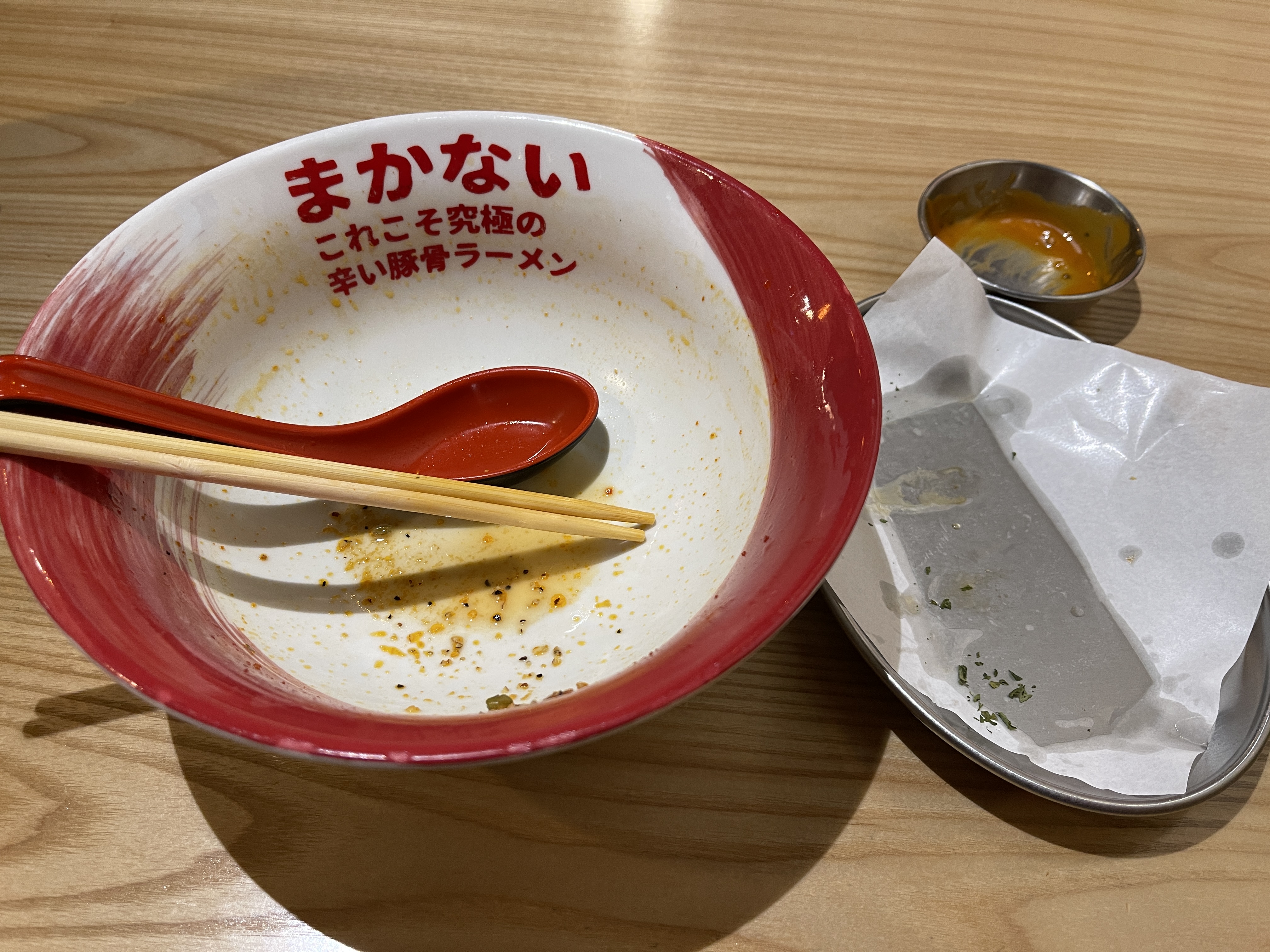 조금 기다려 매운 돈코츠라멘과 닭껍질교자를 받았는데