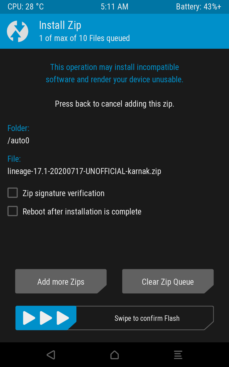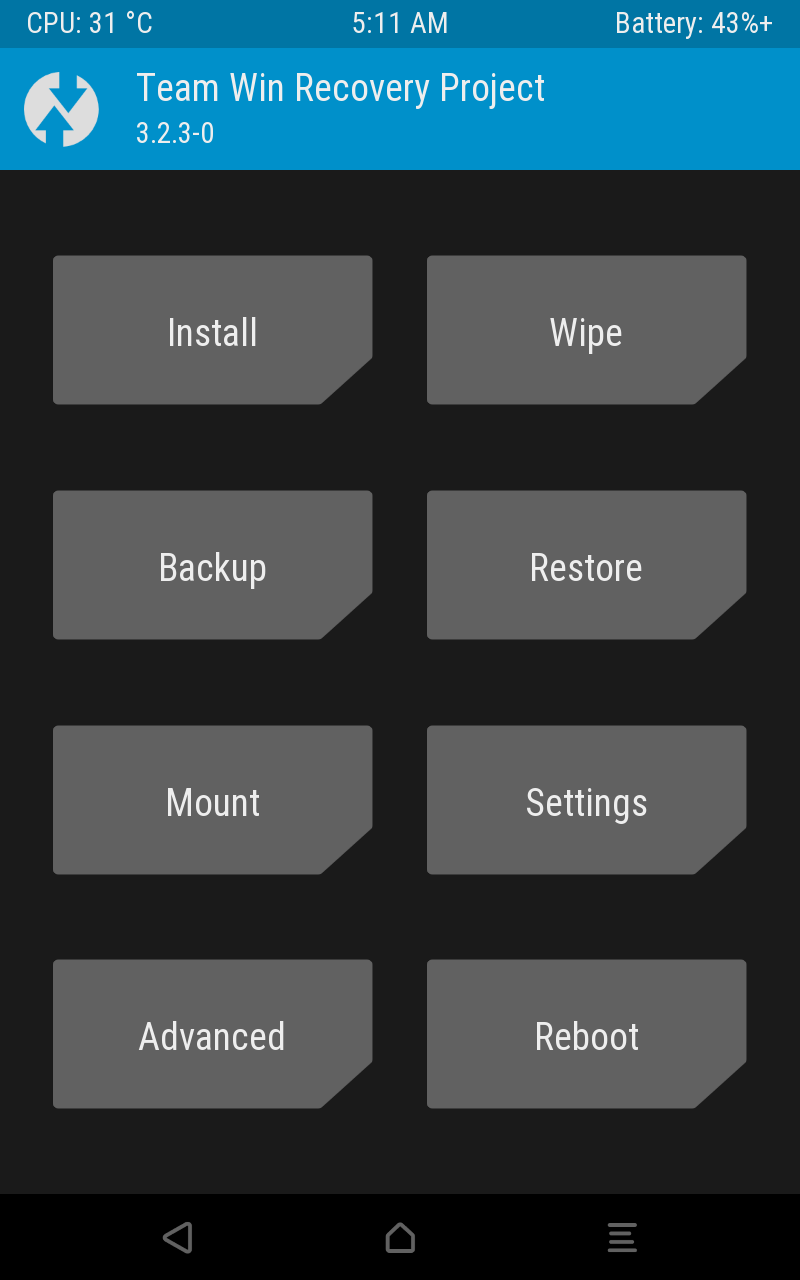 전원 버튼과 볼륨 다운 버튼을 길게 눌러 TWRP를 실행한 뒤 기존 시스템을 지우고