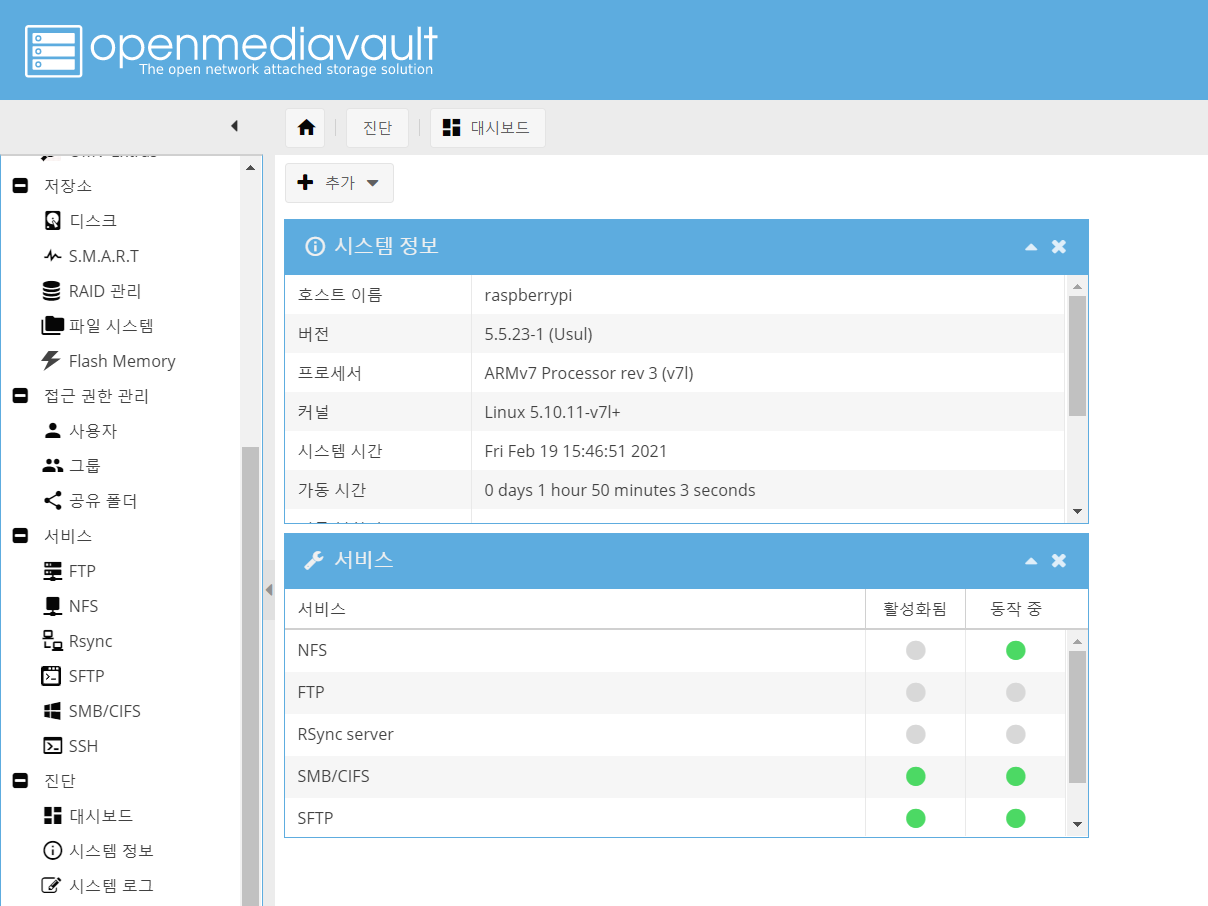 OMV5 웹 콘솔에 접속해 기본적인 시스템 설정과 SSH, SFTP, SMB 설정을 마쳤습니다.
