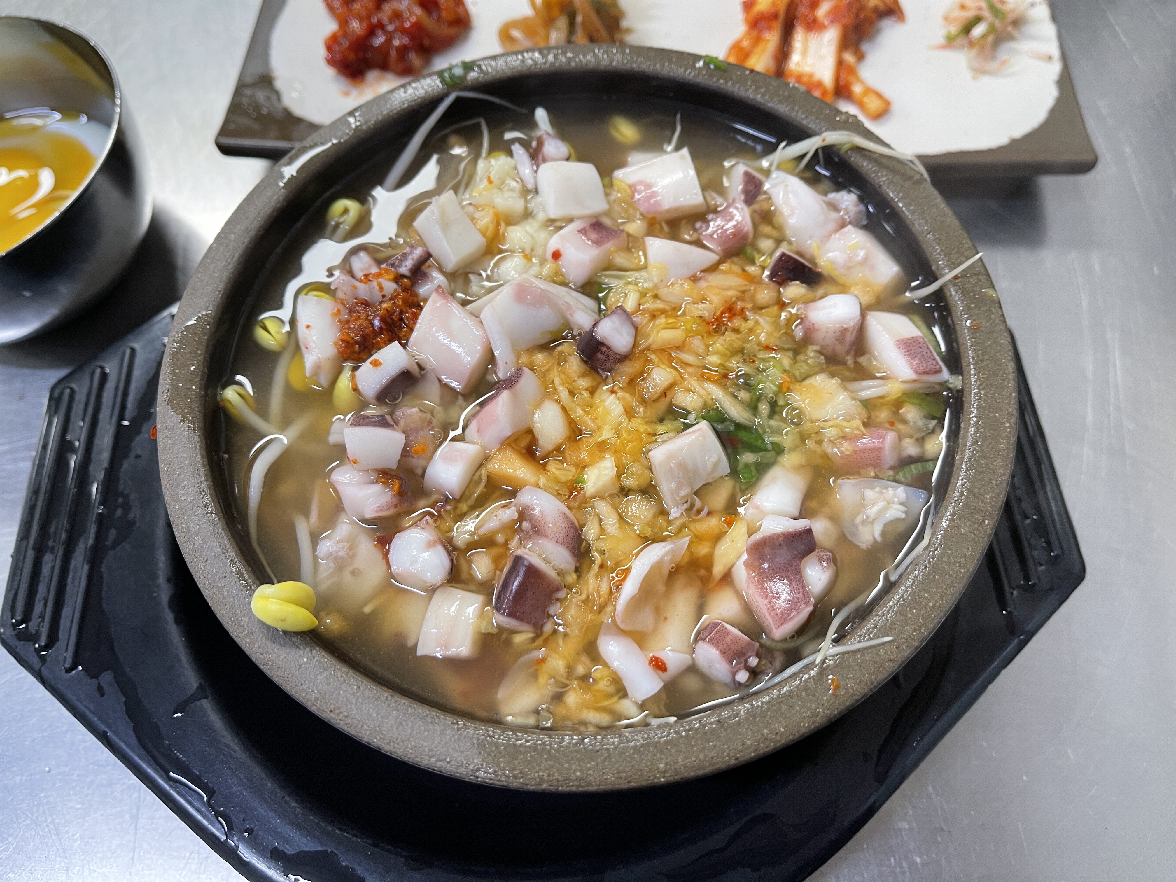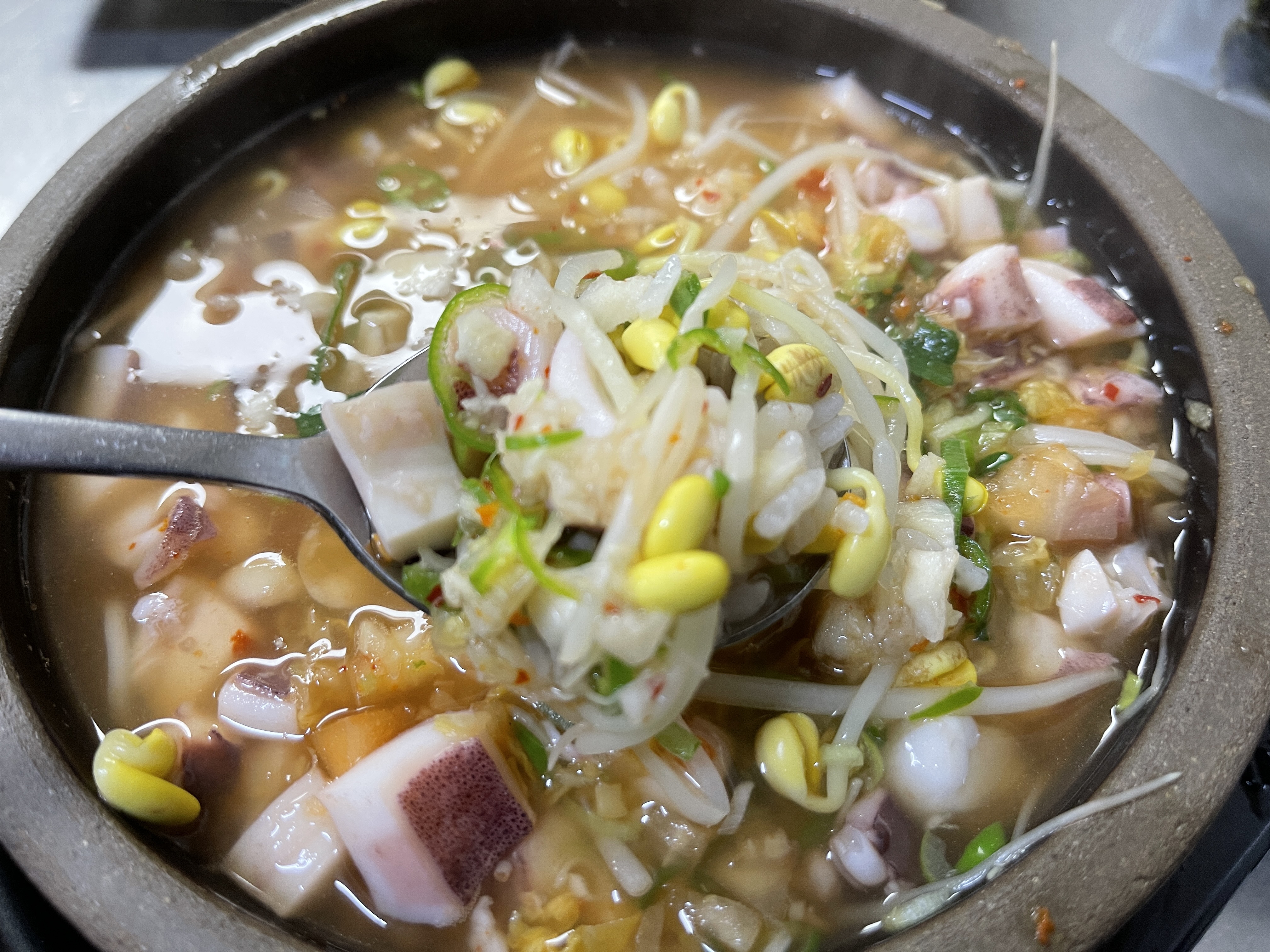 오징어를 듬뿍 담아준 콩나물국밥에 숟가락을 넣어