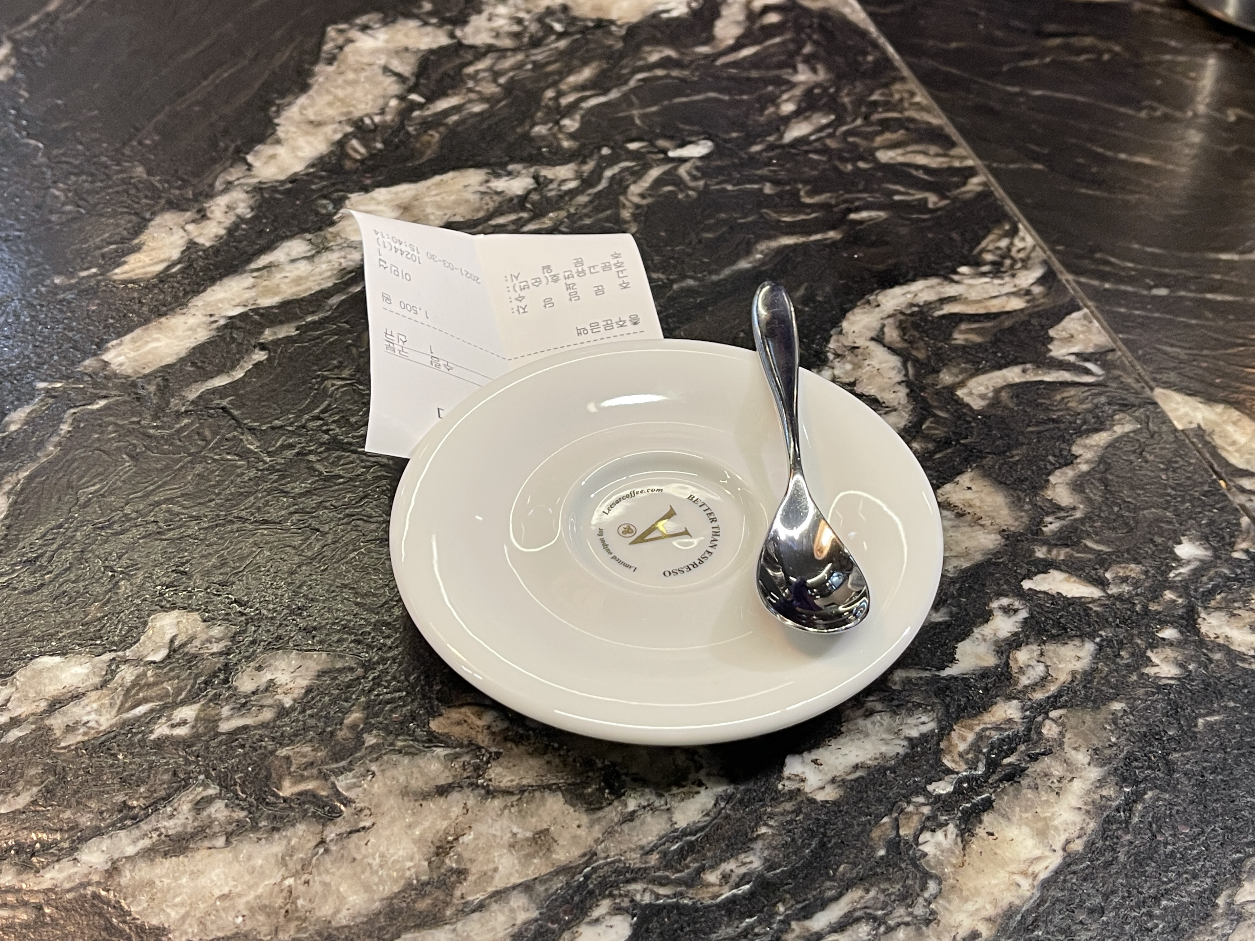 계산대에서 영수증을 받아 바에 내면 제 앞에 커피잔과 스푼을 세팅합니다.