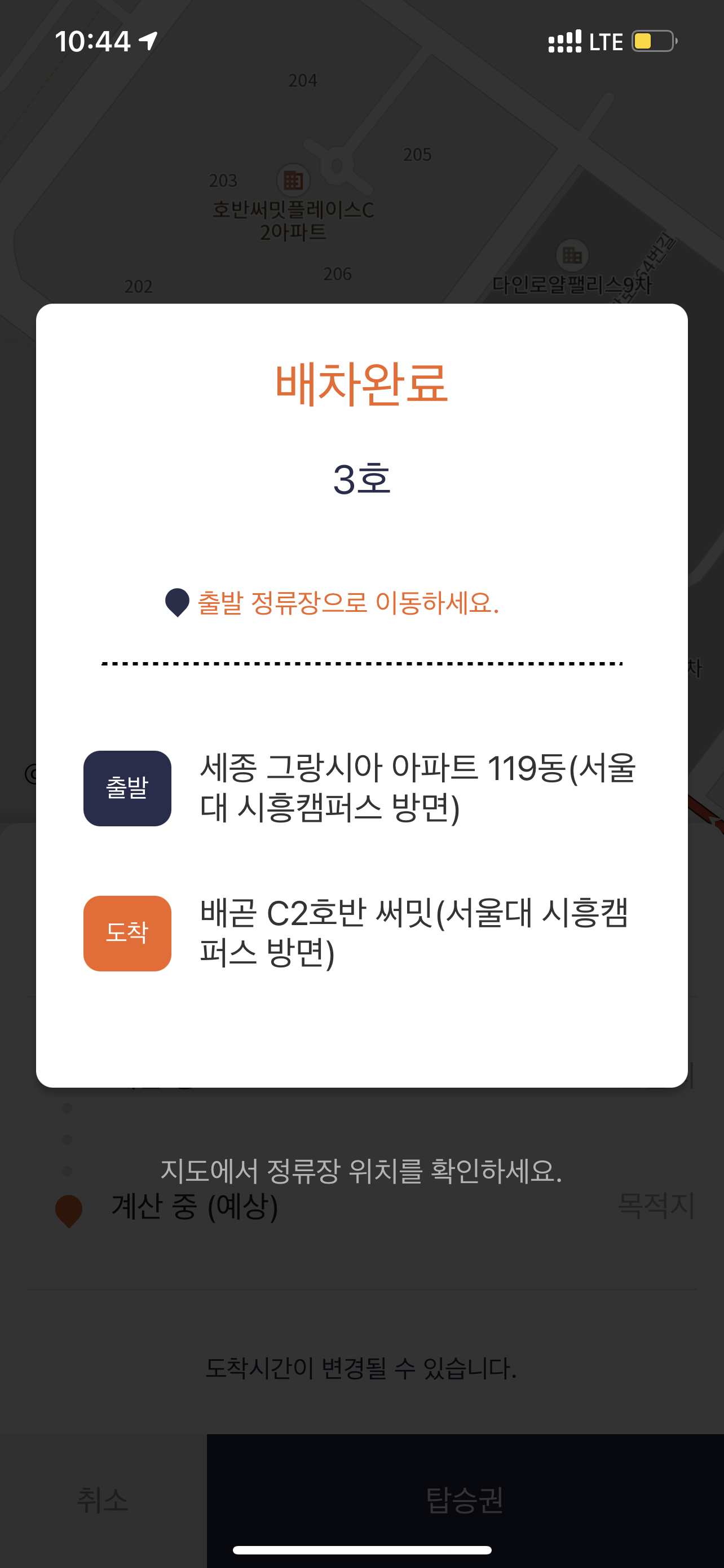 앱에는 배차완료 화면이 뜹니다.