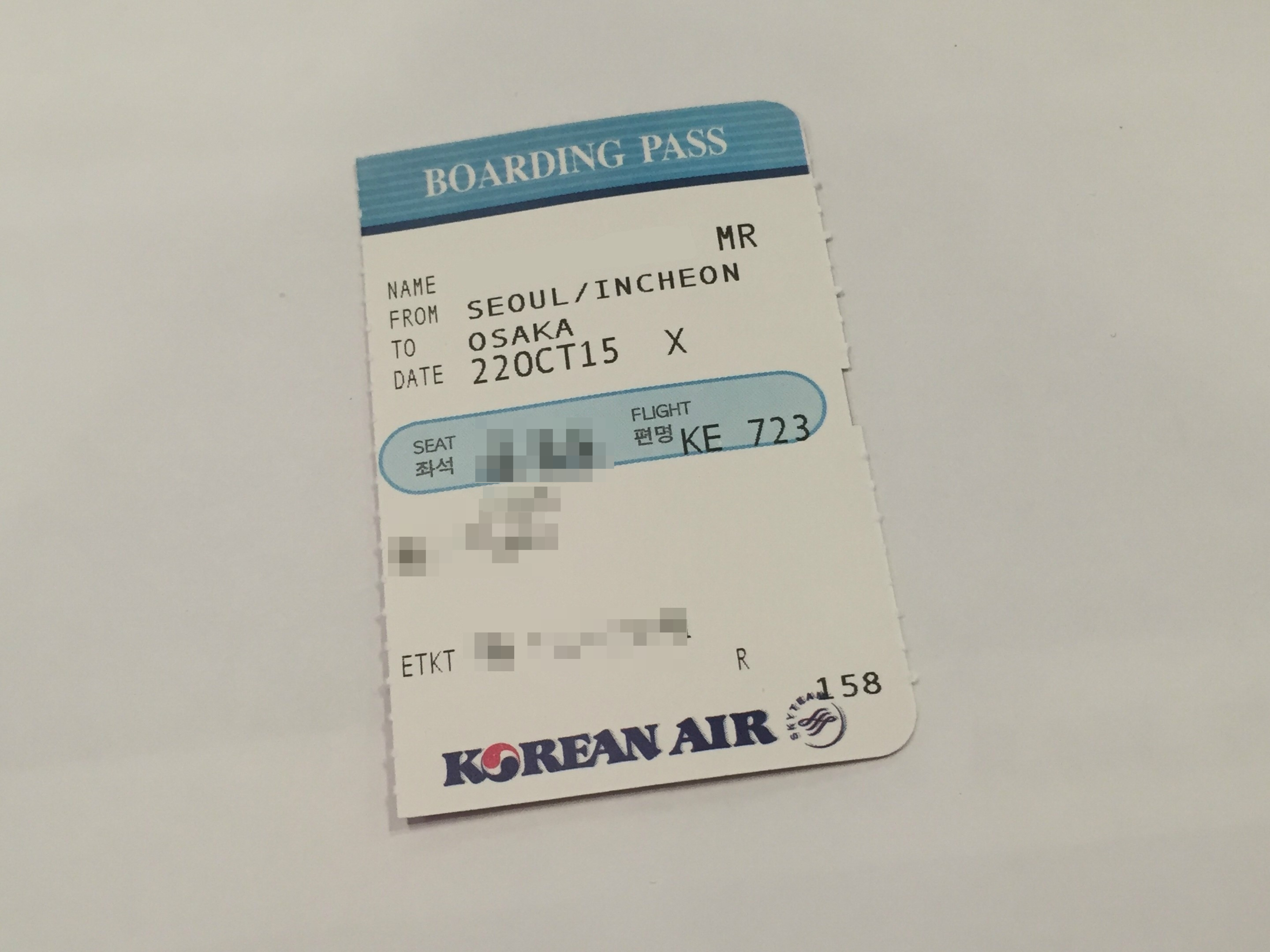 인천을 출발해 오사카 칸사이 공항으로 향하는 KE723편 보딩패스입니다.