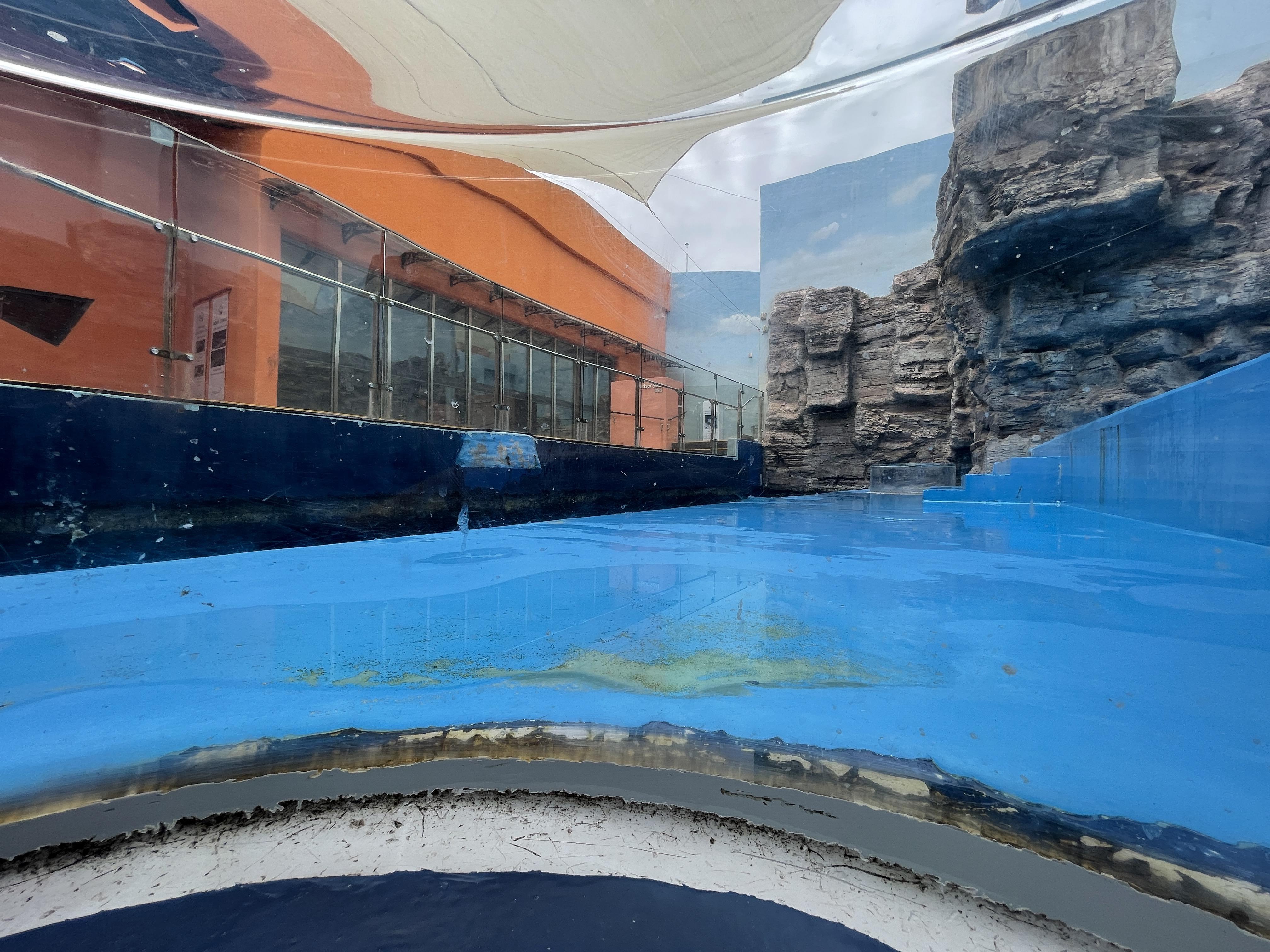 장난감에 홀려 몸을 열심히 움직이는 남아메리카 바다사자 수조 근처에는