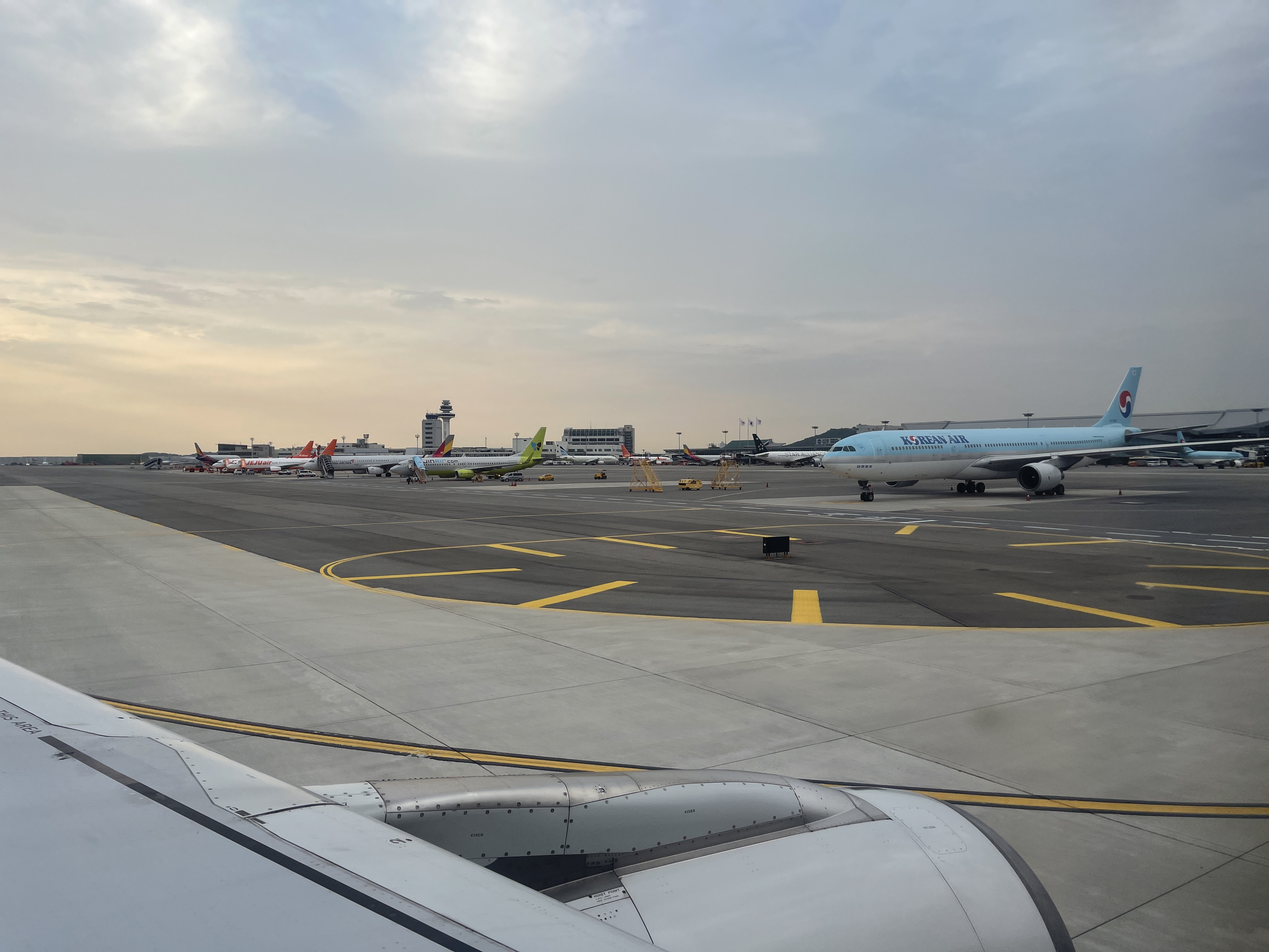 잠에서 깨서 밖을 보니 어느새 영종도 인천공항 옆을 날고 있네요.