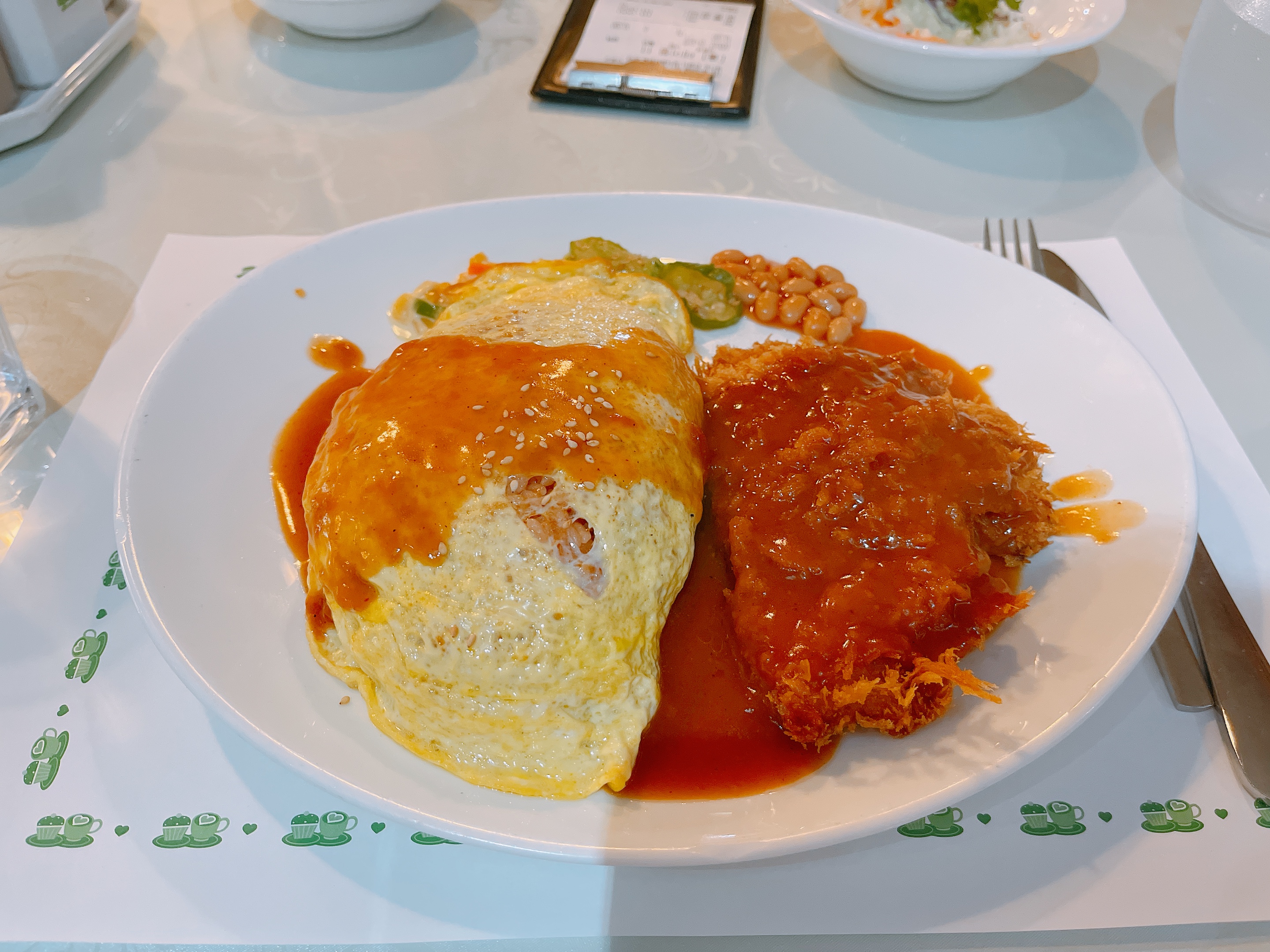 절반은 오므라이스로, 나머지 절반은 돈가스로 채운 접시가 나왔습니다.