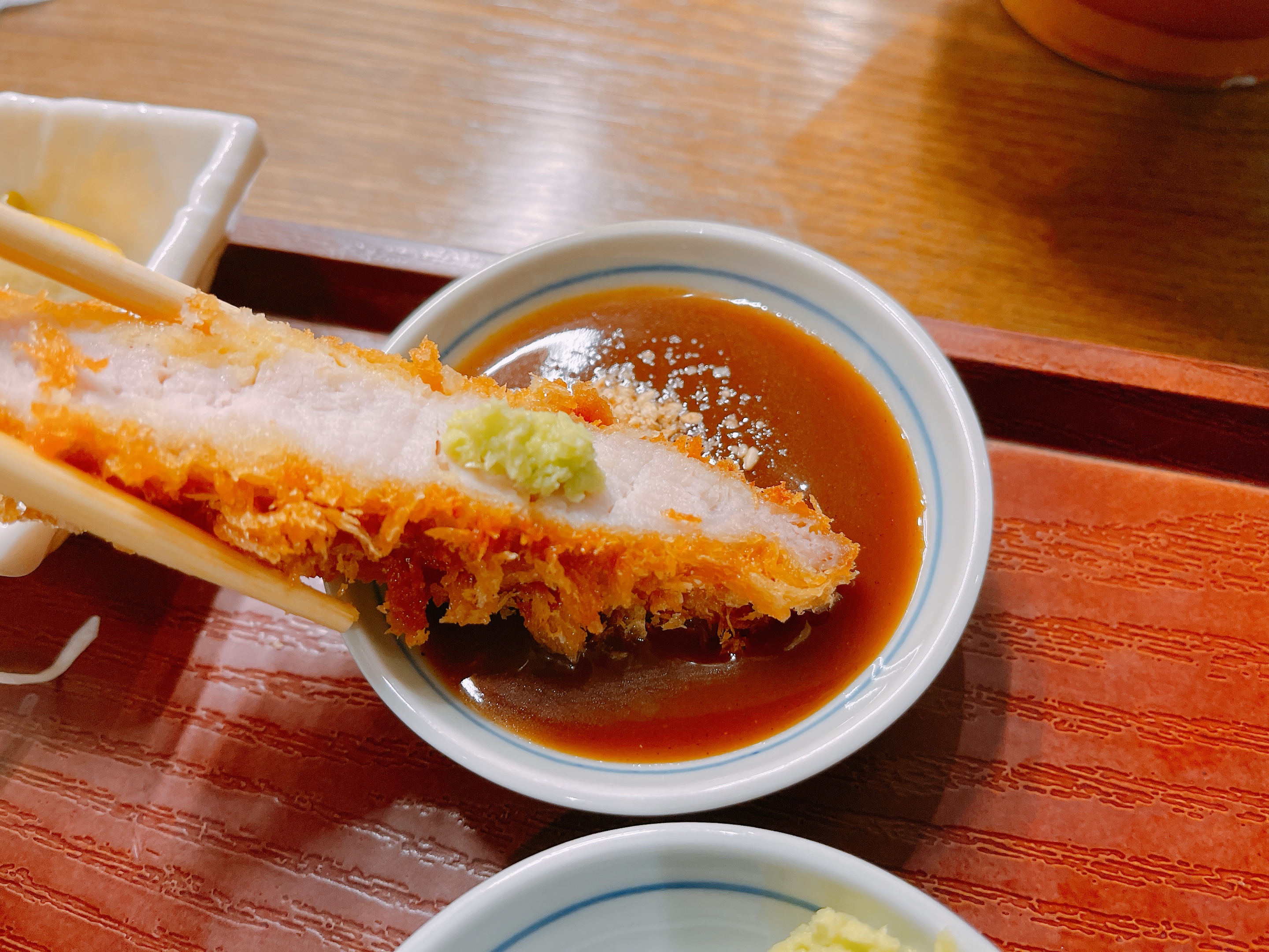 두툼하게 튀겨 썬 돈가스 위에 와사비를 얹은 뒤