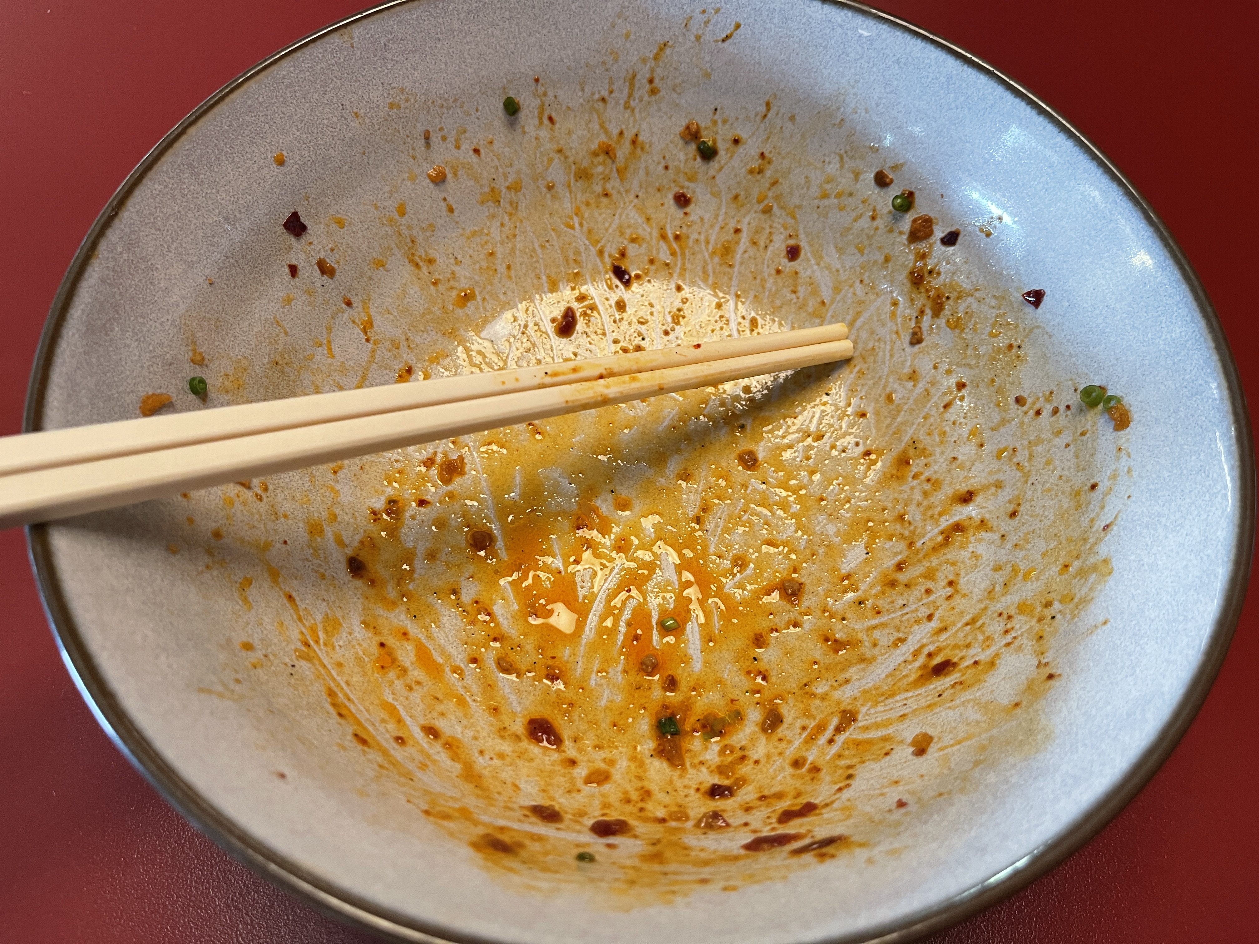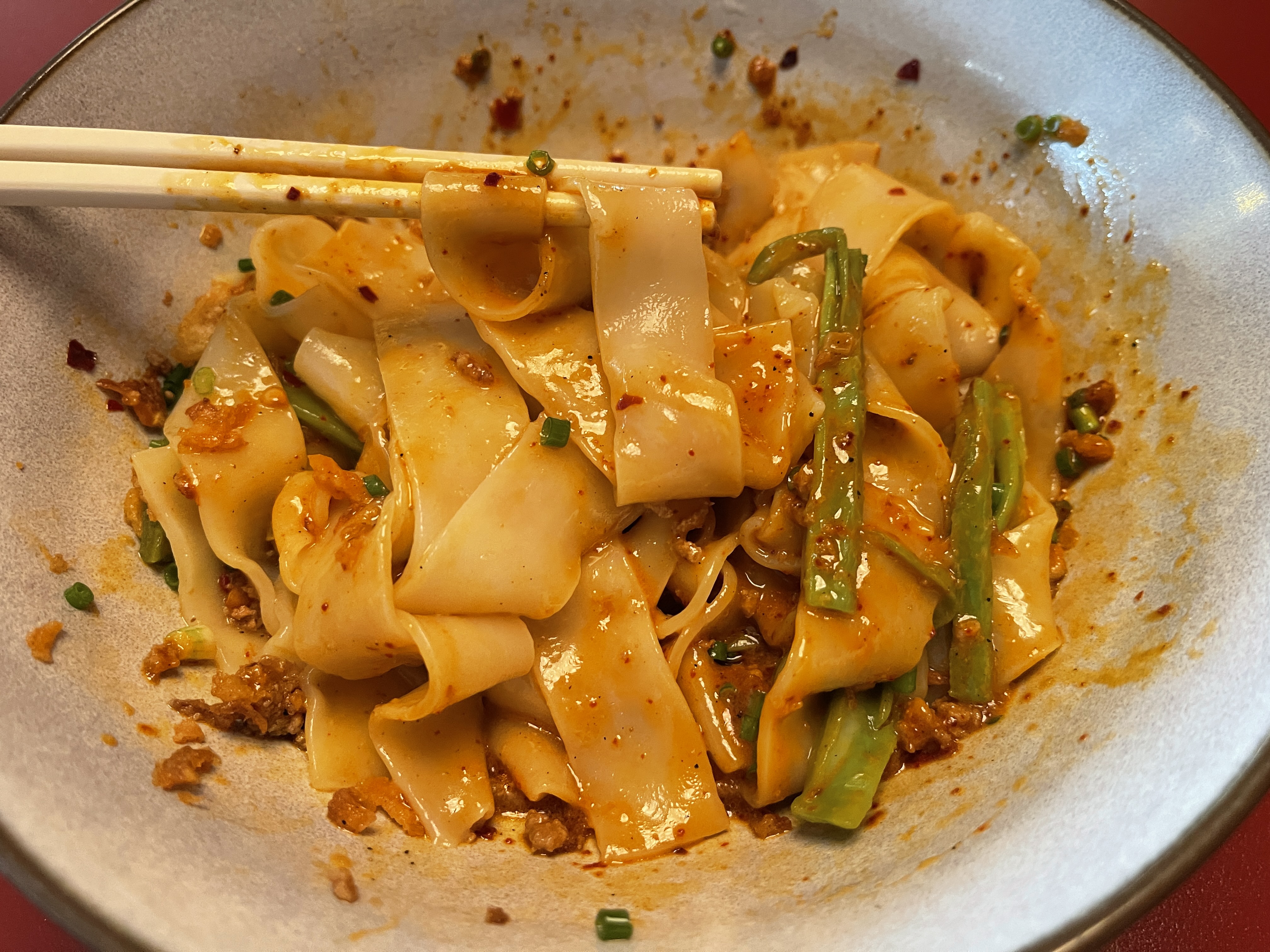 납작한 면을 마라 소스에 잘 비벼놓으니 제법 먹음직스러운 빨간 빛깔을 띕니다.