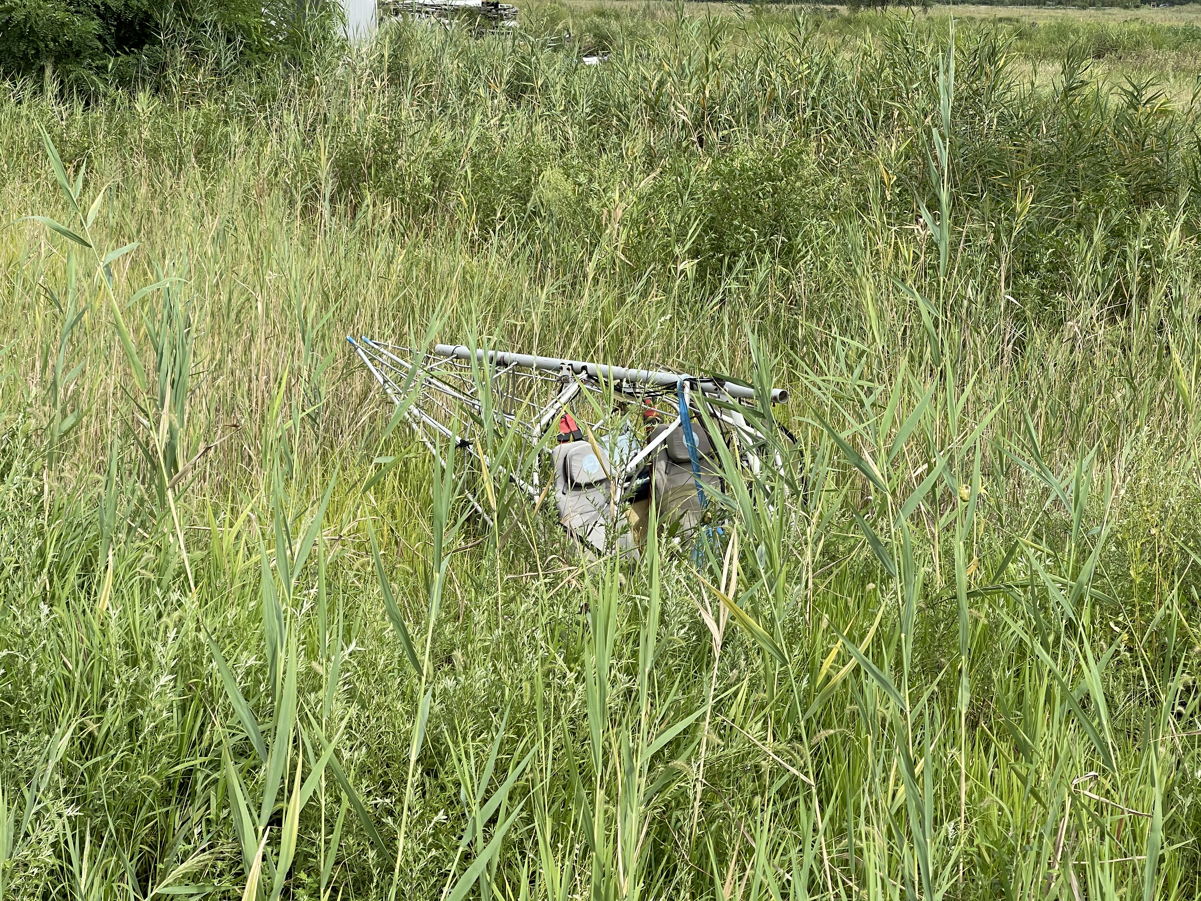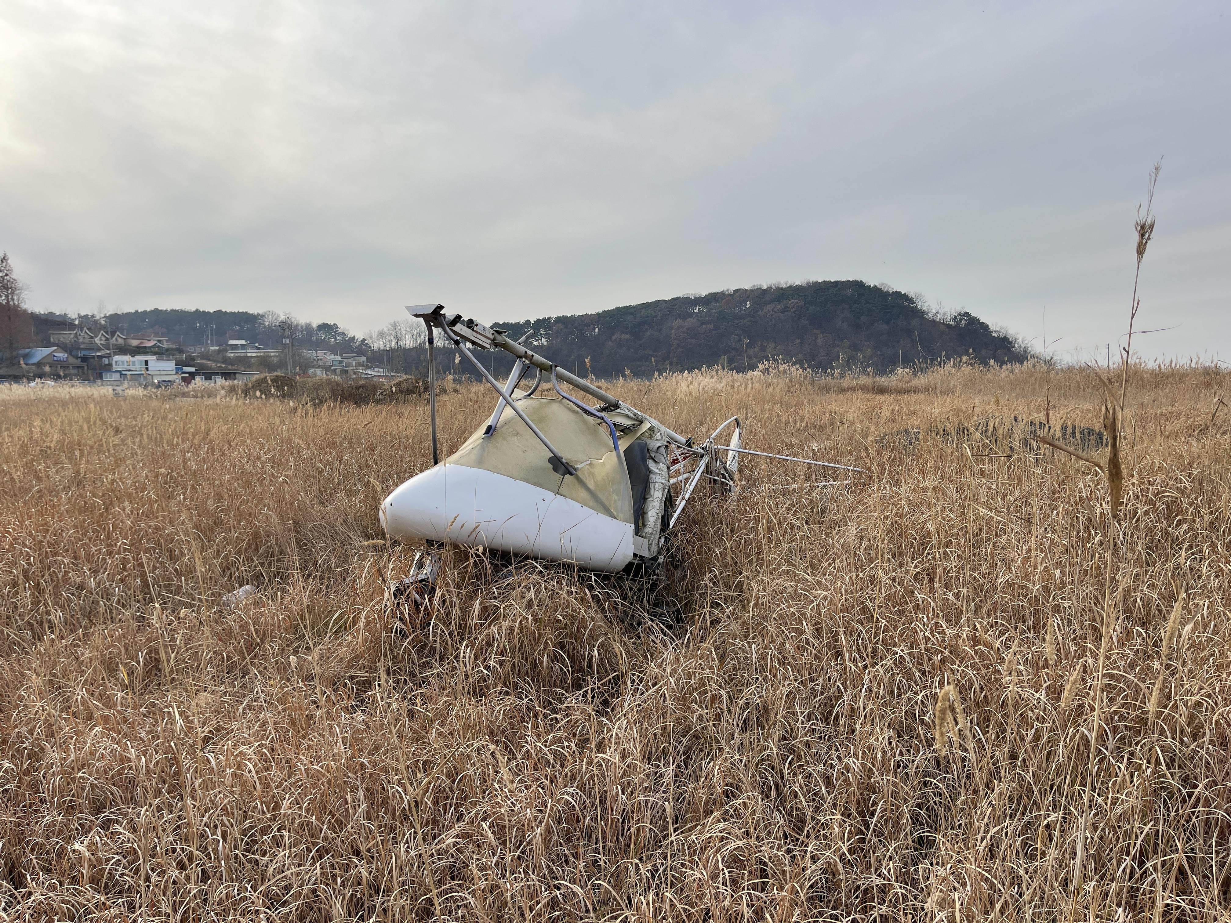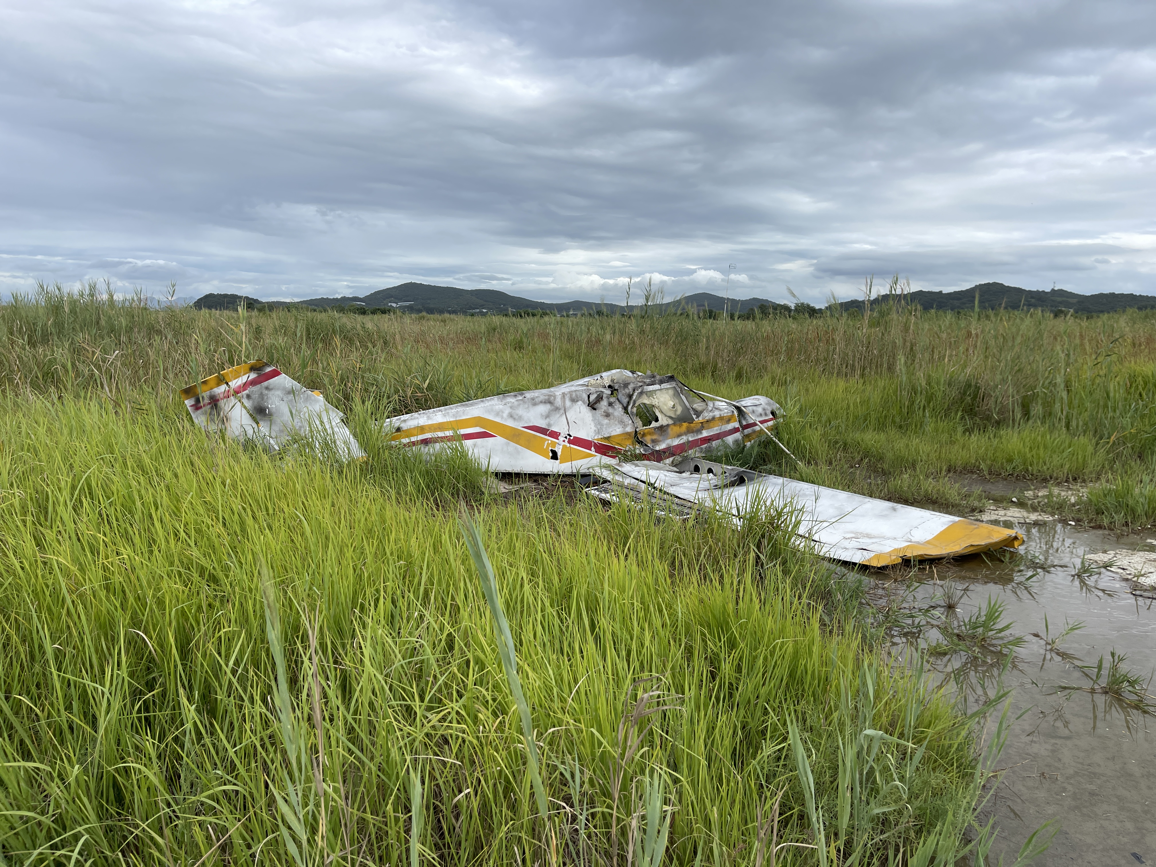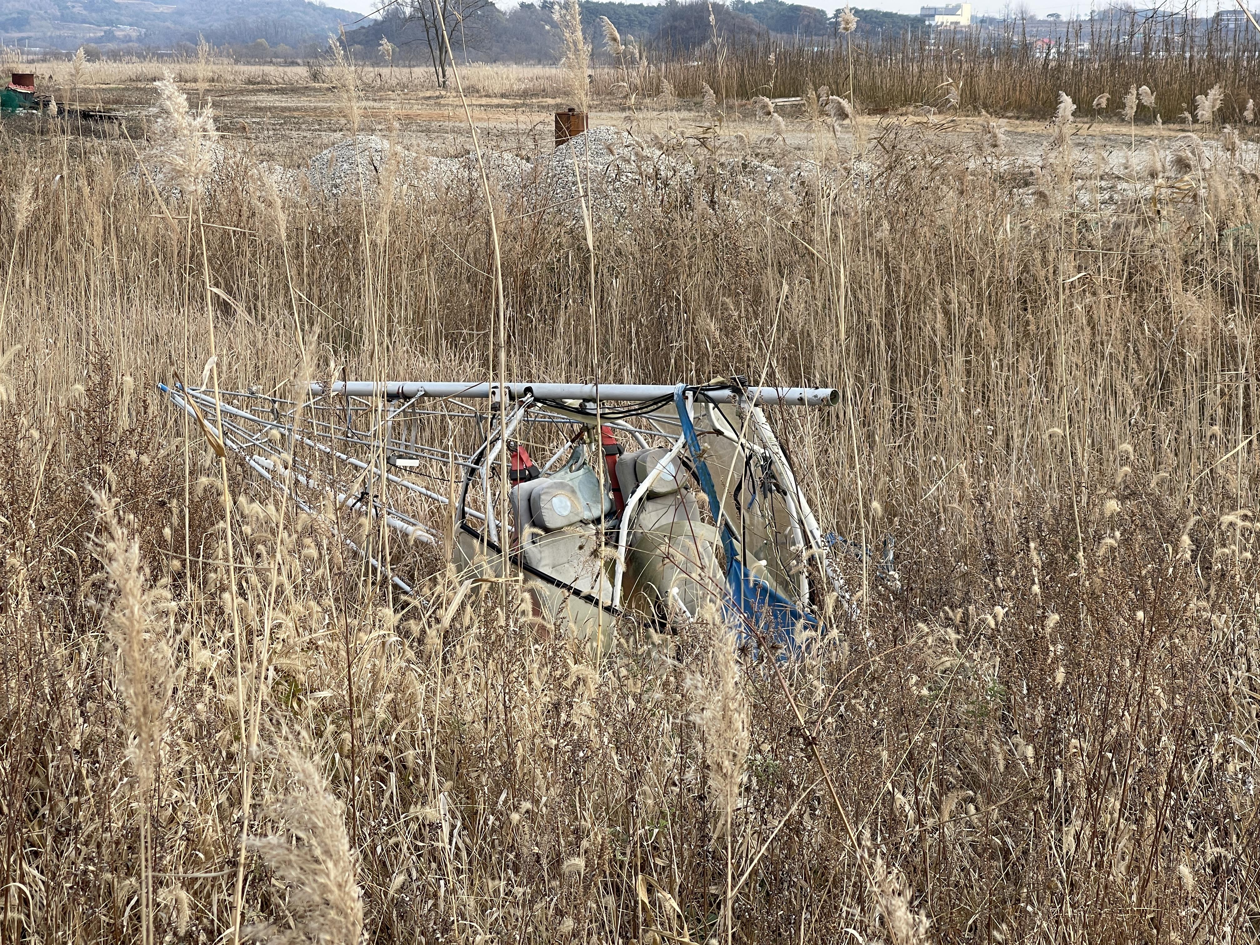 비행기 잔해를 둘러싼 풀들이 갈색으로 바뀌면서