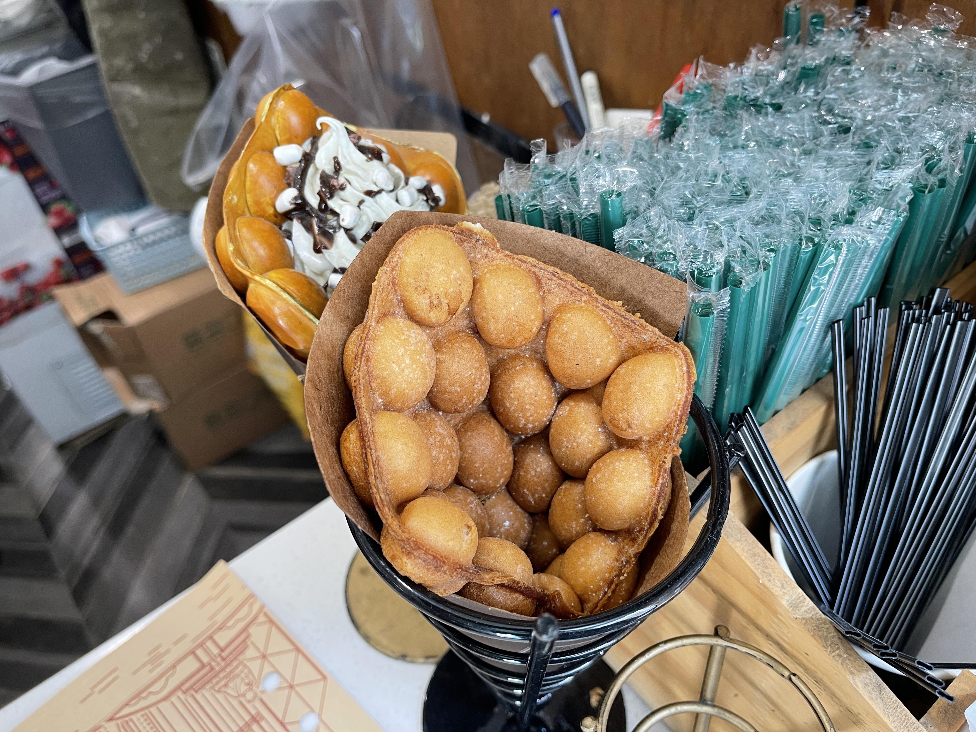 홍콩식 에그와플이라는 까이딴자이(雞蛋仔)와 동링차(凍檸茶)를 사간 뒤