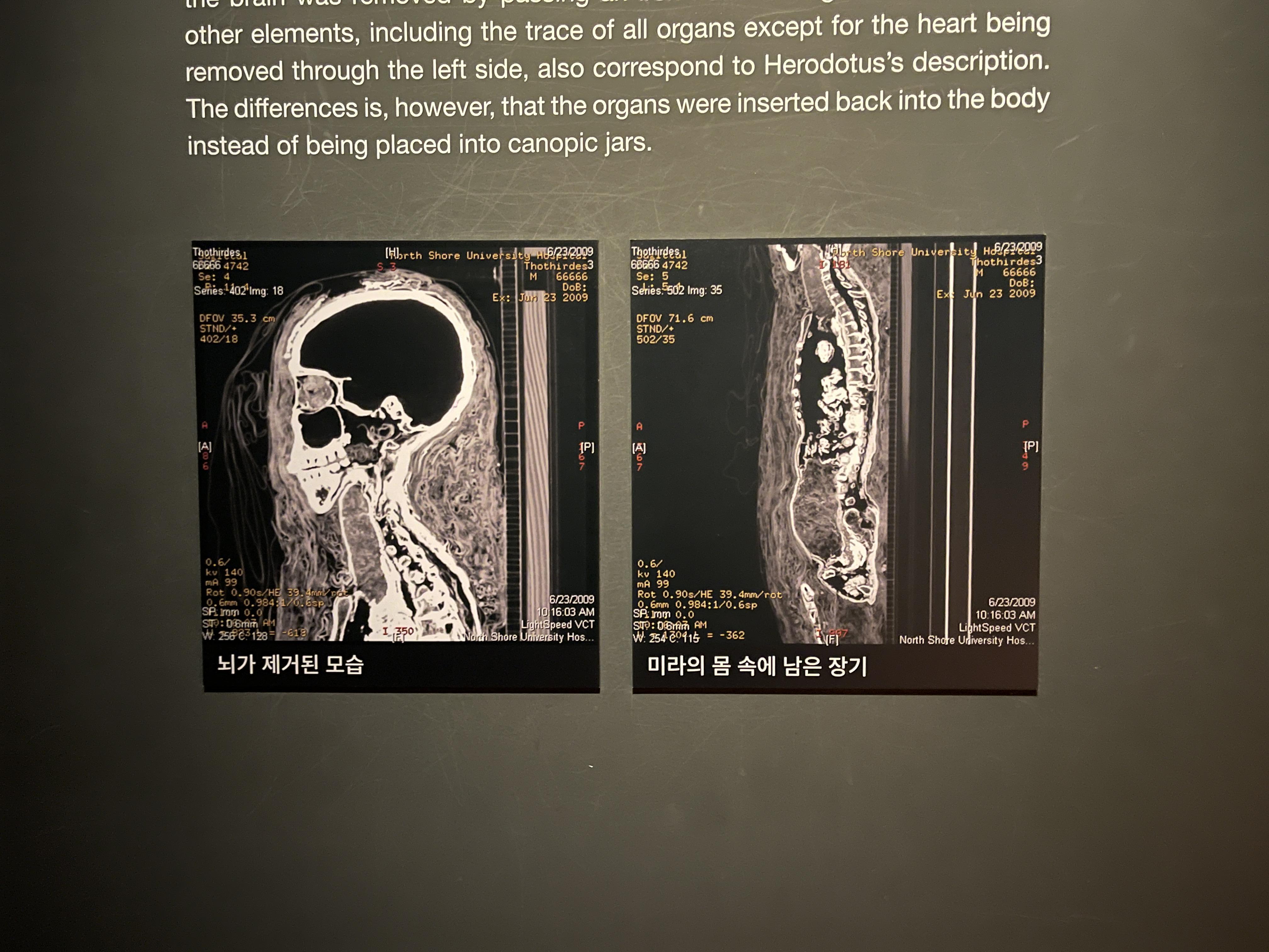 미라를 만들면서 뇌와 장기를 제거했다는 사실을 CT로 촬영한 사진으로 알아보고