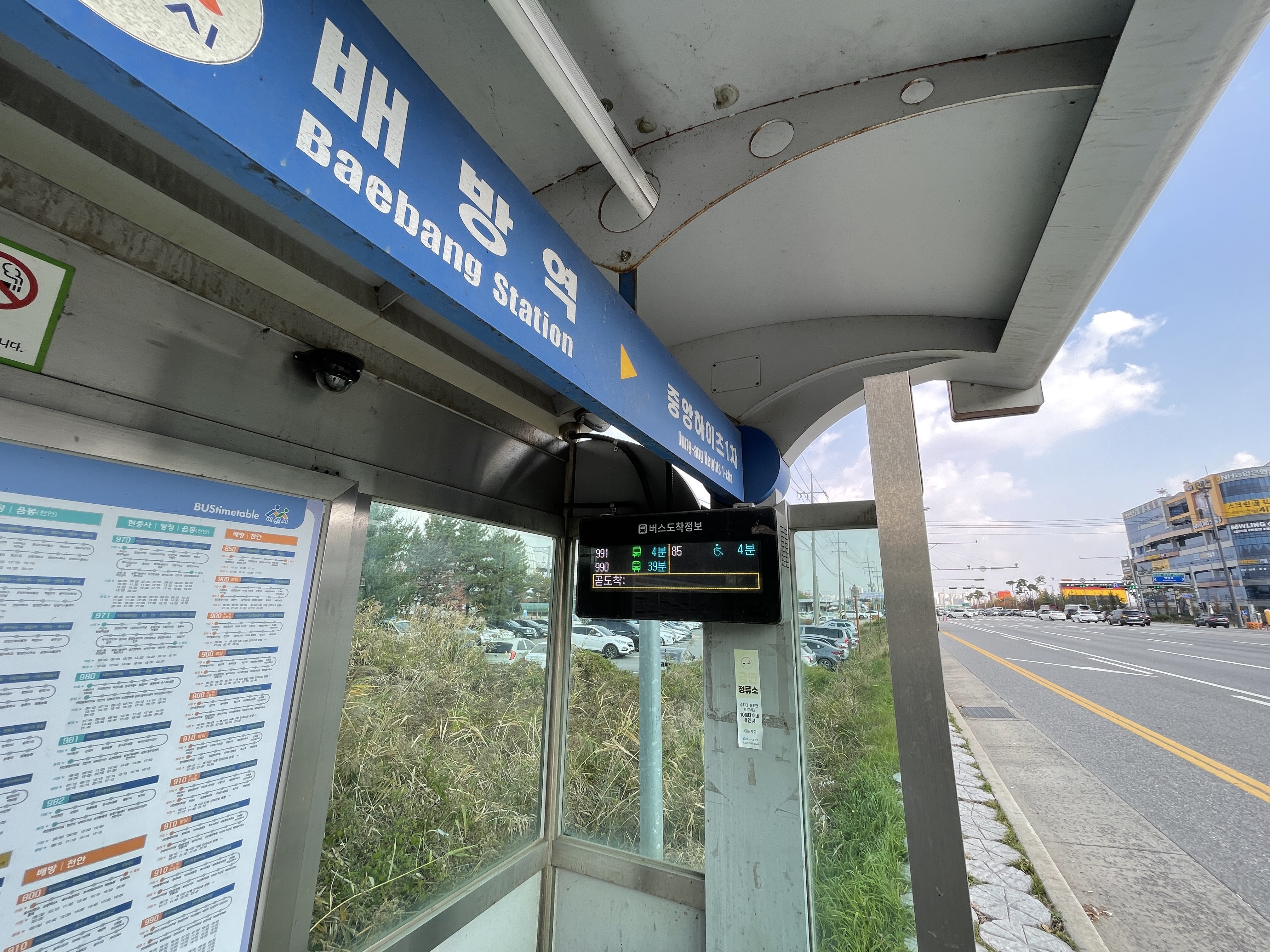 배방환승정류장에서 12시 50분에 출발하는 85번 버스를 배방역 정류장에서 타고