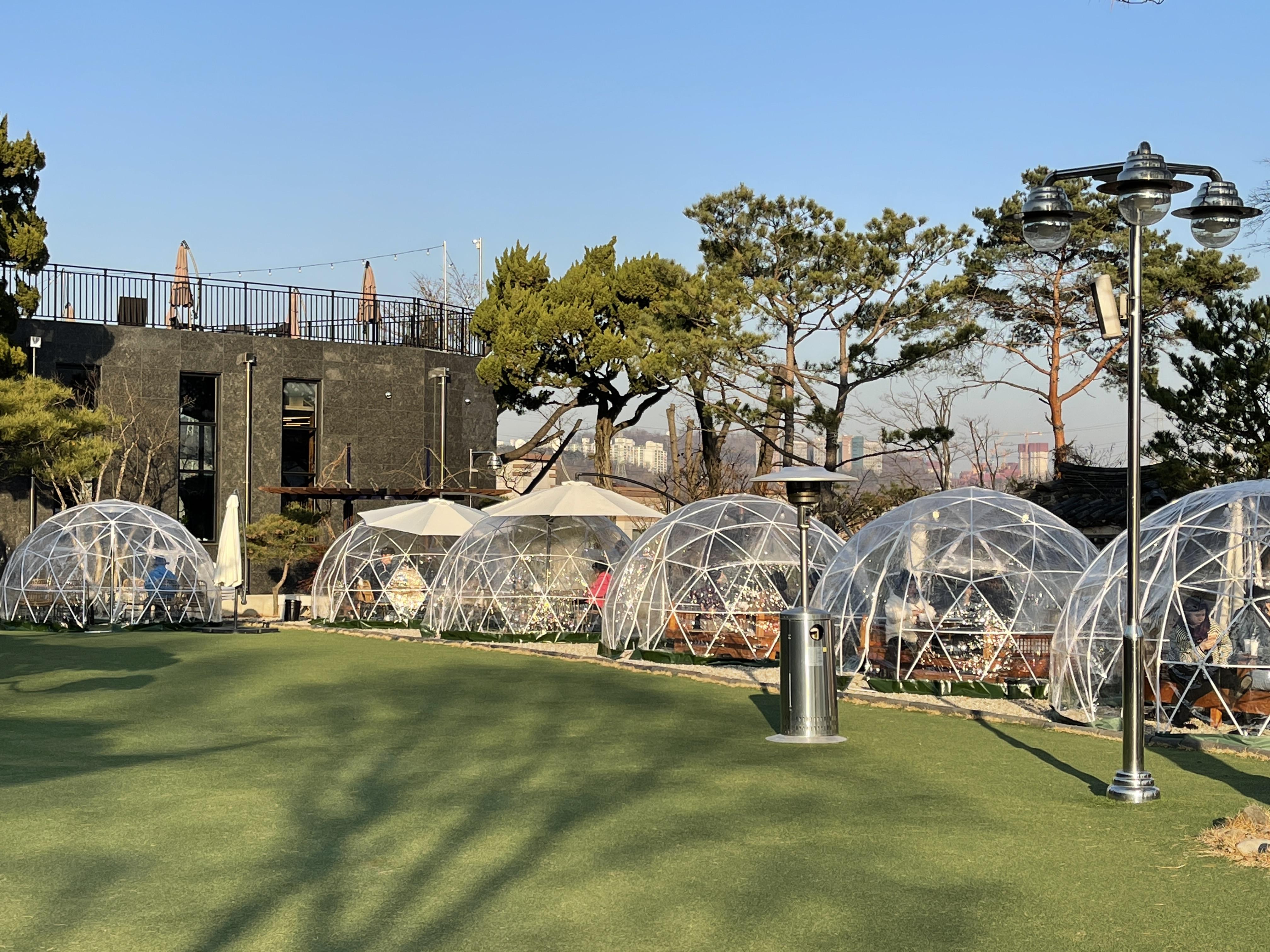 여름에는 파라솔만 펼쳐있을 자리가 겨울을 맞아 돔을 씌운 특이한 모습도 볼 수 있습니다.