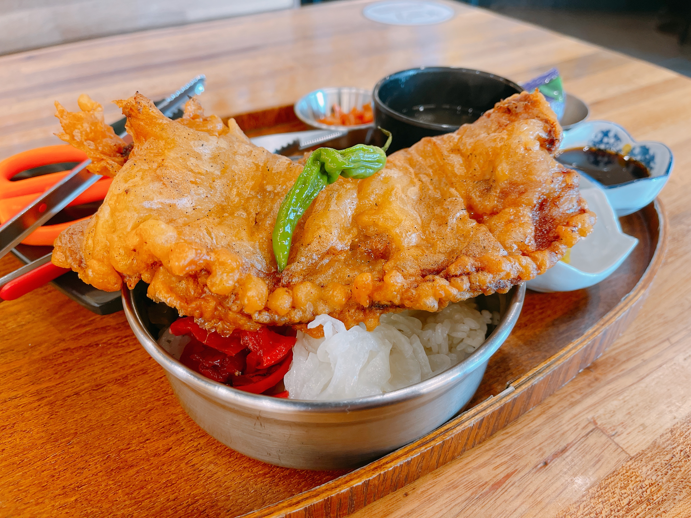 양념한 돼지갈비를 튀겨서 밥 위에 얹어 먹는 게 특징인데