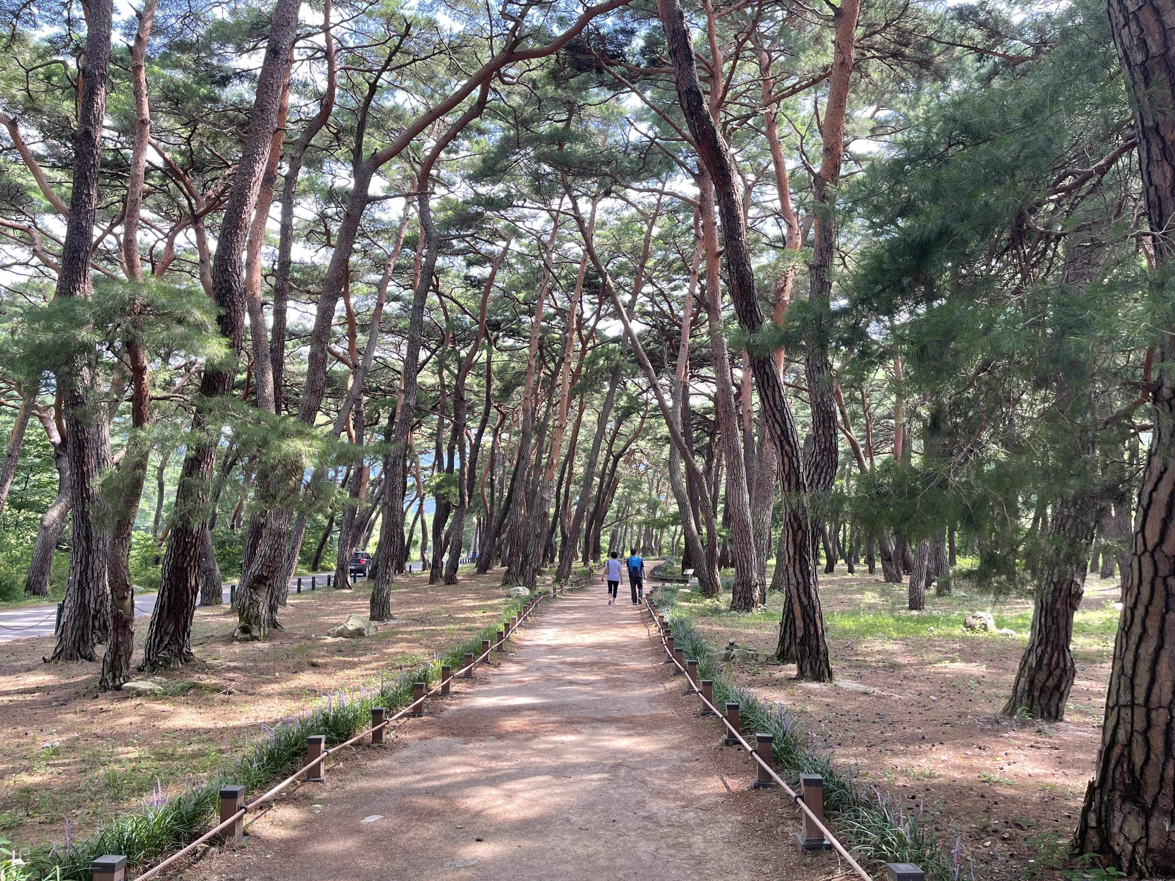 양옆으로 소나무가 펼쳐진 생태탐방로를 걸어가