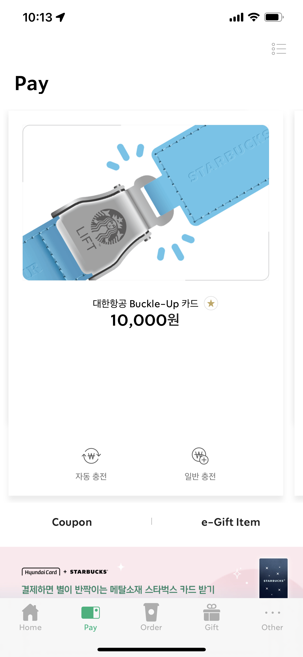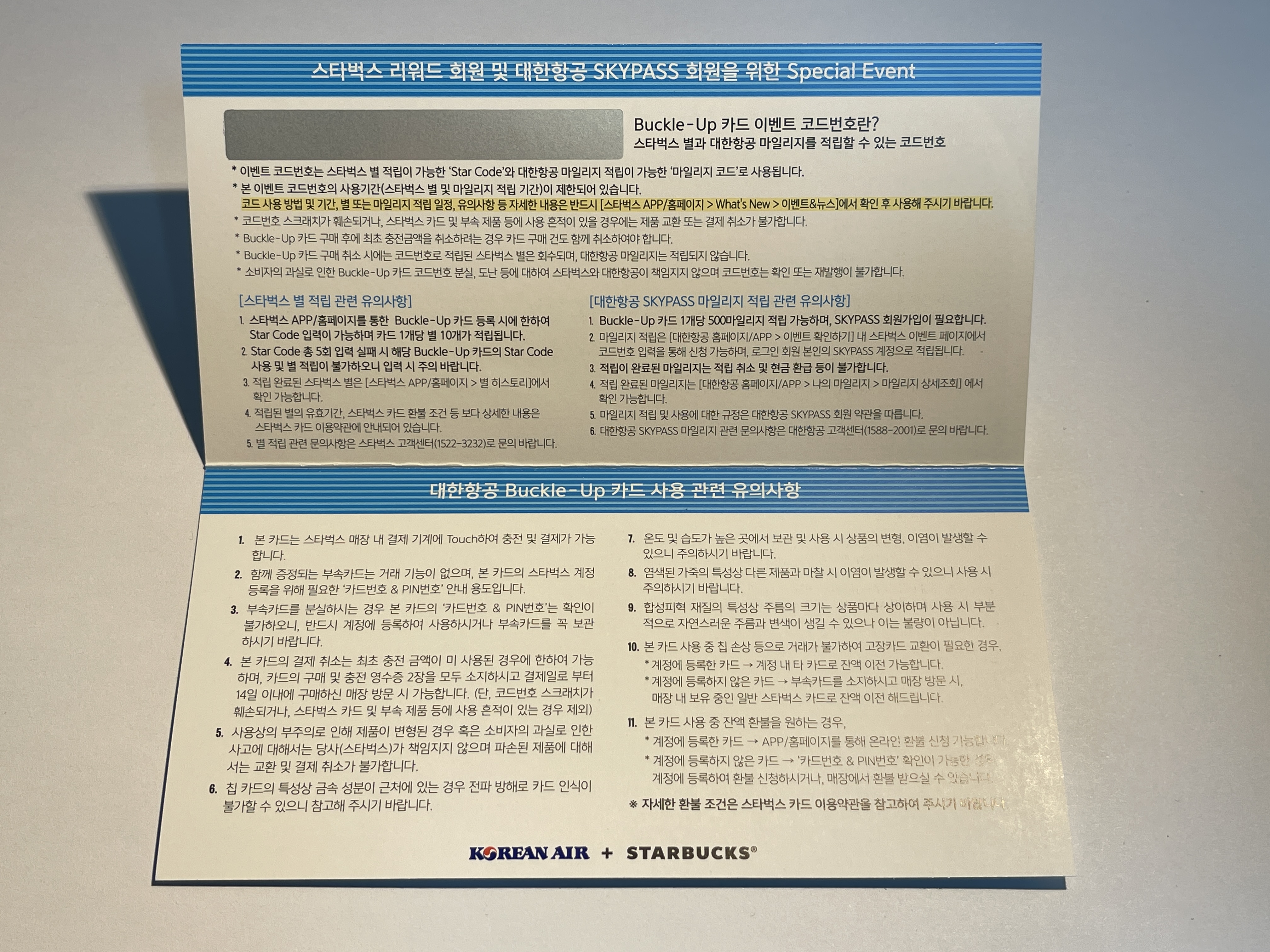 카드를 등록하면 스타벅스 별 10개에 대한항공 스카이패스 500 마일리지를 적립해주니