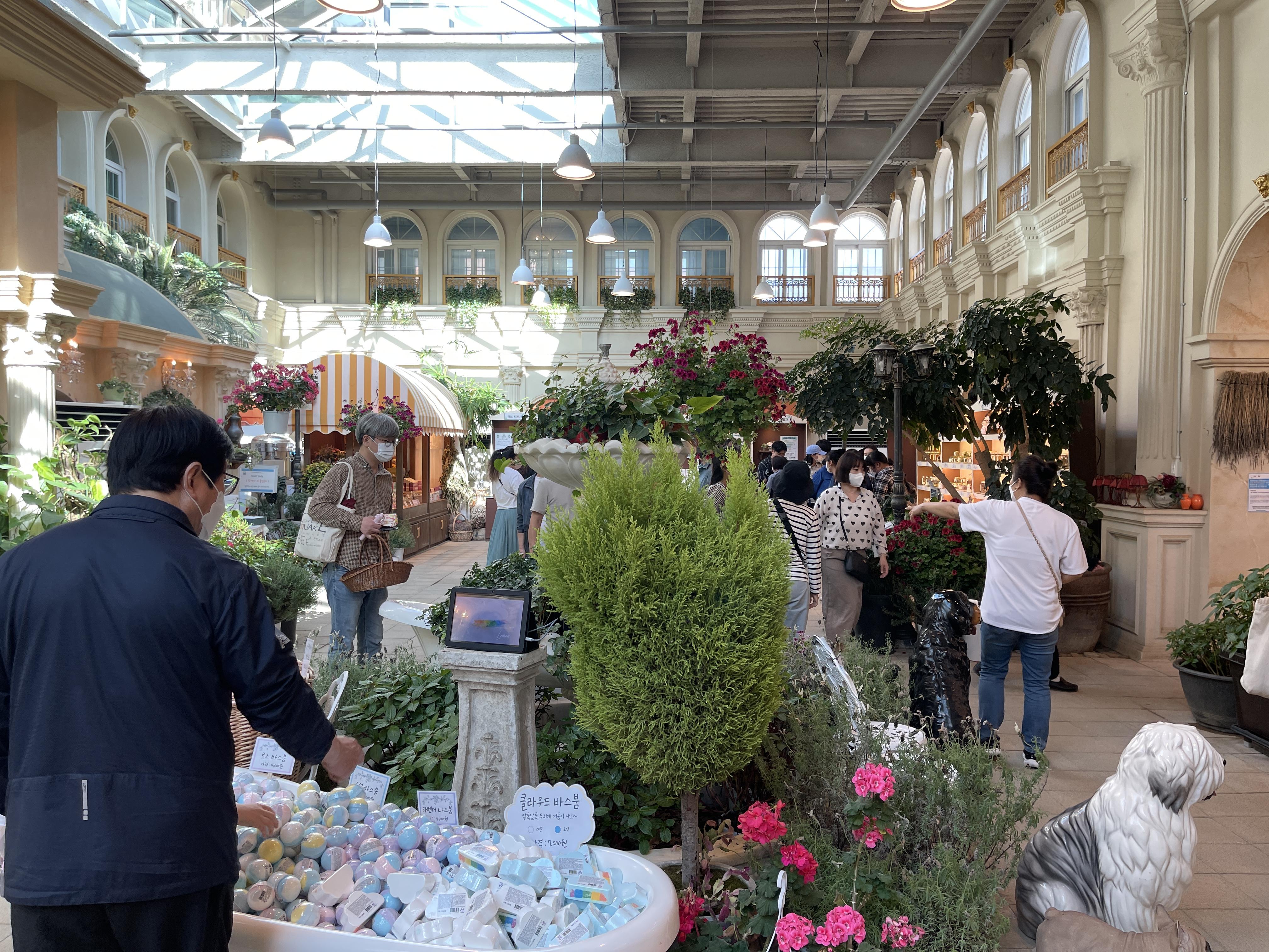문을 지나가려는 찰나 직원이 마스크와 목 뒤에 향수를 뿌려주고 향을 맡아보라고 합니다.