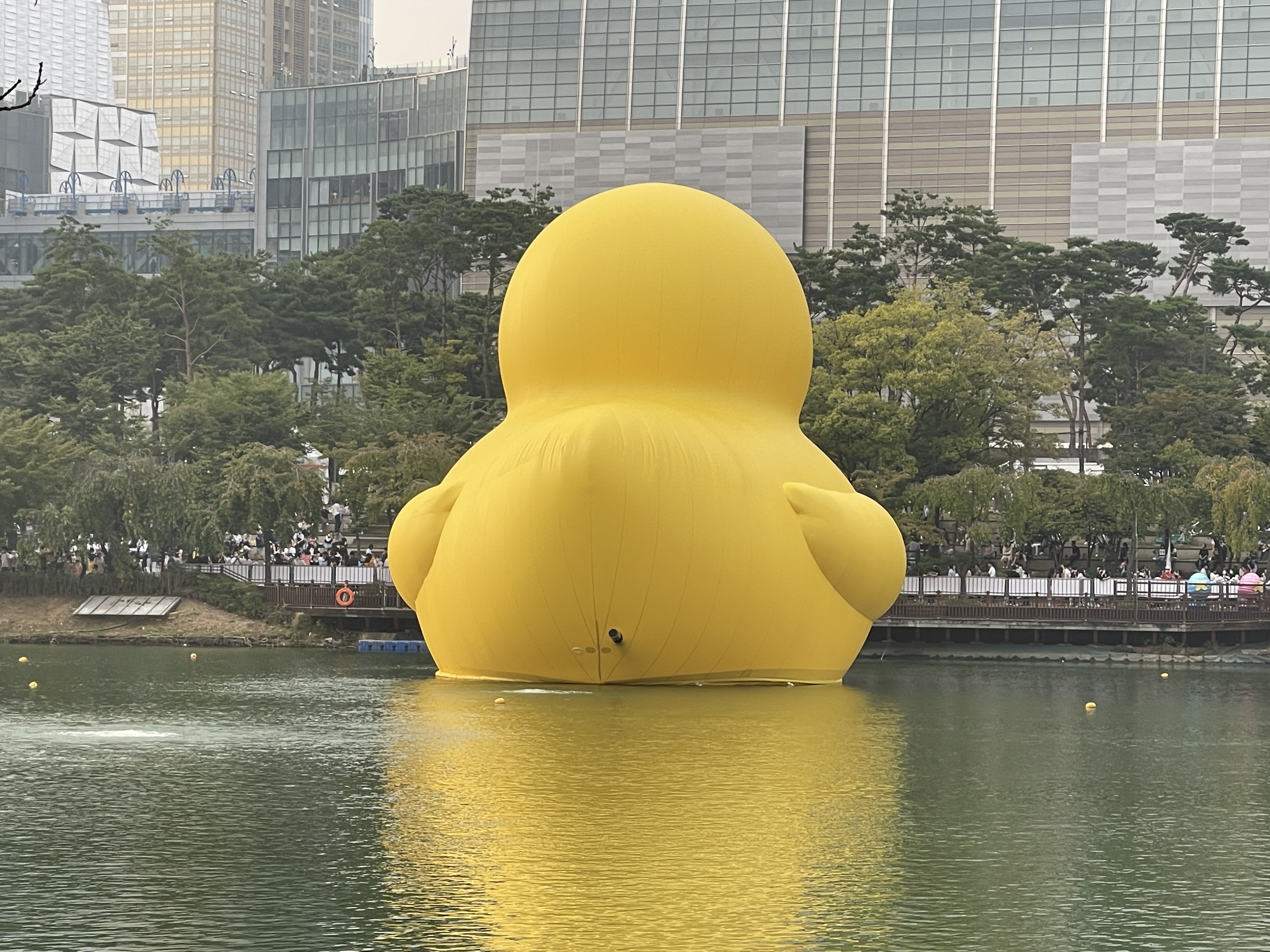 거대한 고무 오리 인형이 단순히 물 위를 둥둥 뜨고 있는 어찌 보면 단순한 설치미술인데
