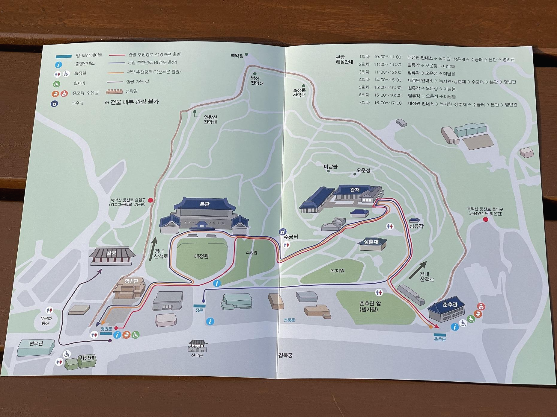 청와대 안내도를 받아 어떻게 돌아다닐지 고민해봅니다.