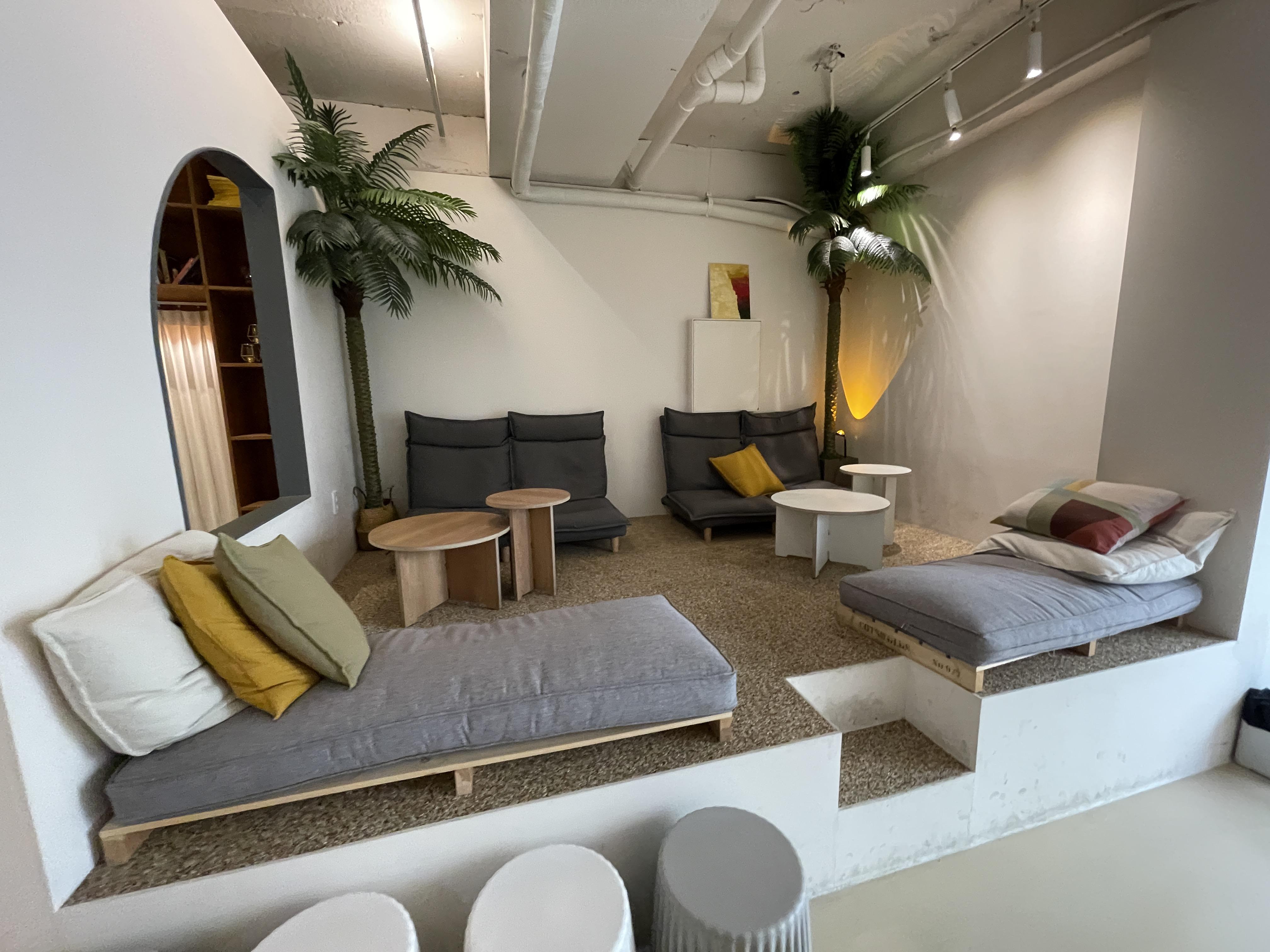 안쪽에 있는 비스듬한 자리에는 두 다리를 쭉 뻗고 등을 기대 편히 있기 좋아 보입니다.