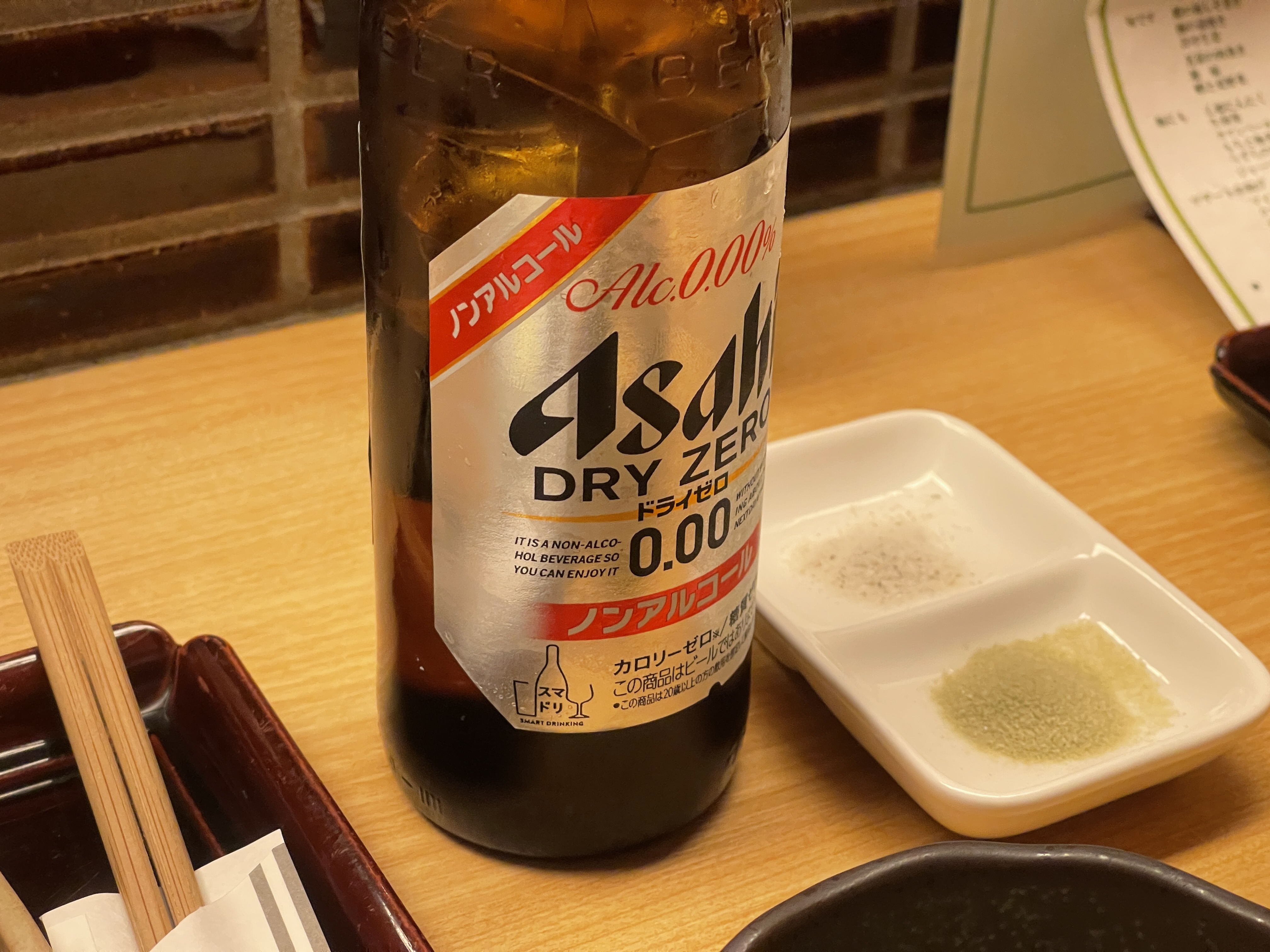 아사히 드라이 제로 1병을 시켜 꼬치와 함께 먹겠습니다.