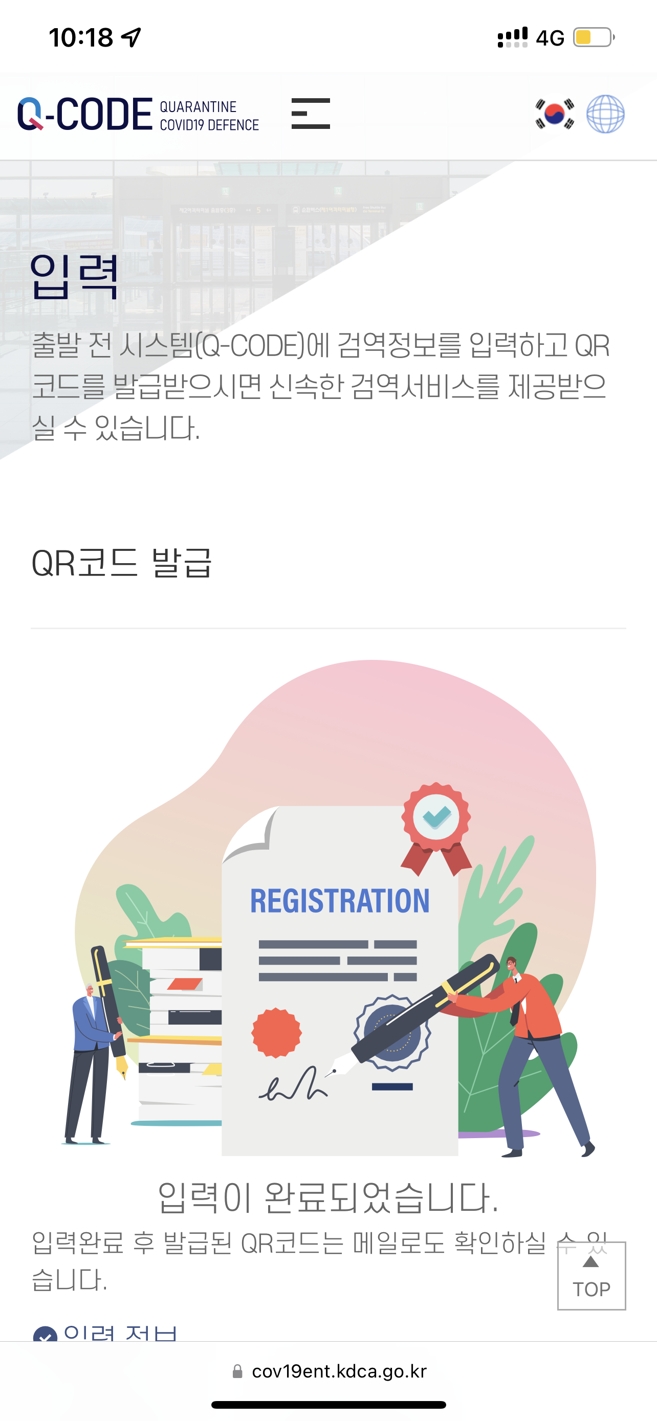 한국에 입국할 때 필요한 Q코드 안내를 듣습니다.