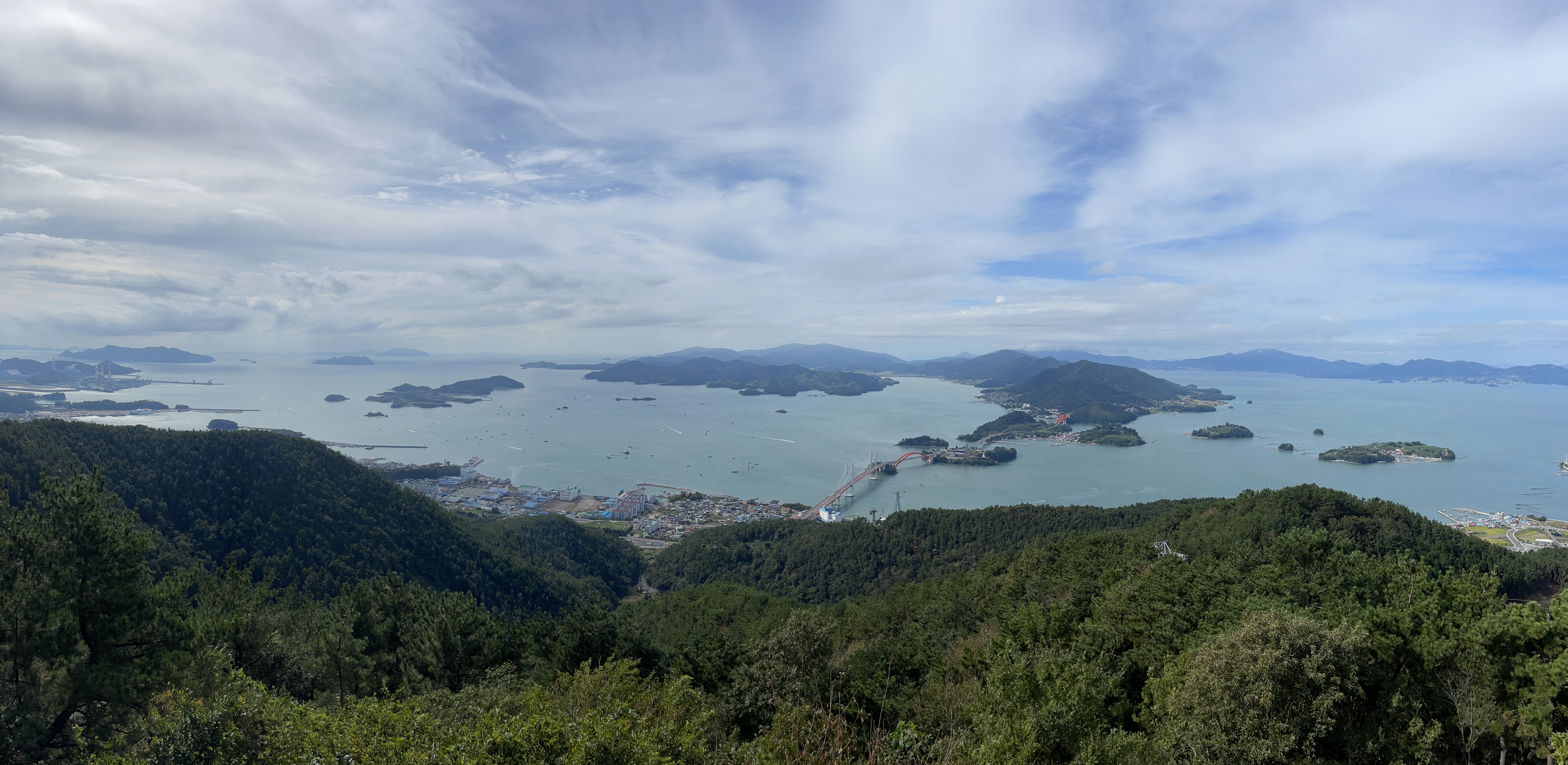 창선삼천포대교로 육지와 이어지는 사천시 초양도와 늑도, 그리고 남해군 창선도가 보입니다.