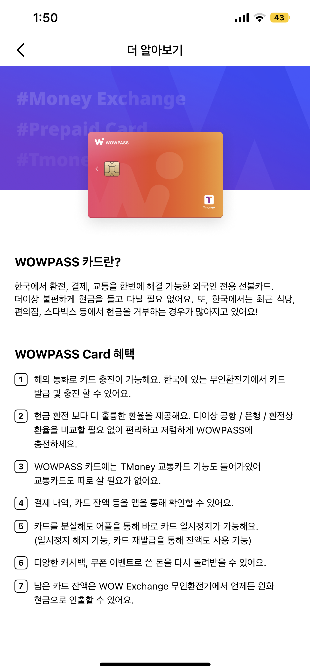 외국인을 위한 서비스지만 의외로 한국어도 지원하길래 WOWPASS 카드 버튼을 눌러보니