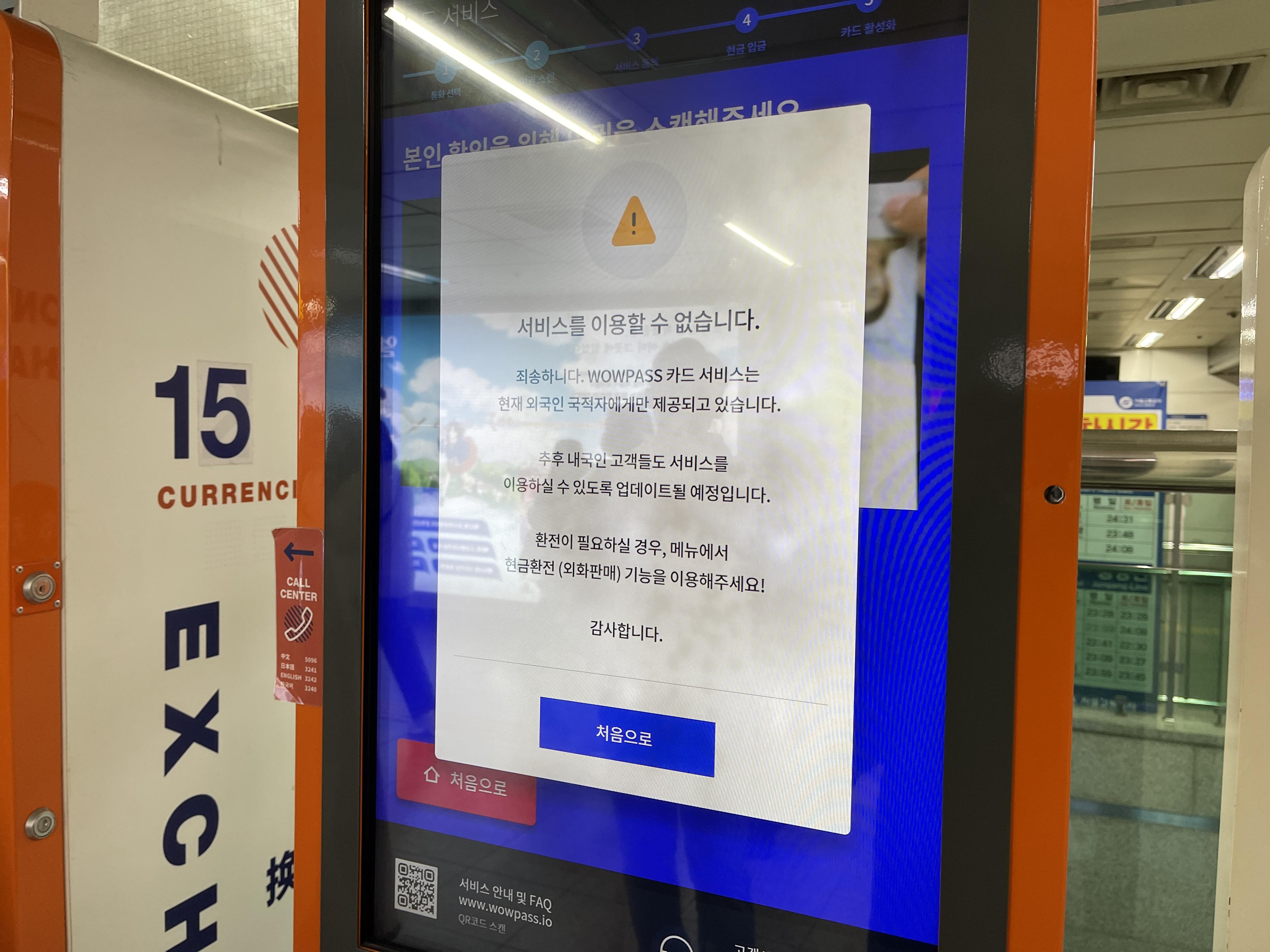 하지만 실제로 한국 여권을 인식시키면 서비스를 이용할 수 없다는 안내문이 나옵니다.