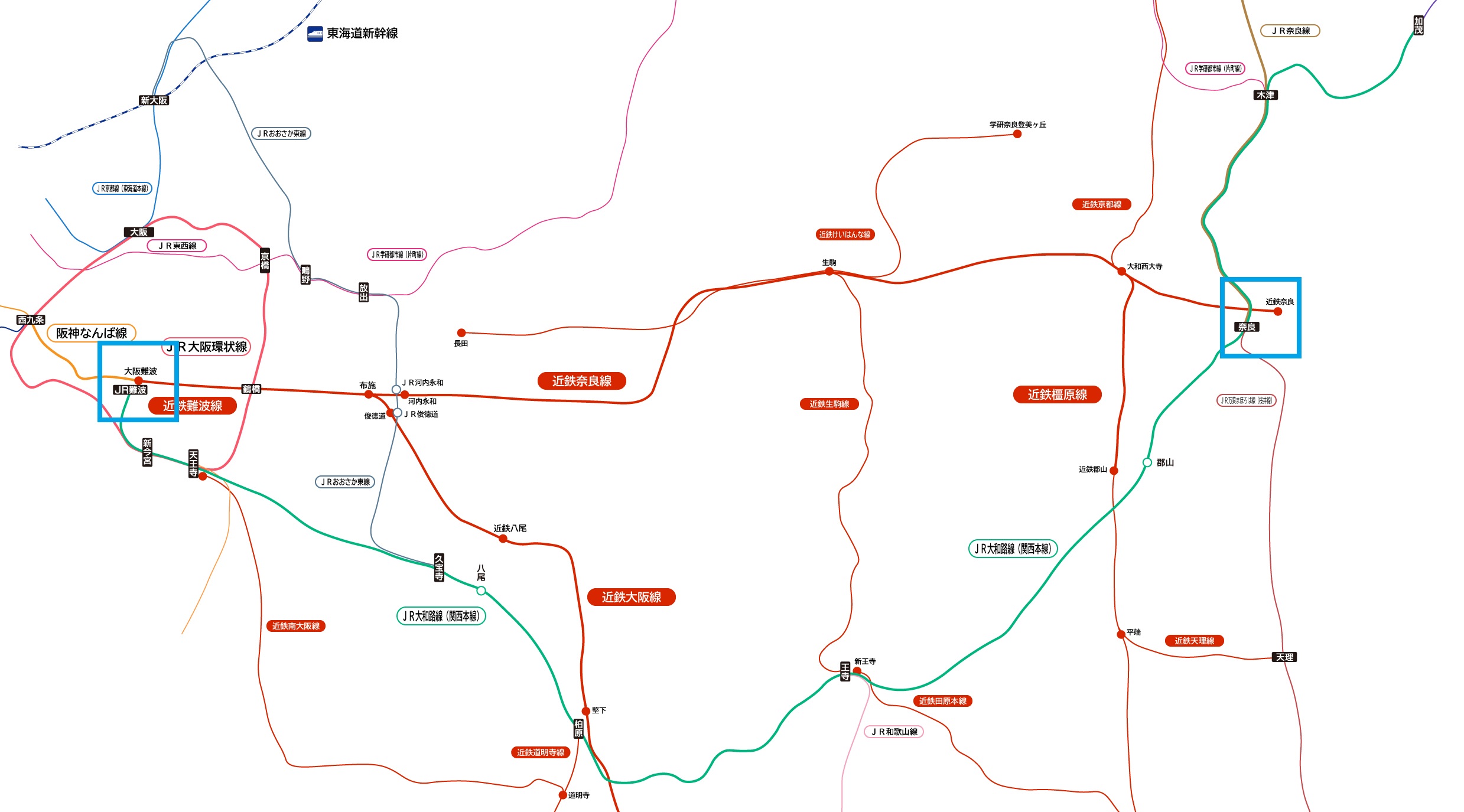노선도를 보면 오사카난바(빨간선 맨 왼쪽)에서 킨테츠나라(빨간선 맨 오른쪽)까지 일직선으로 그어져 있는데