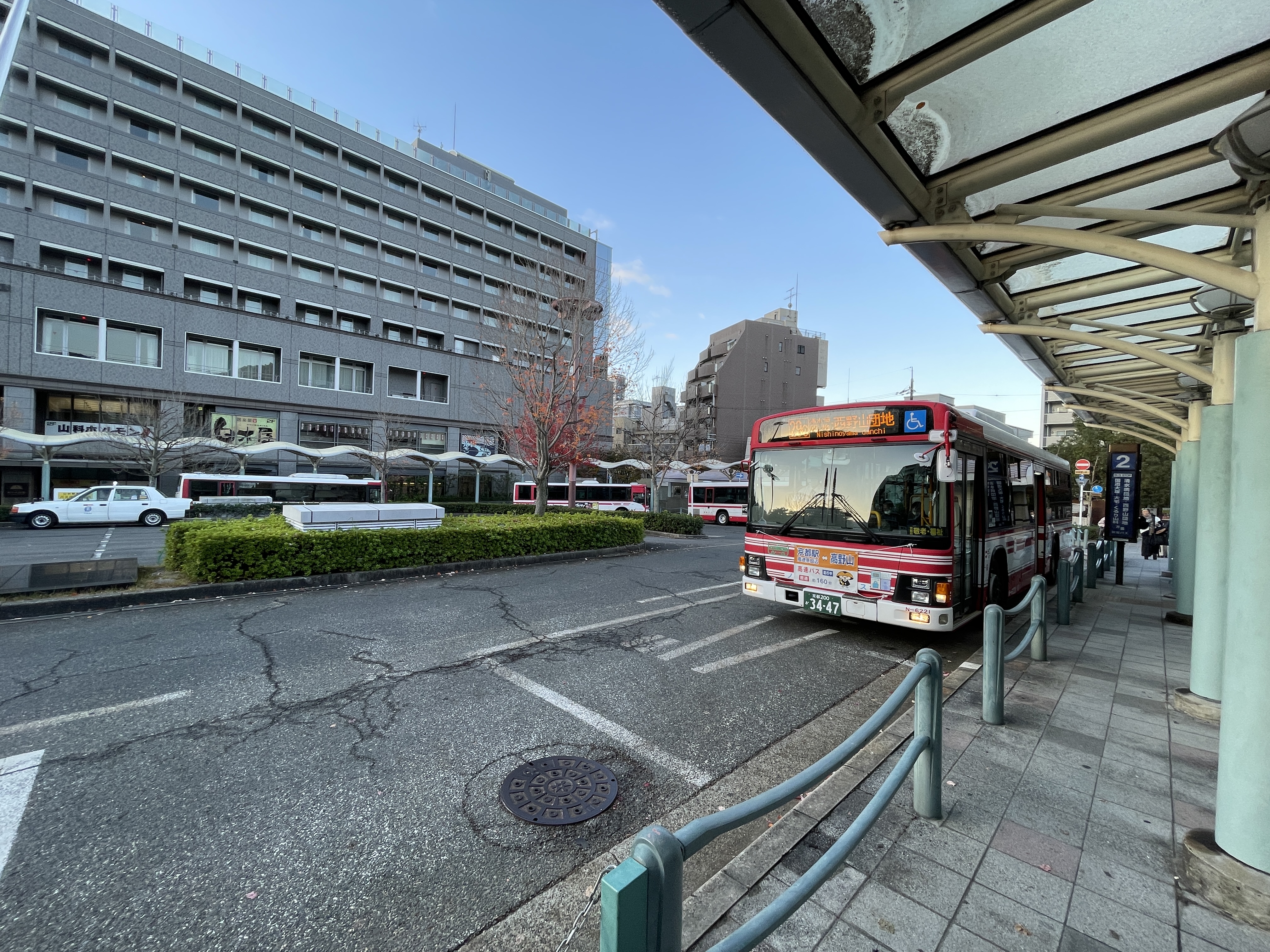 교토역이나 카와라마치역과는 다르게 교토시영버스가 보이지 않고 빨간 버스로 가득합니다.