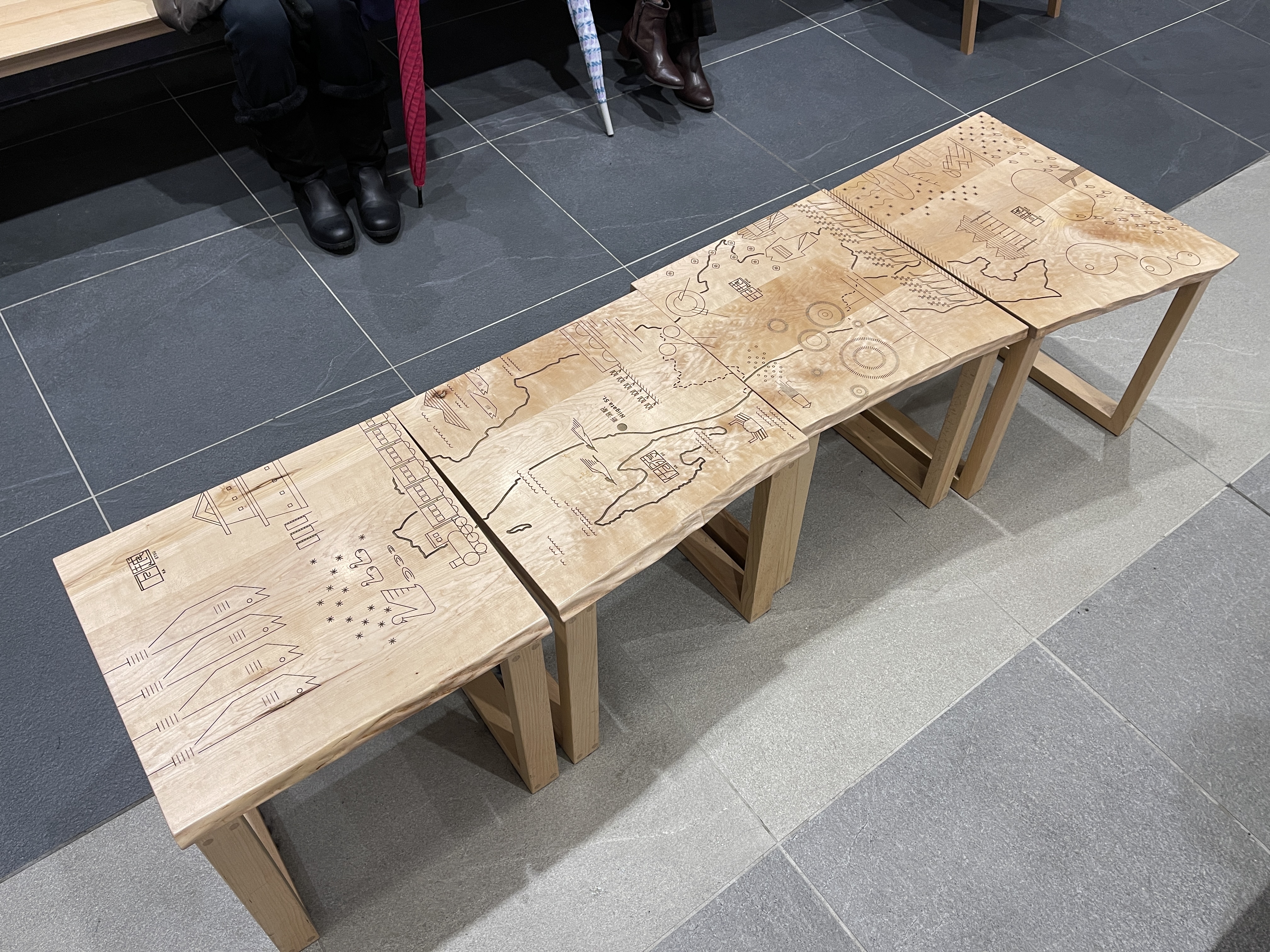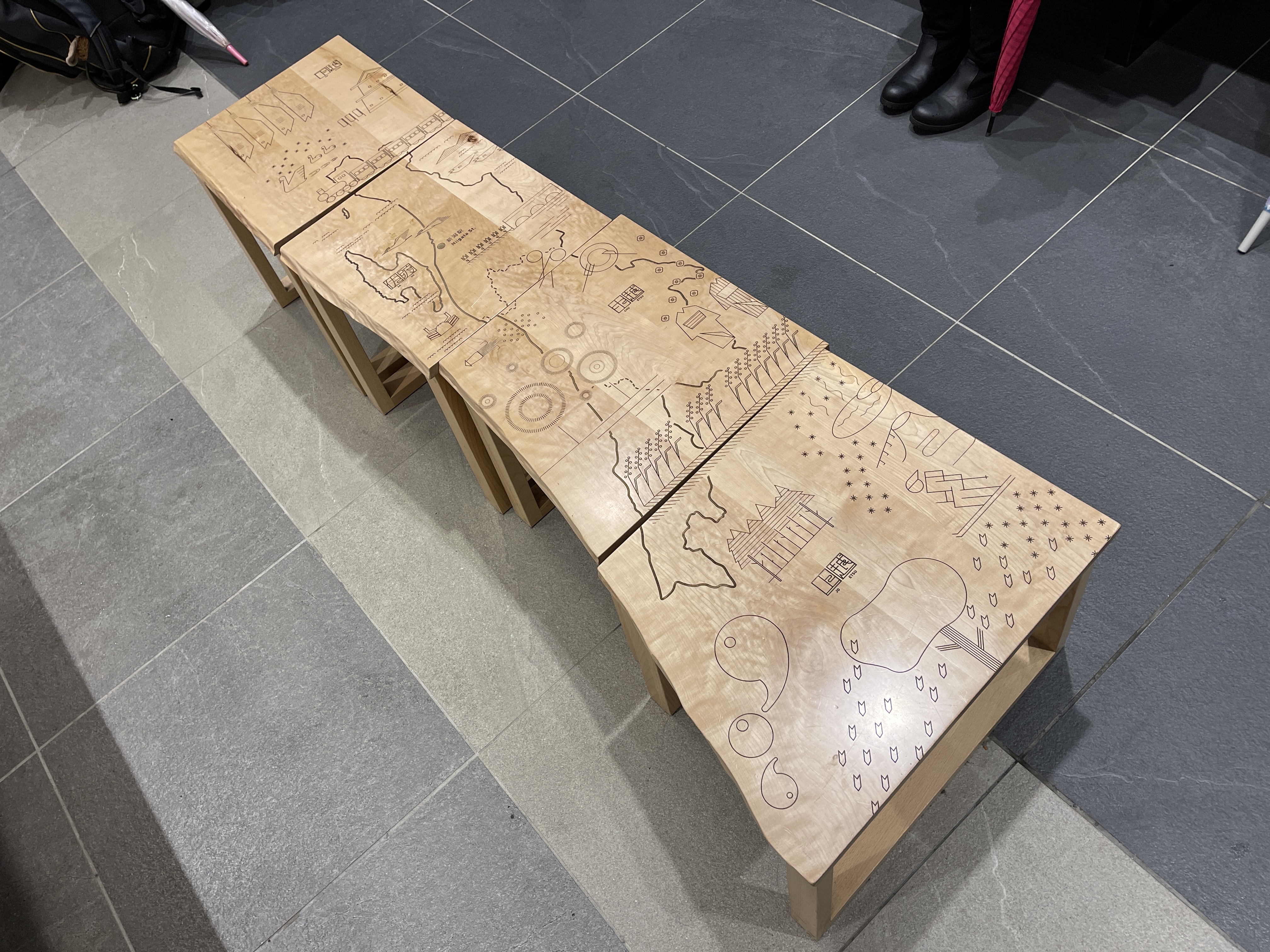 대합실 한가운데에는 지도가 그려진 나무 의자가 있는데
