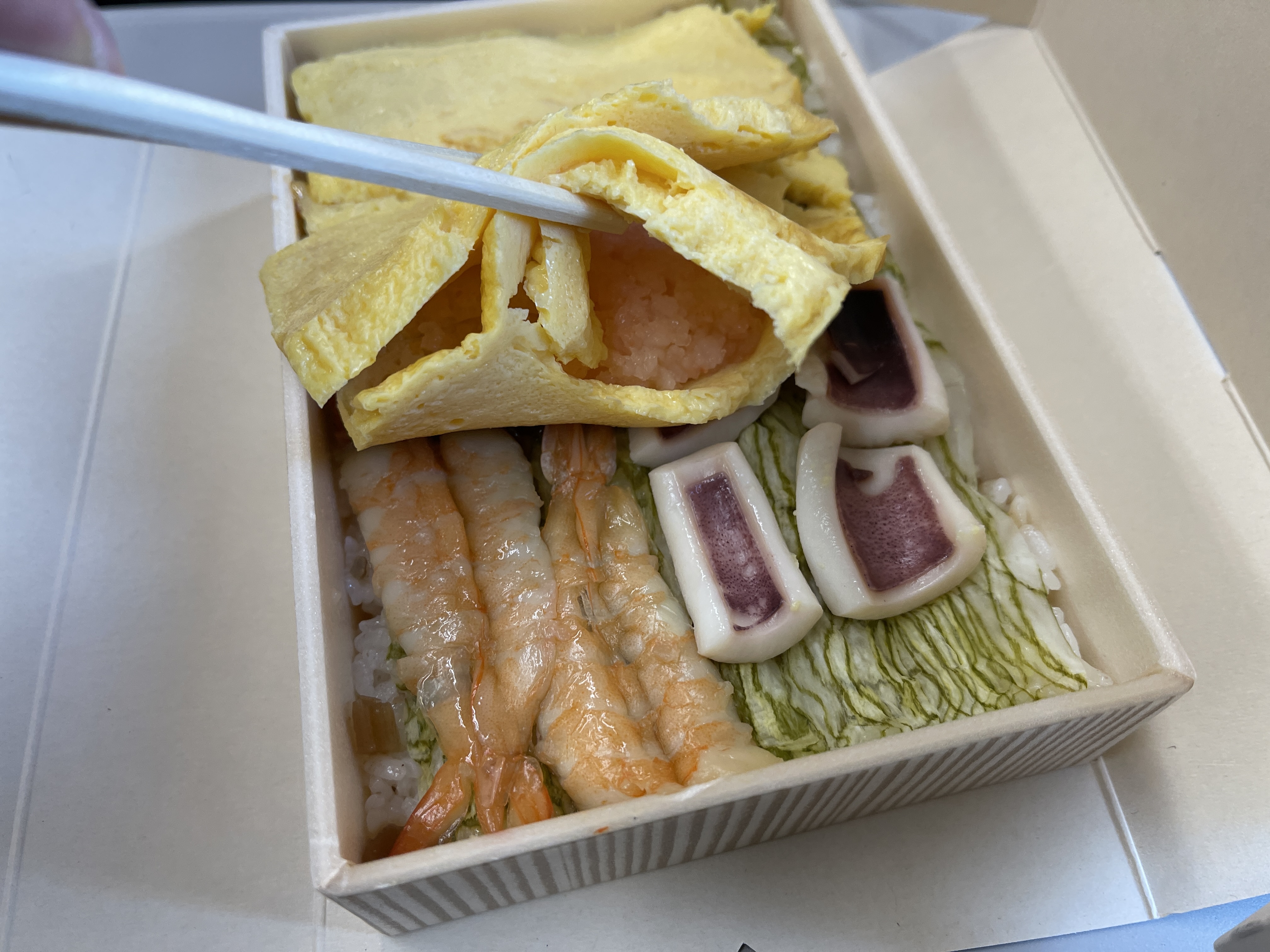 여러 에키벤 중 니가타에서 자란 쌀로 만들었다는 에비센료치라시(えび千両ちらし)를 사서 먹습니다.
