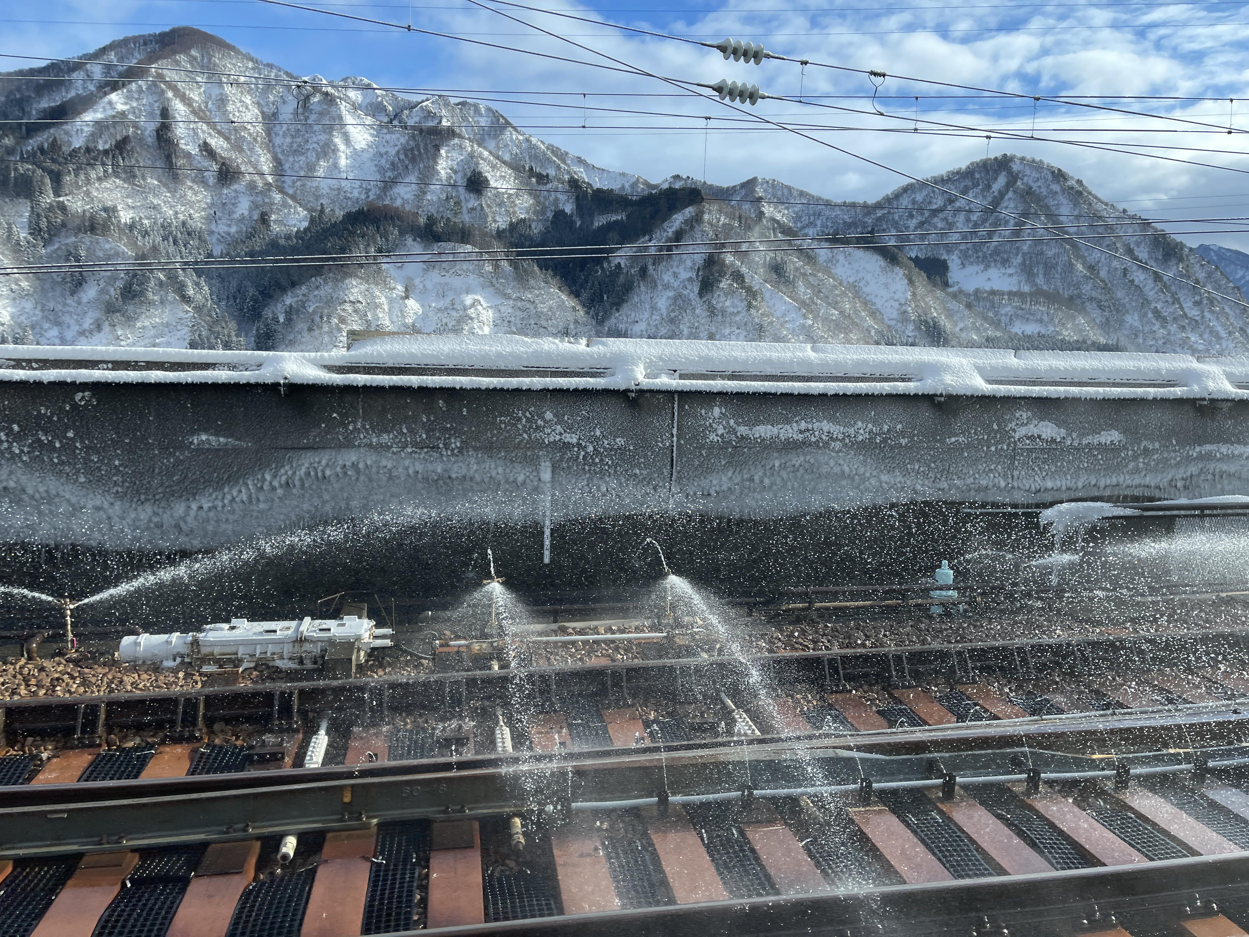 선로가 눈으로 덮이는 것을 막으려고 지속적으로 온천수를 뿌리고 있습니다.