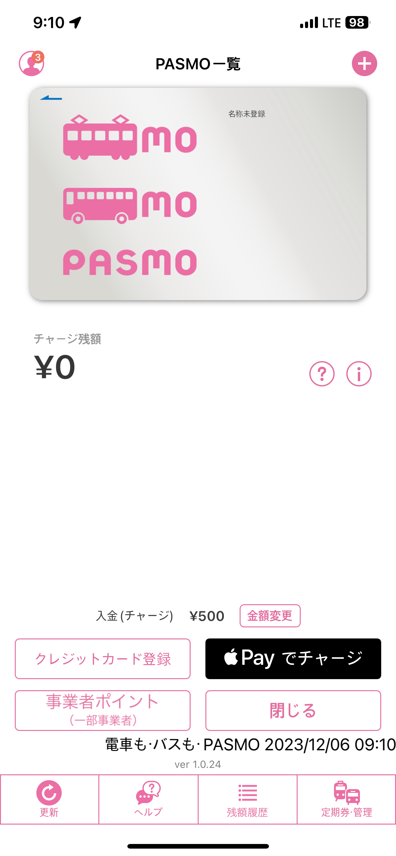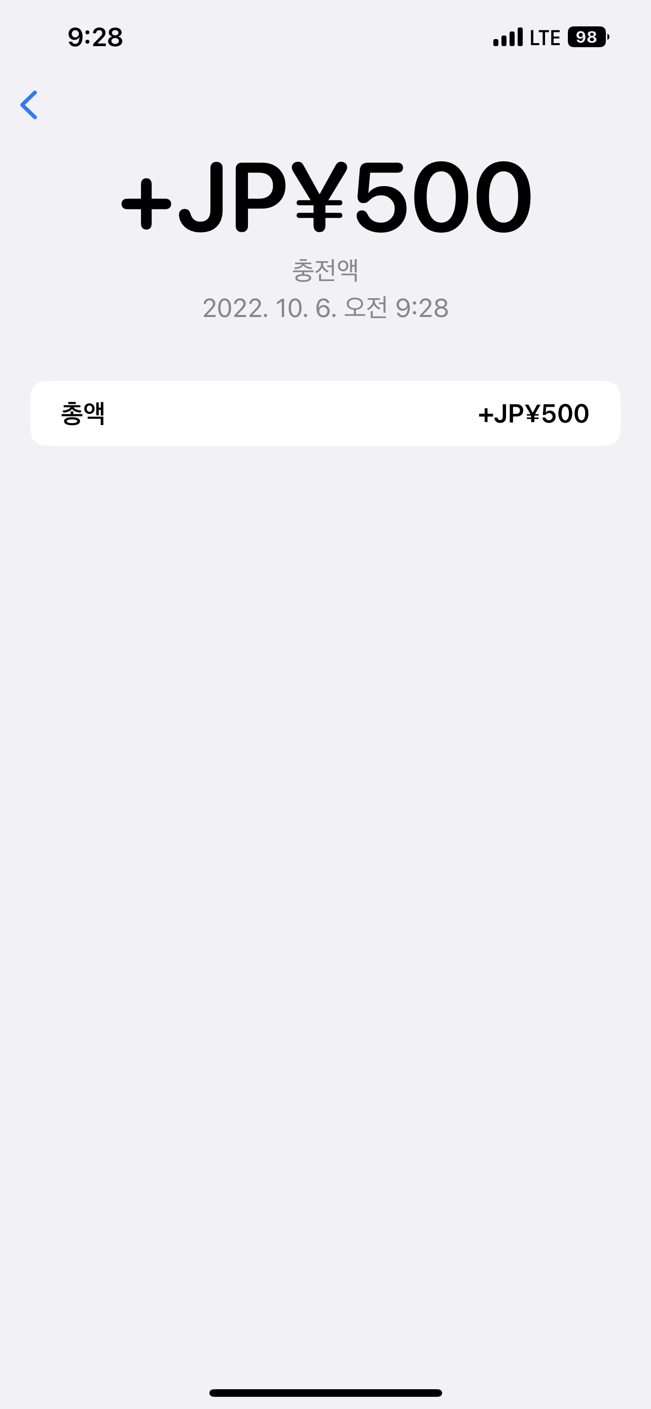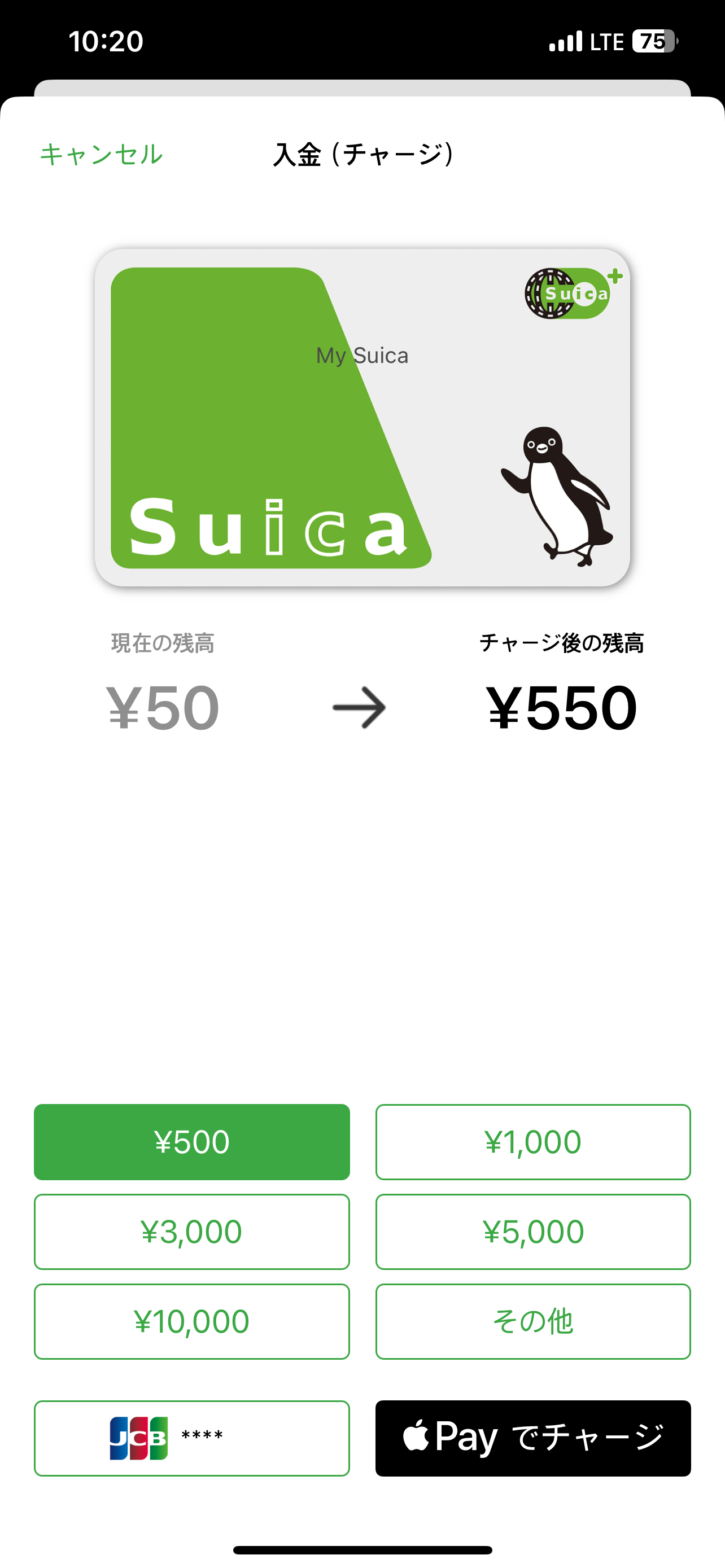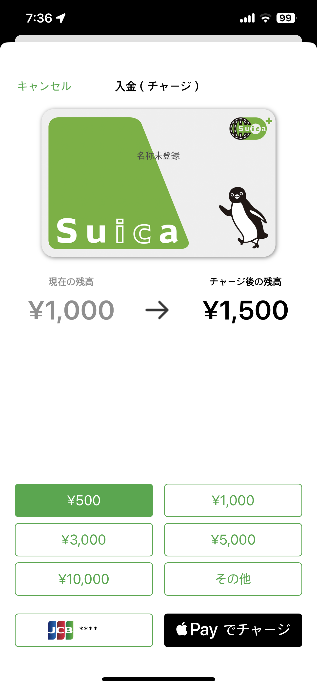 애플페이에 등록한 신용카드로 500엔부터 충전할 수 있는데요.