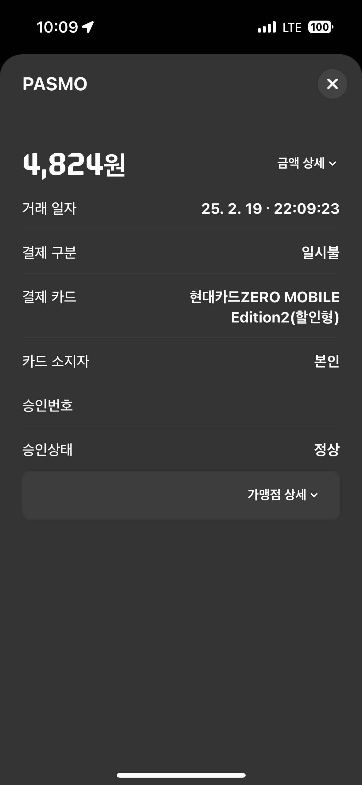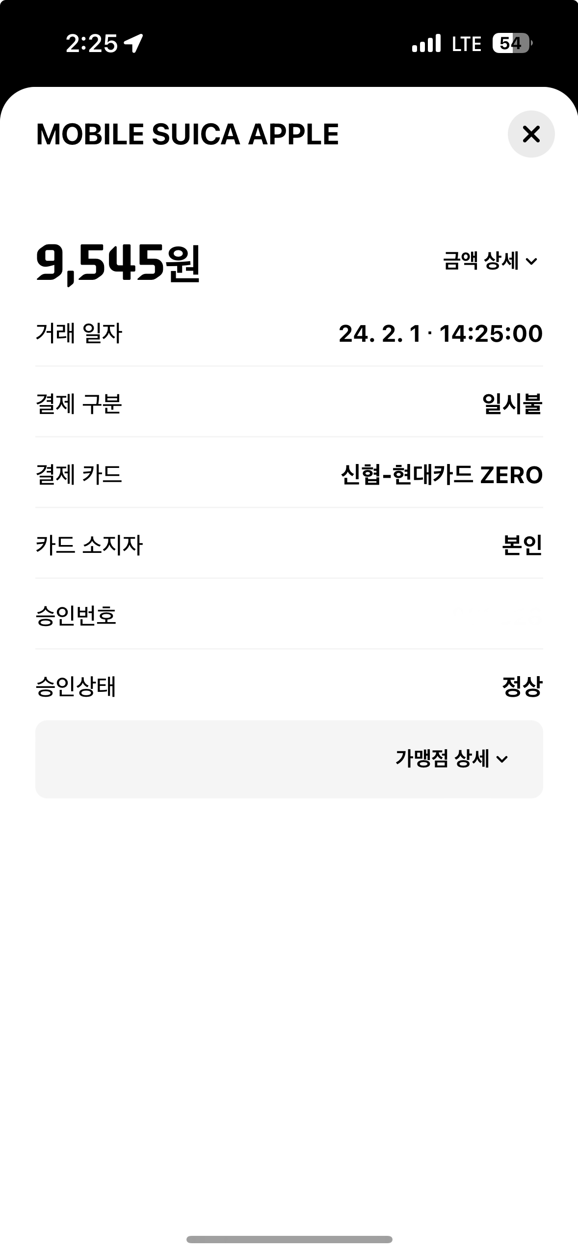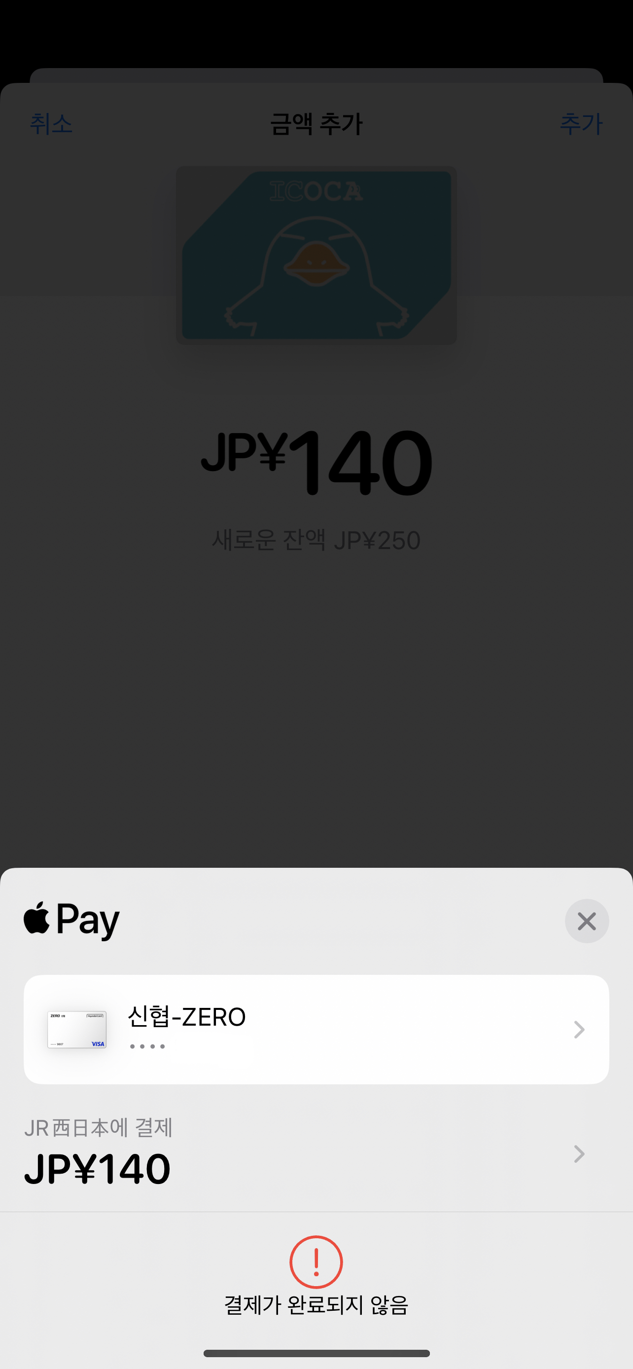 스이카 앱에서 애플페이에 등록한 비자카드로 충전을 시도하면 거의 대부분 결제가 성공합니다.