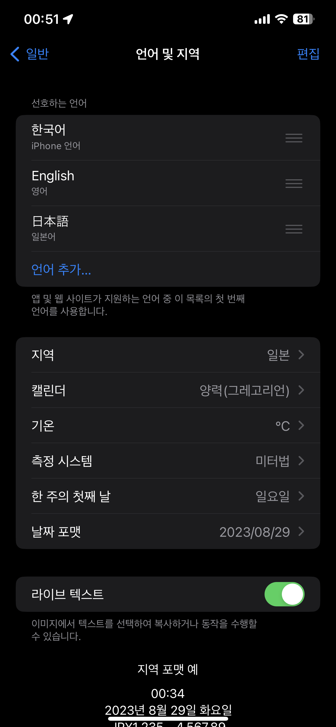 그러니 설정 > 일반 > 언어 및 지역에서 지역을 일본으로 선택해야 교통카드를 만들 수 있었는데