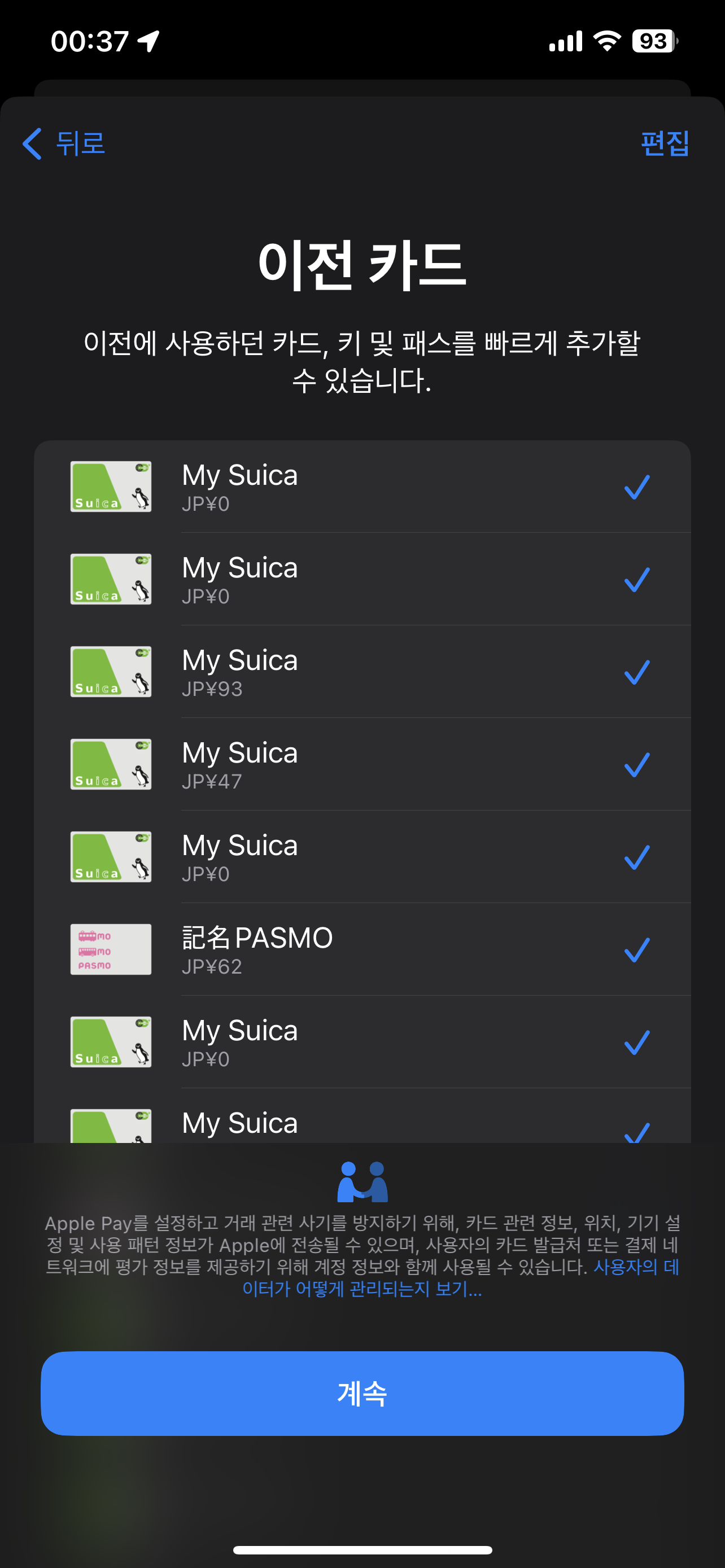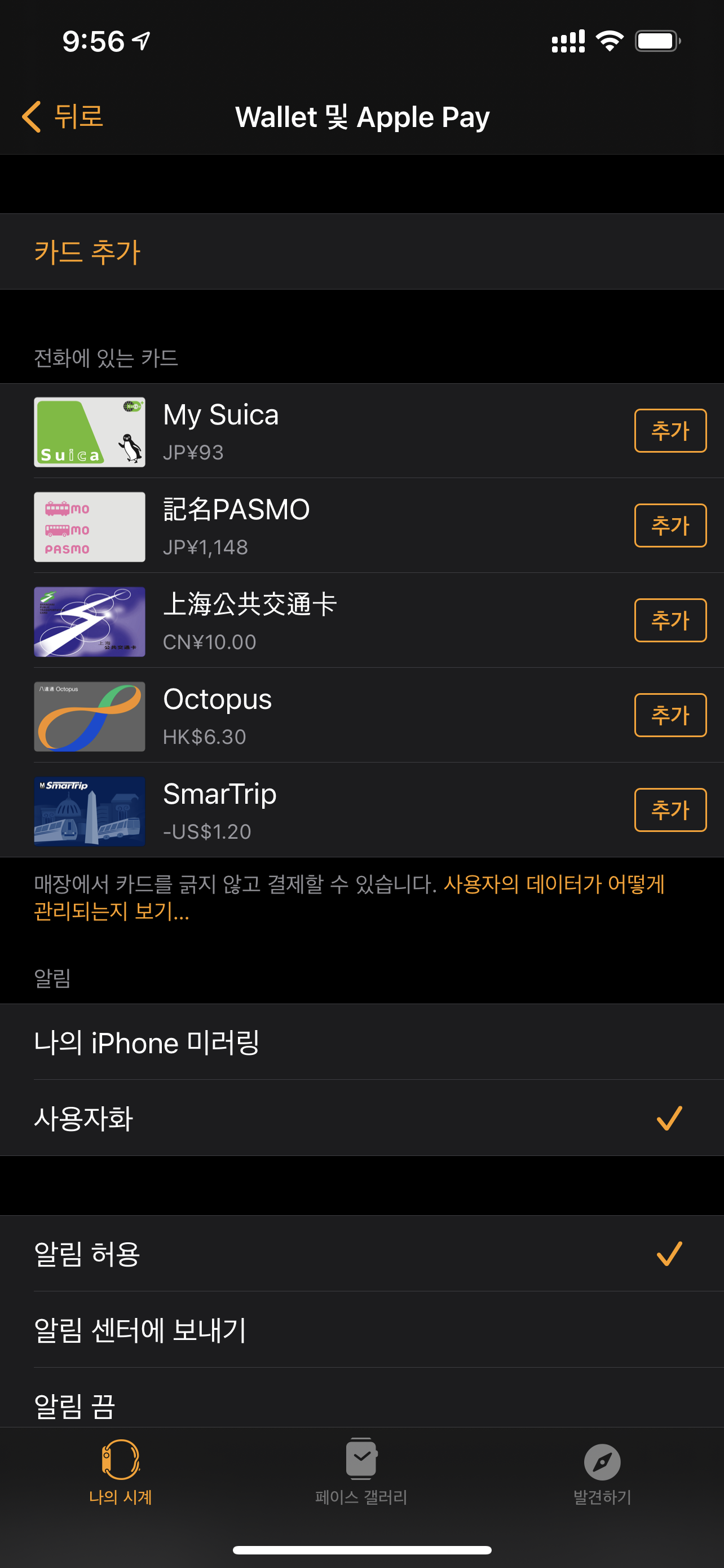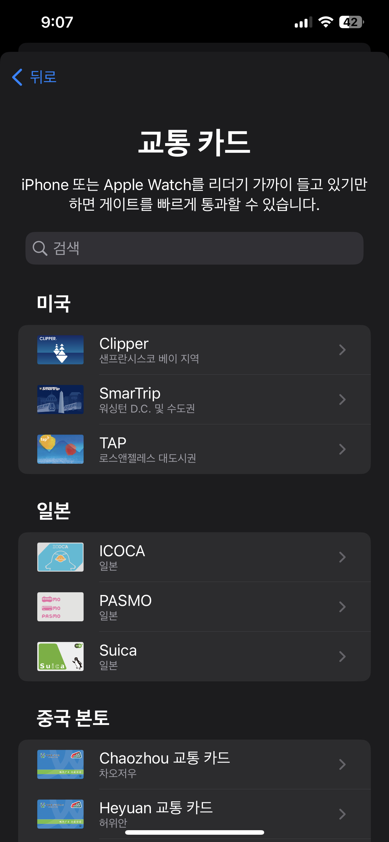 교통 카드를 누르면 일본은 물론 다른 나라에서 쓰는 애플페이 지원 교통카드 목록이 여럿 나오는데요.