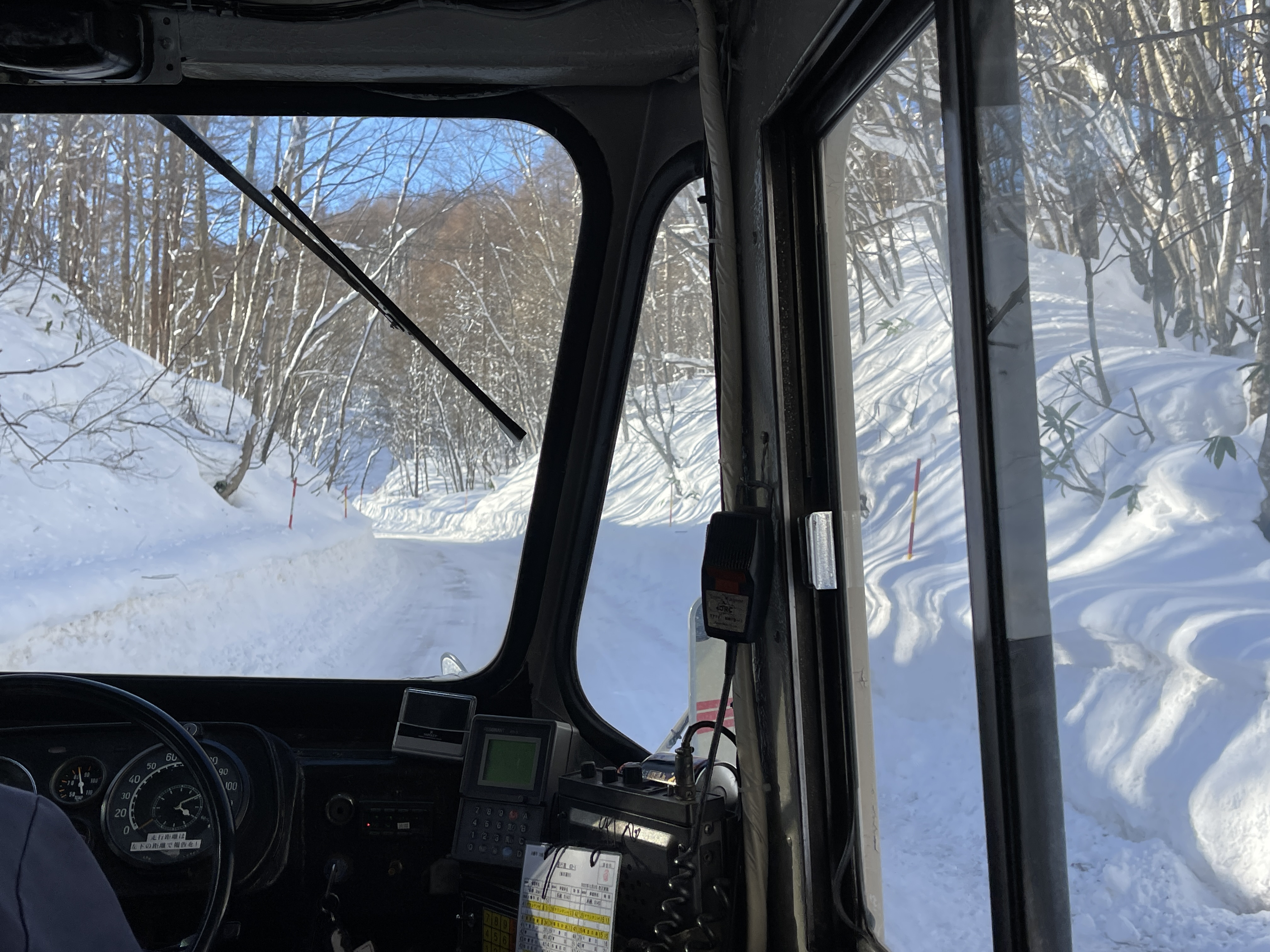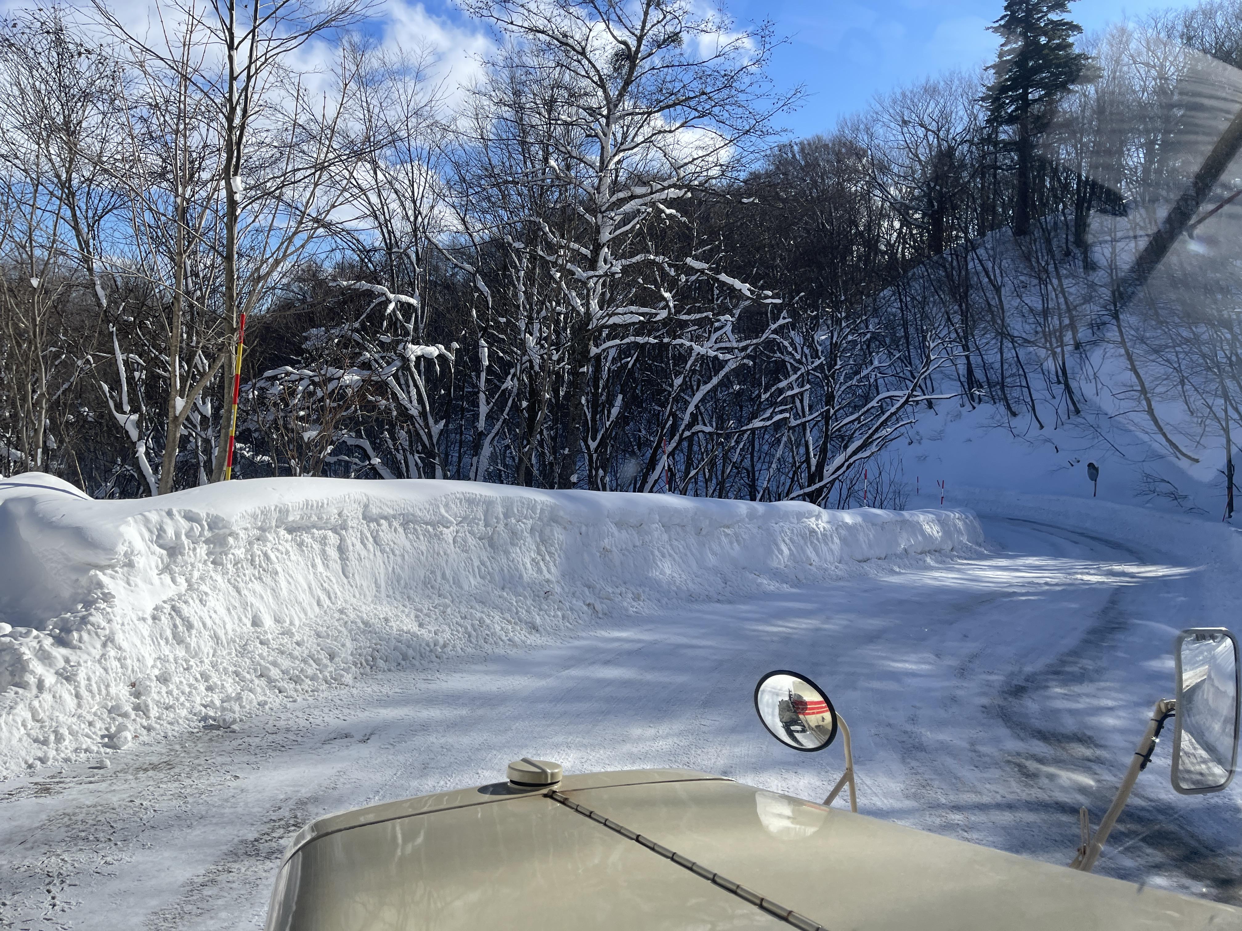 눈 덮인 산을 덜덜거리면서 천천히 올라가는 버스는