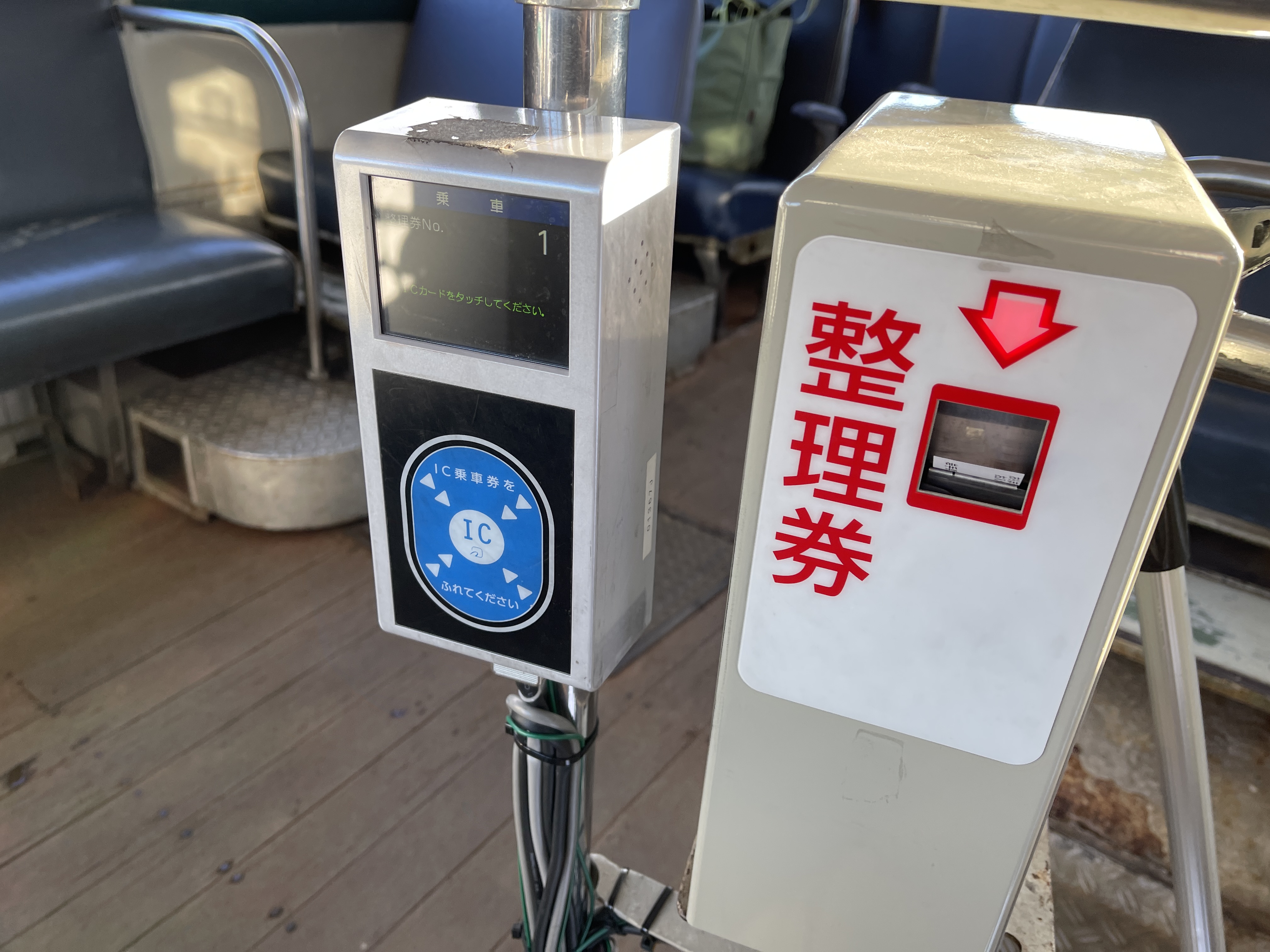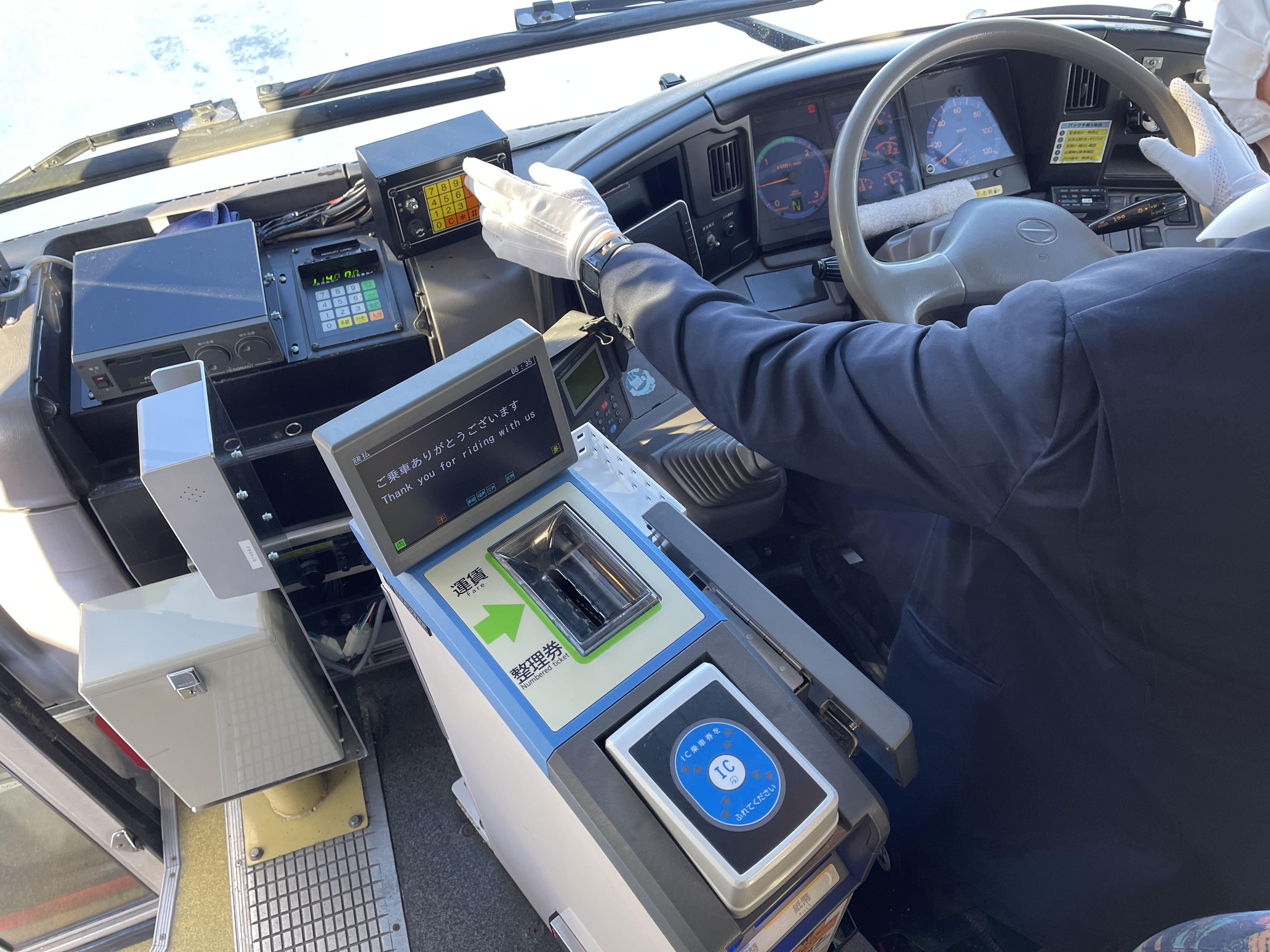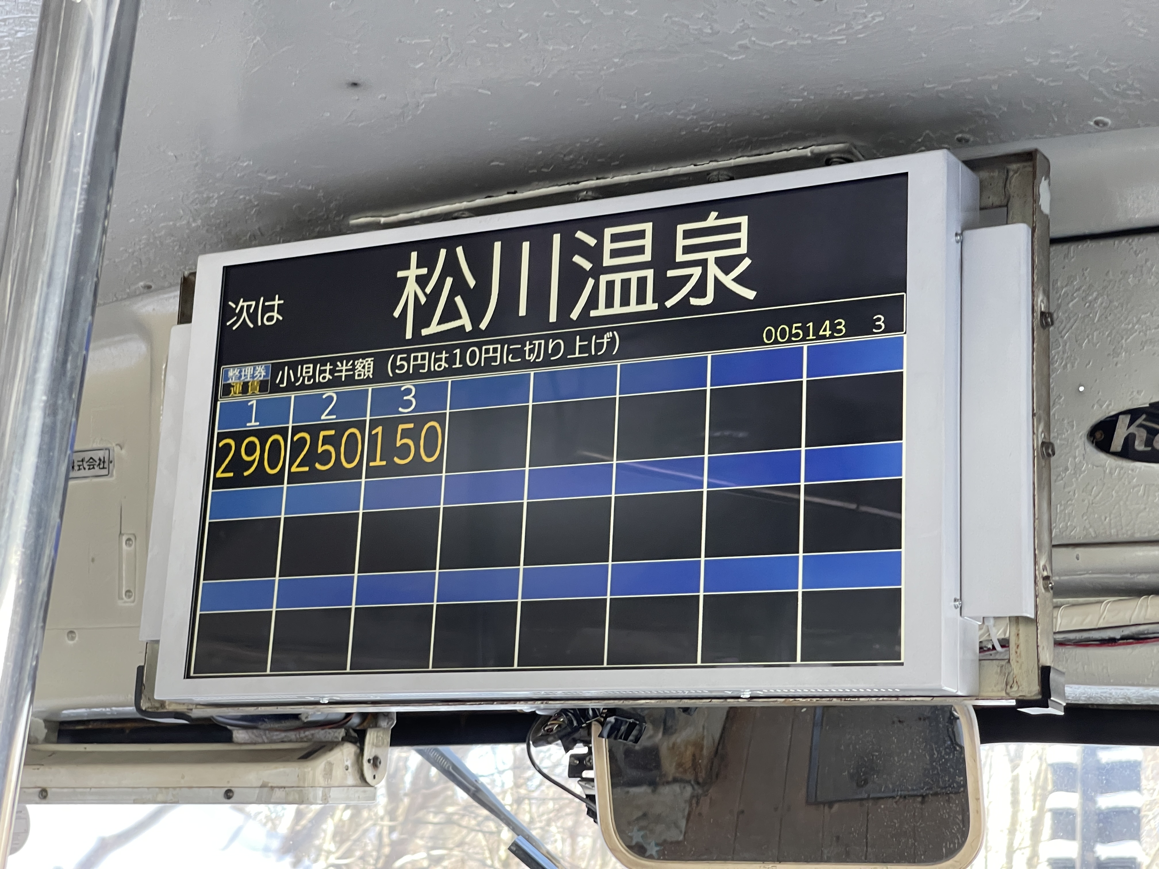 버스 기사가 단말기를 열심히 조작해서 지금 도착한 정류장을 마츠카와온천으로 바꿔 교통카드를 찍습니다.