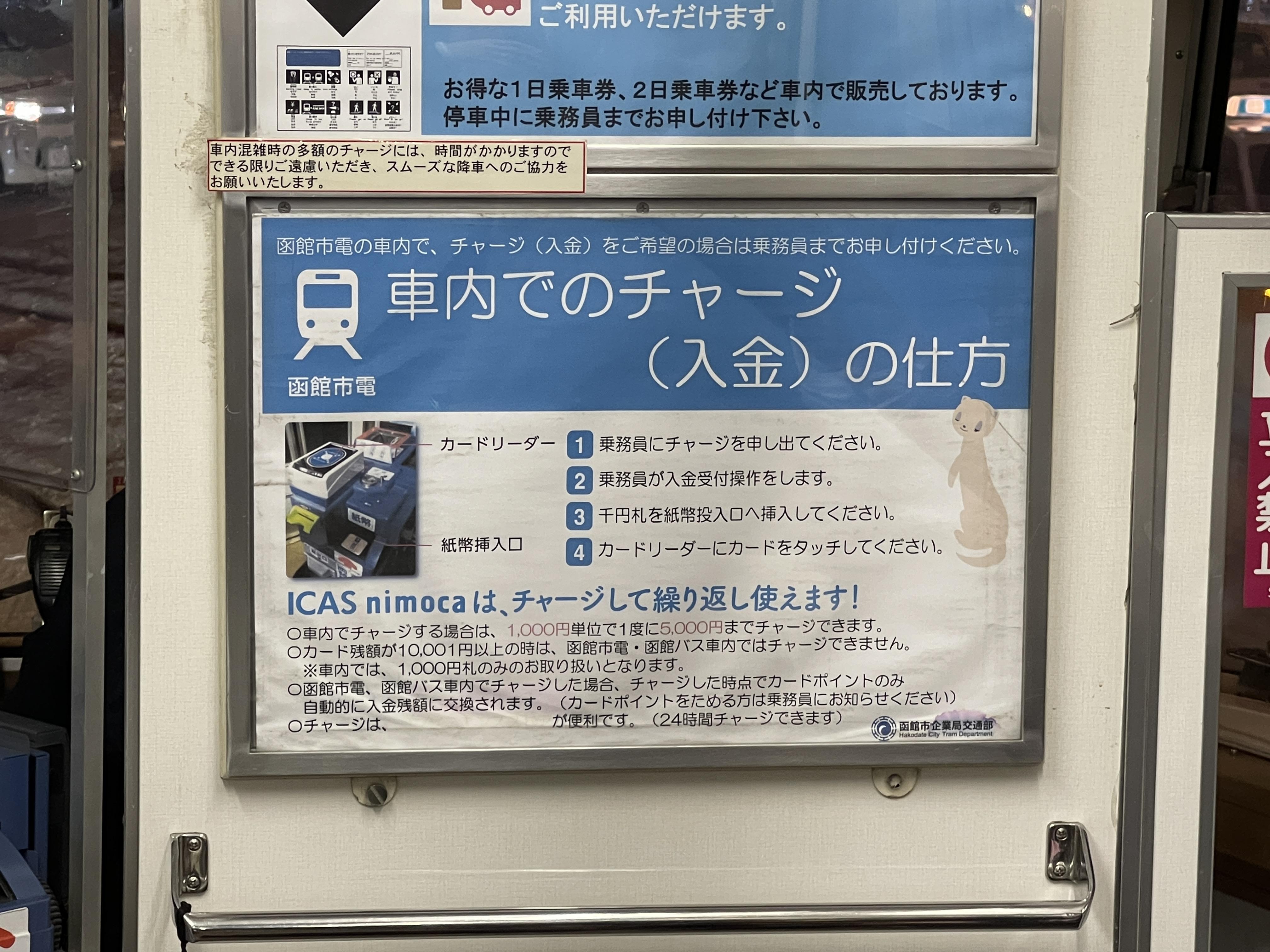 전차 안에 교통카드 충전 방법을 적은 안내문이 보입니다.