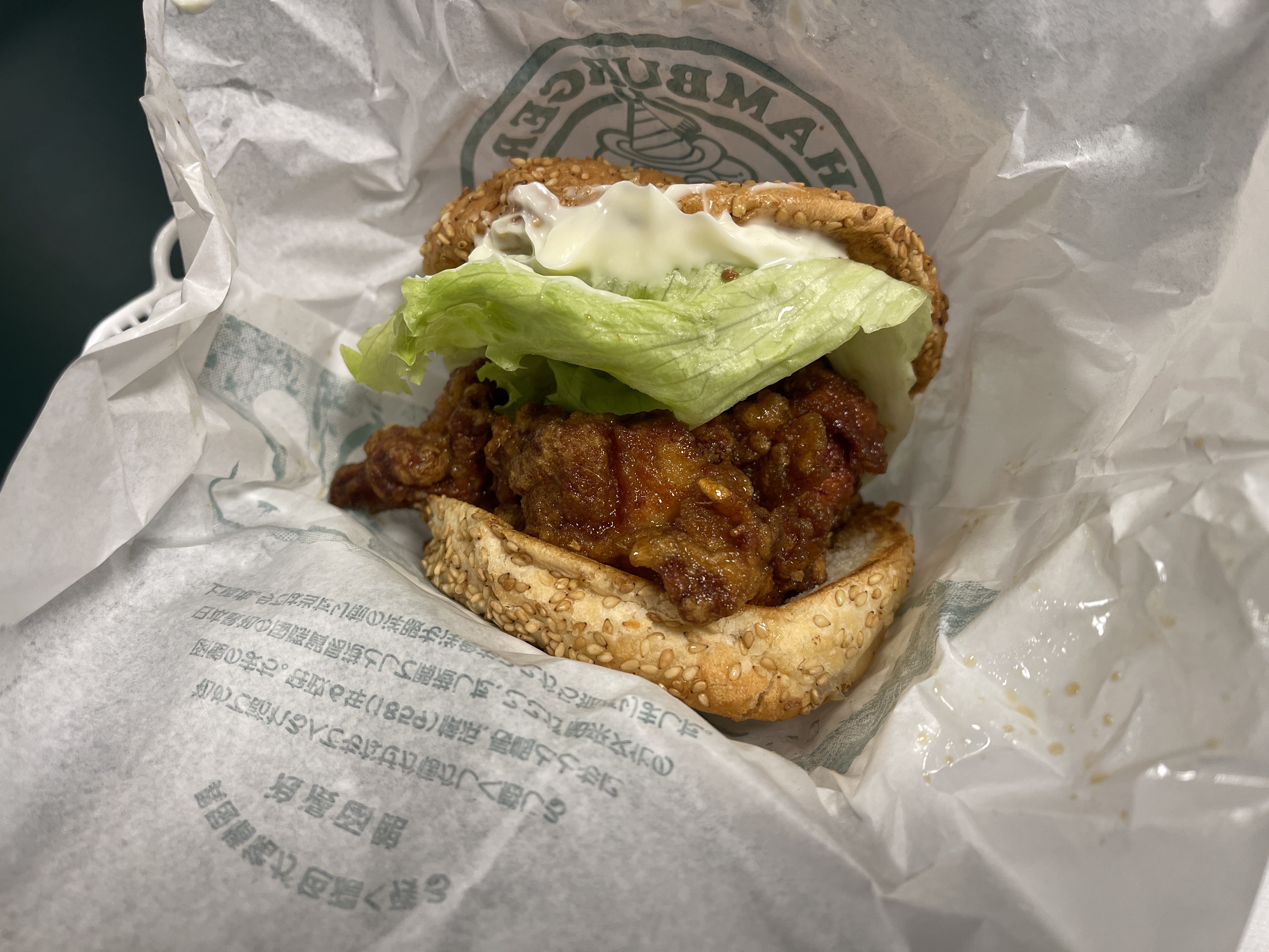 여기는 특이하게도 조각낸 닭을 튀기고 간장 소스에 버무린 치킨을 패티처럼 쓰고 있습니다.