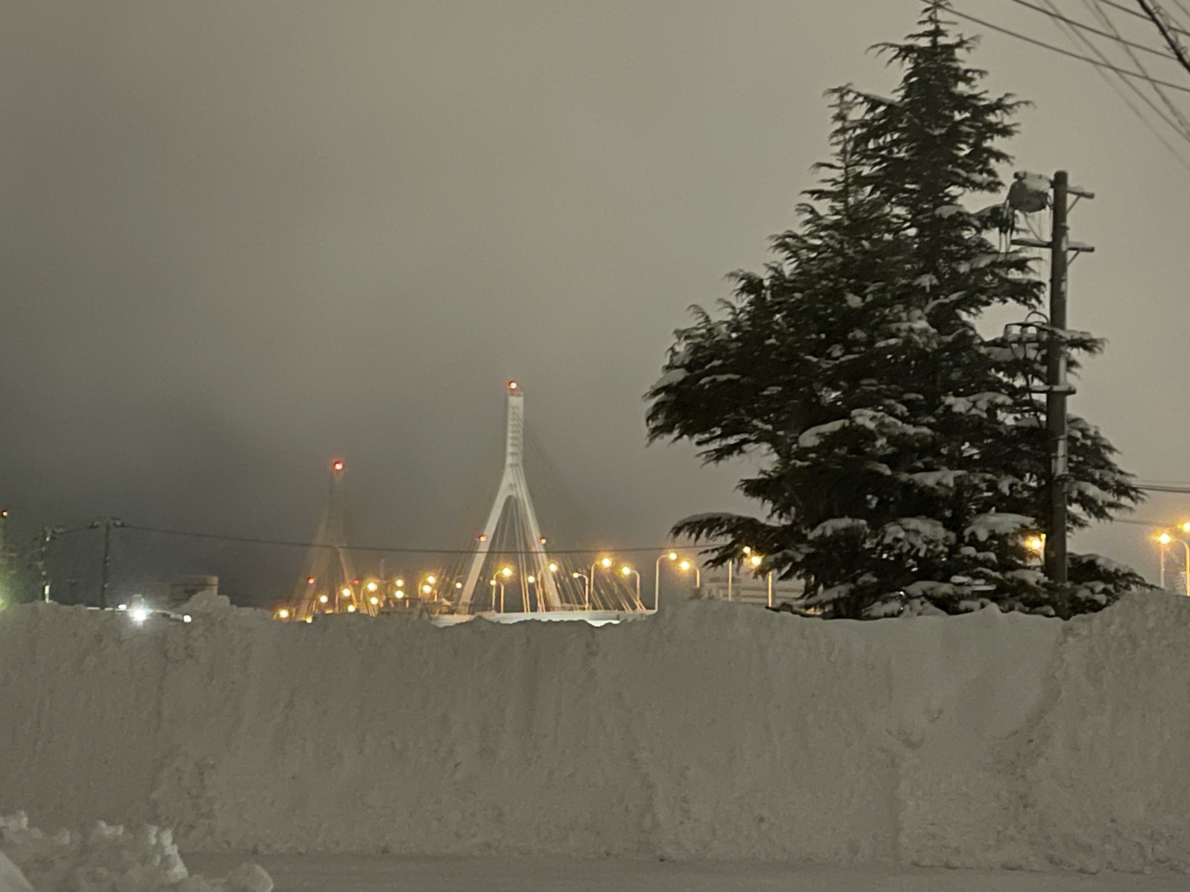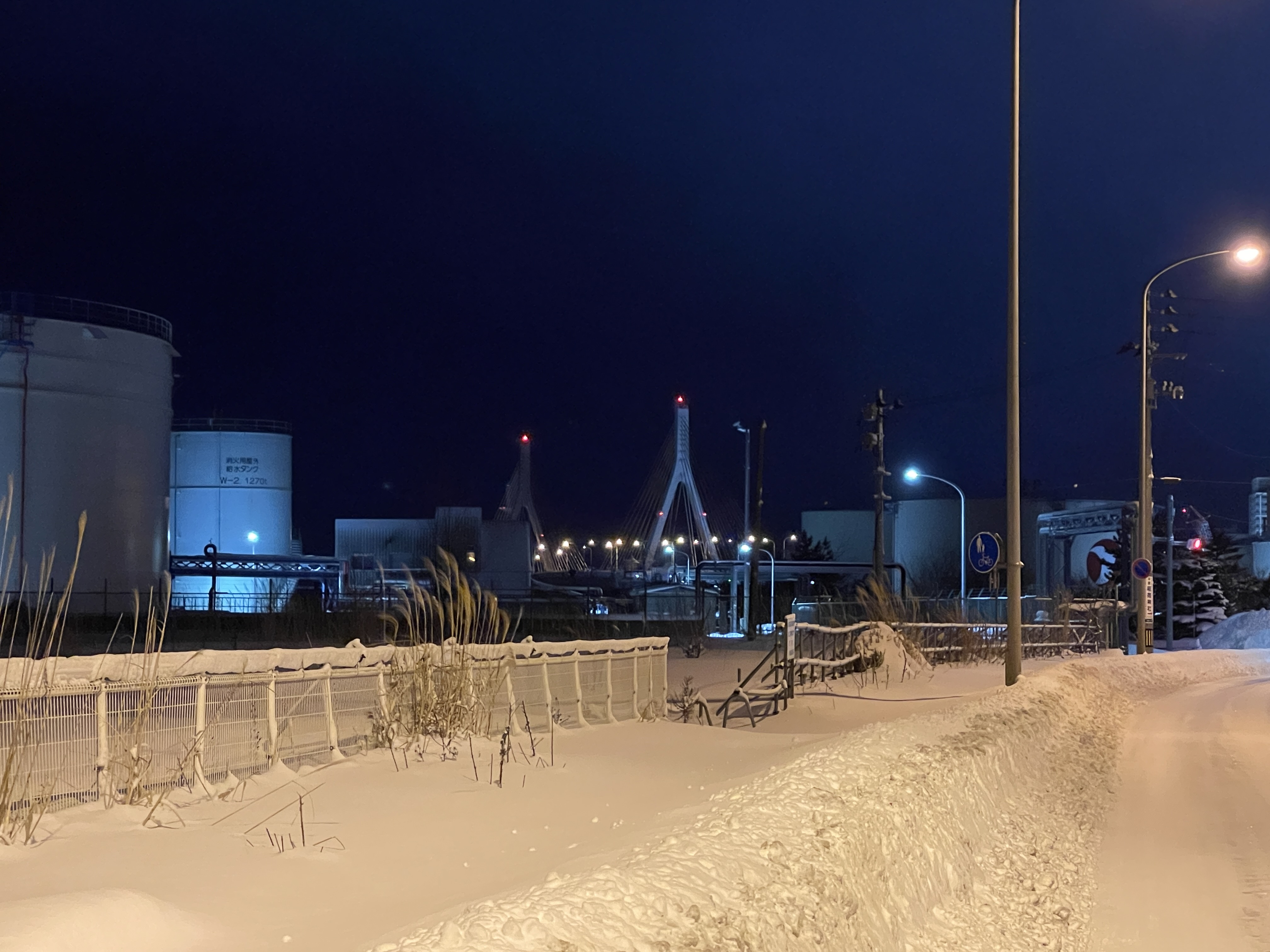 저유소 사이로 보이는 아오모리 베이브리지를 등댓불 삼아 걸어