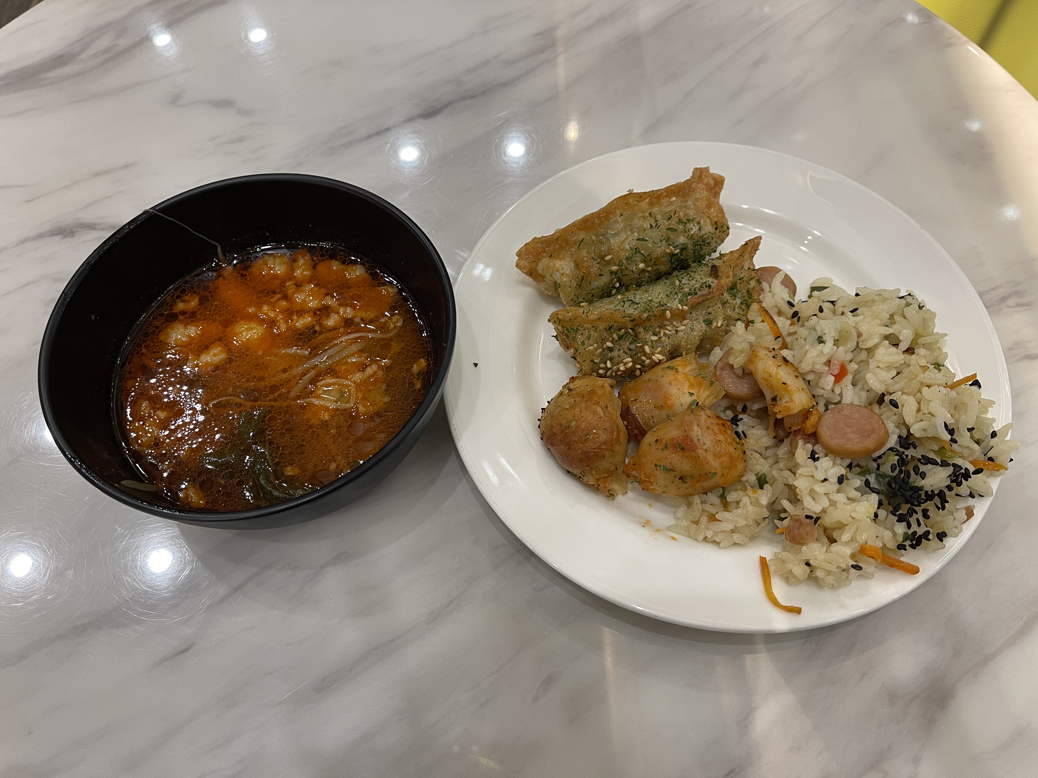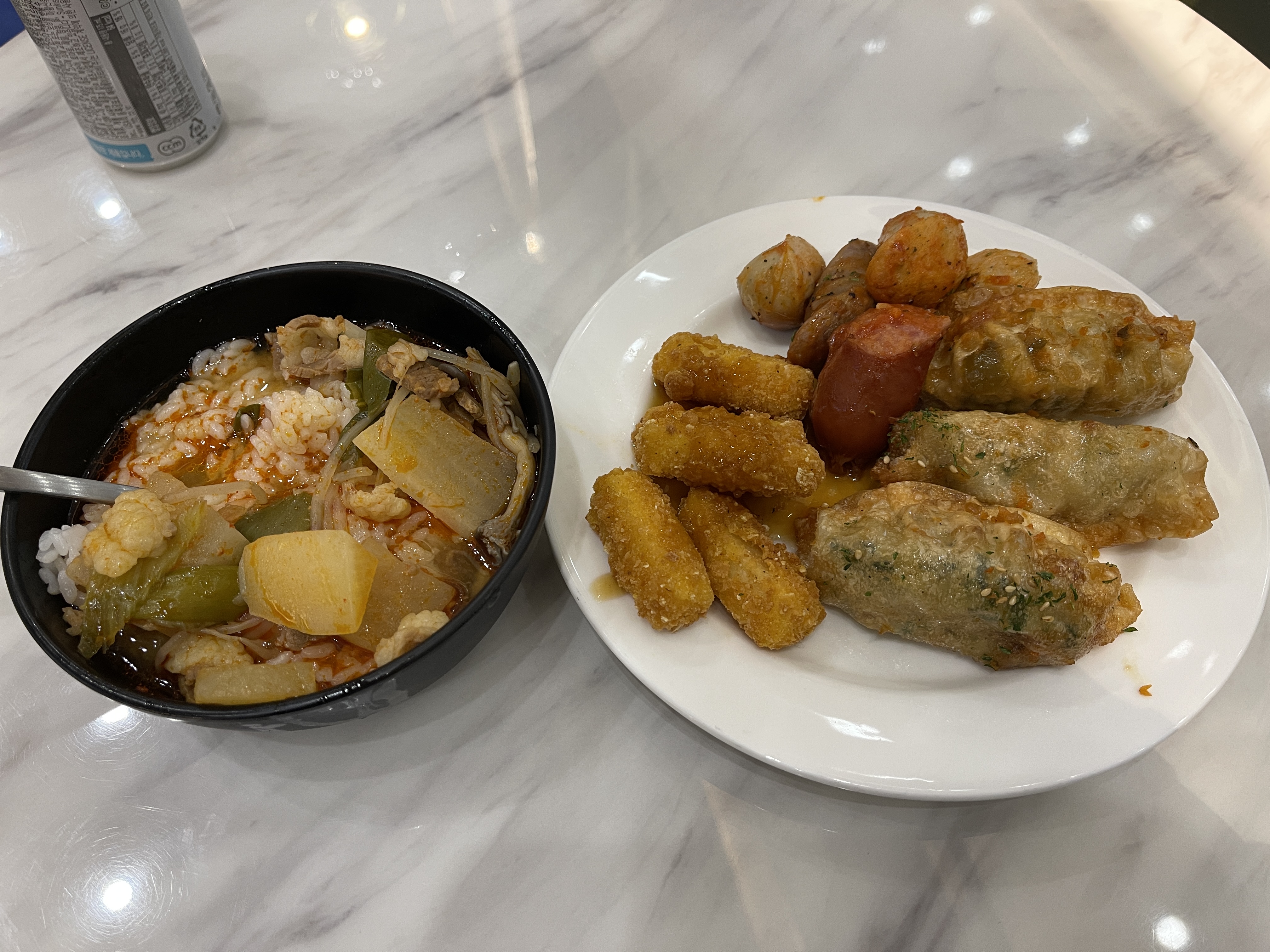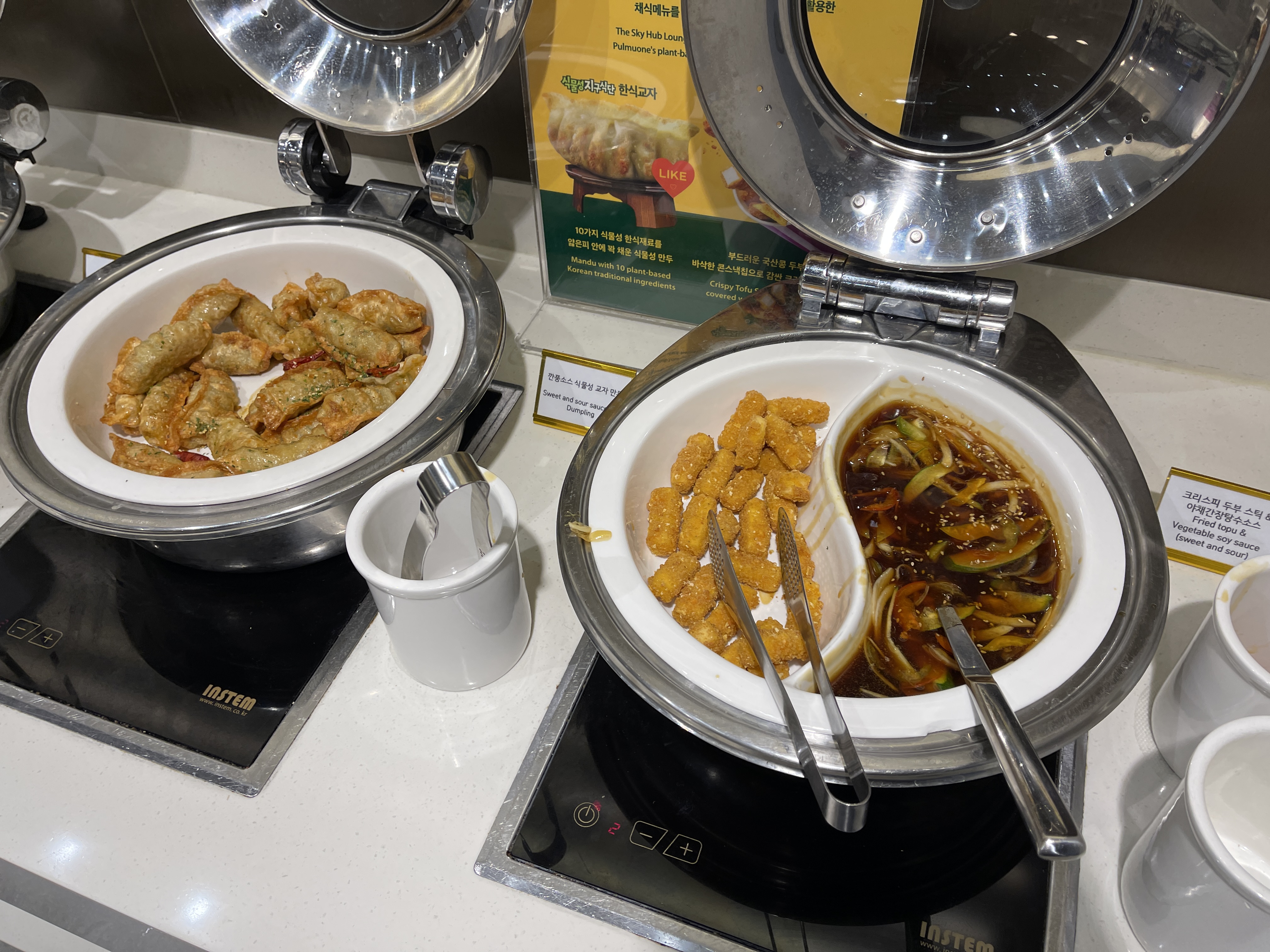 채식메뉴라며 제공하는 식물성 고기 만두와 두부 스틱이 의외로 맛있어서 계속 퍼오다 보니